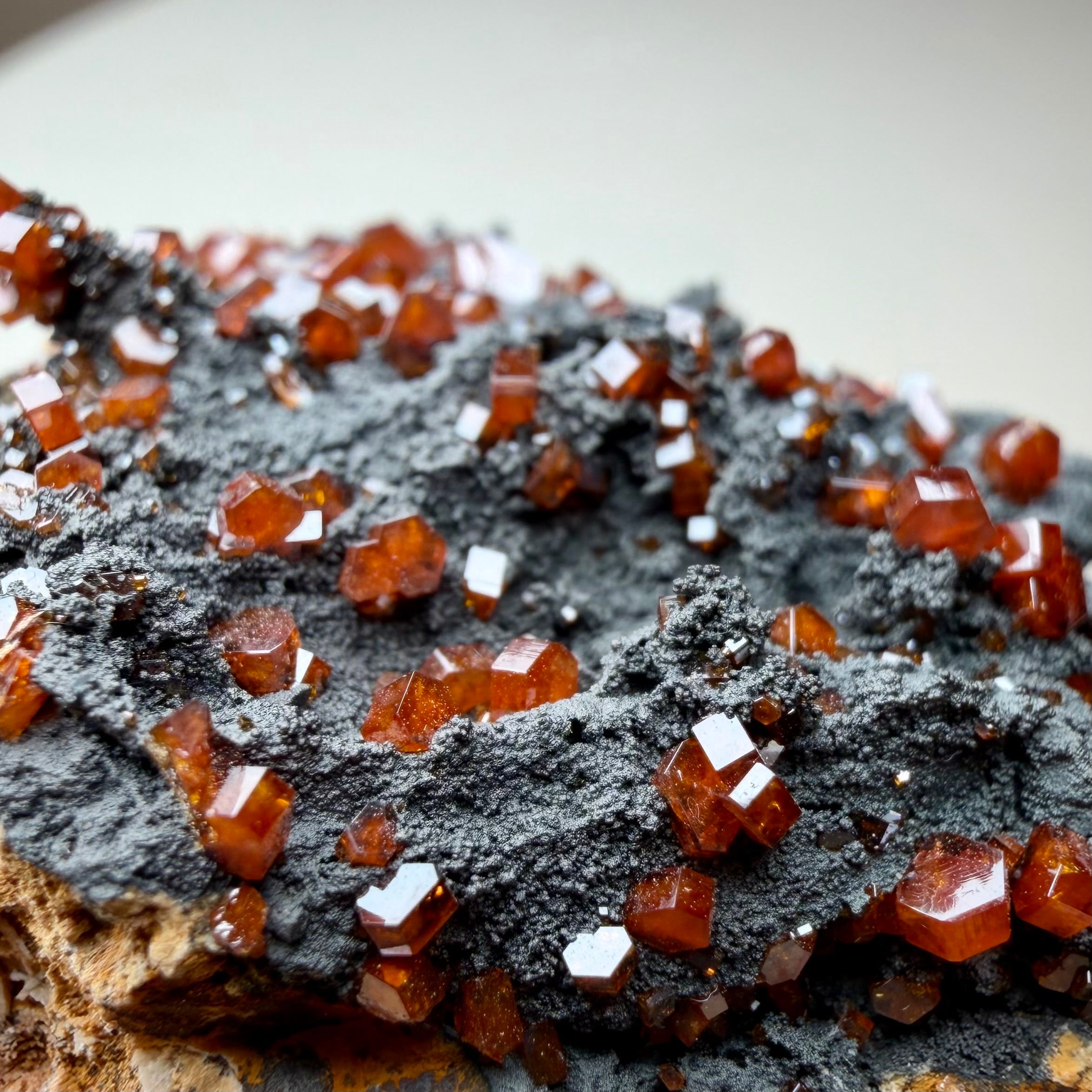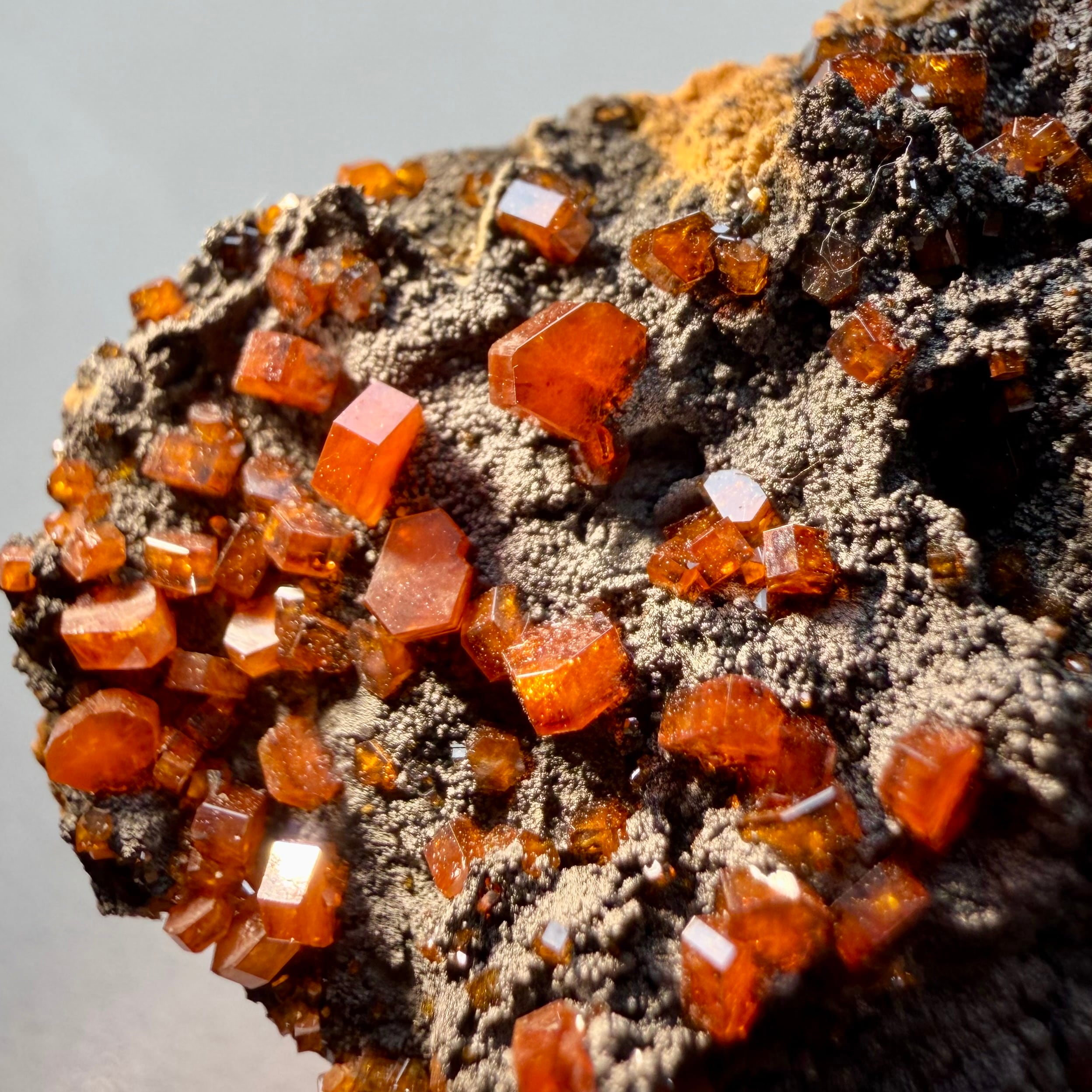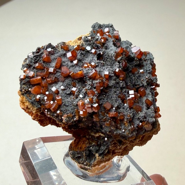 鮮やかなオレンジのバナジナイトと黒い母岩との対比が美しい標本で、小粒な結晶ですが標本全体に広がります。