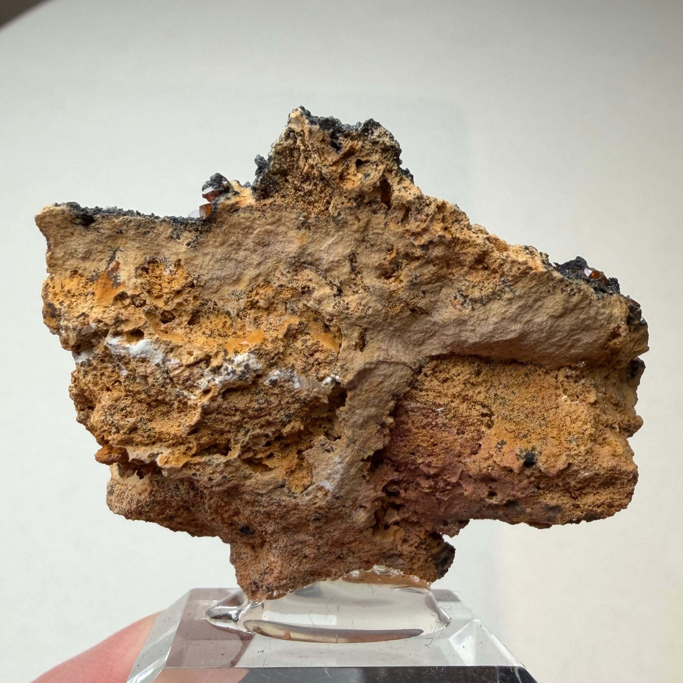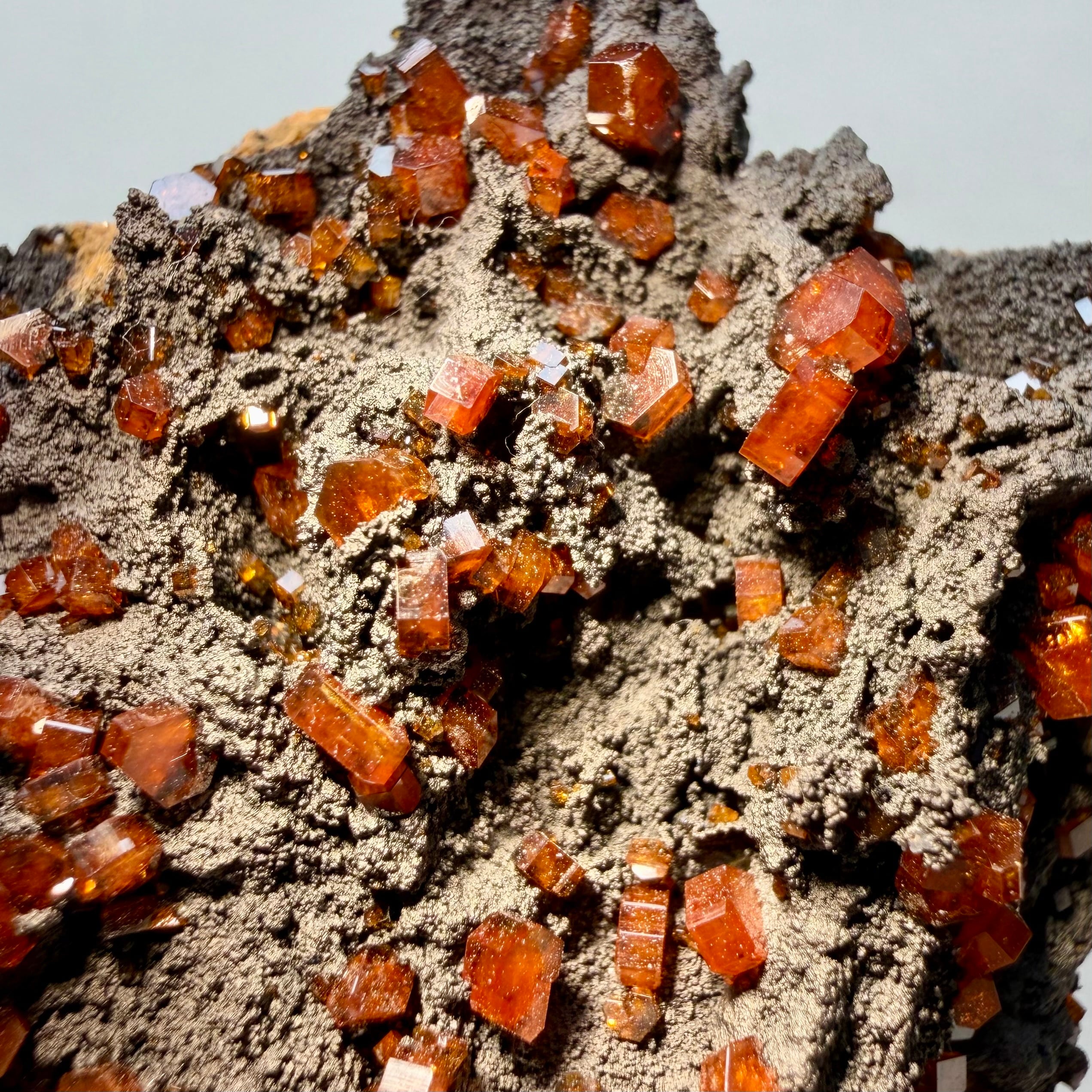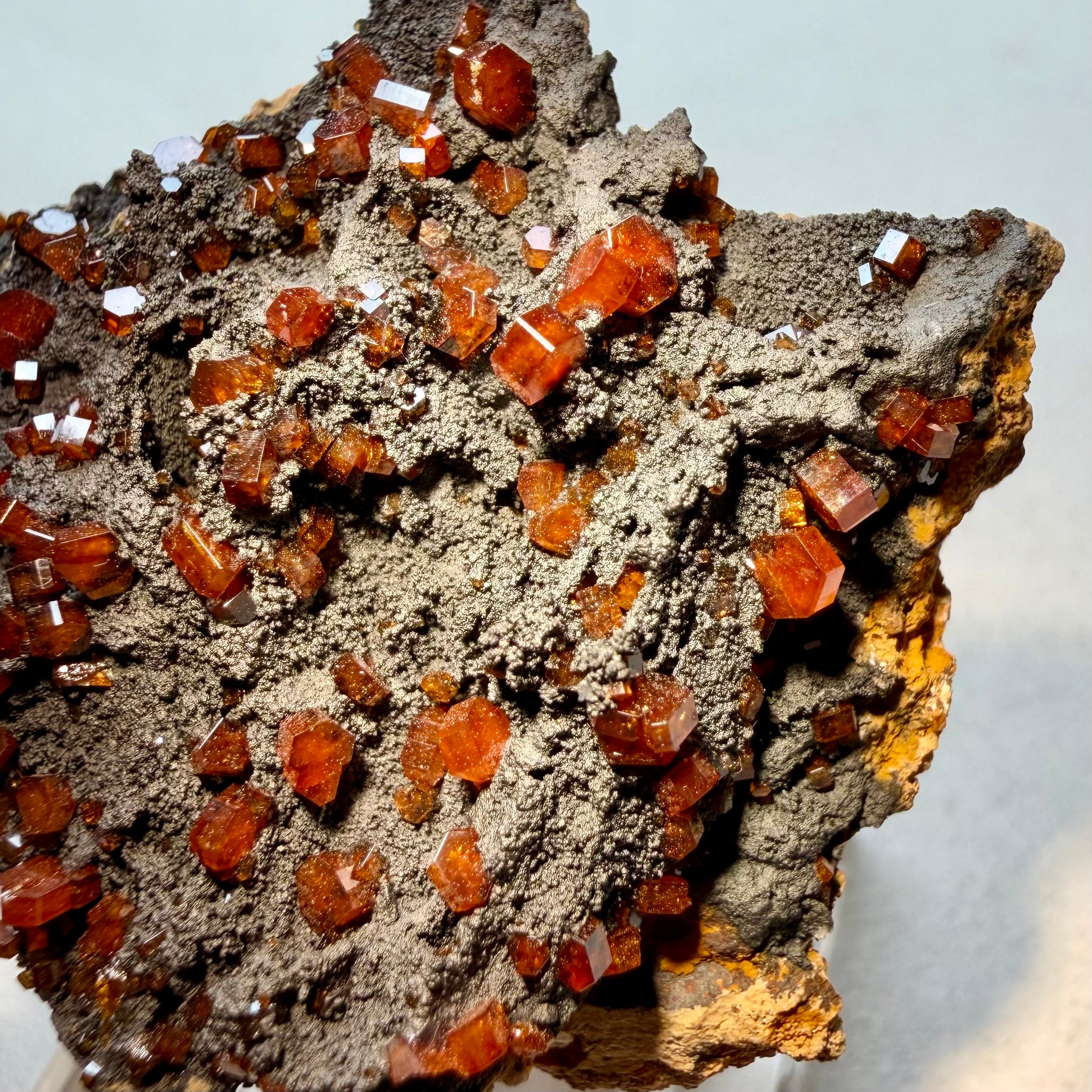 鮮やかなオレンジのバナジナイトと黒い母岩との対比が美しい標本で、小粒な結晶ですが標本全体に広がります。