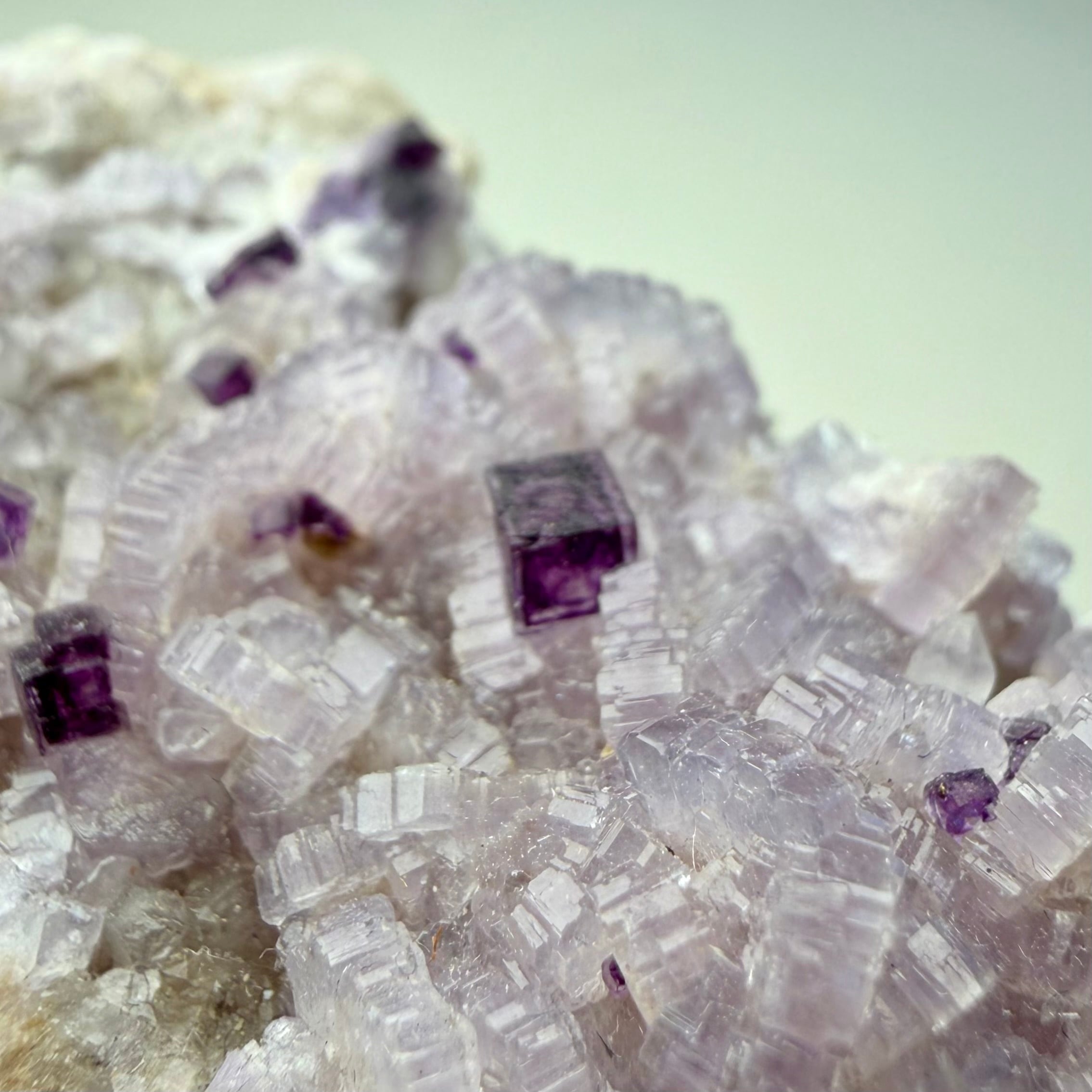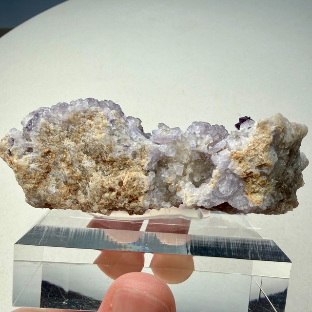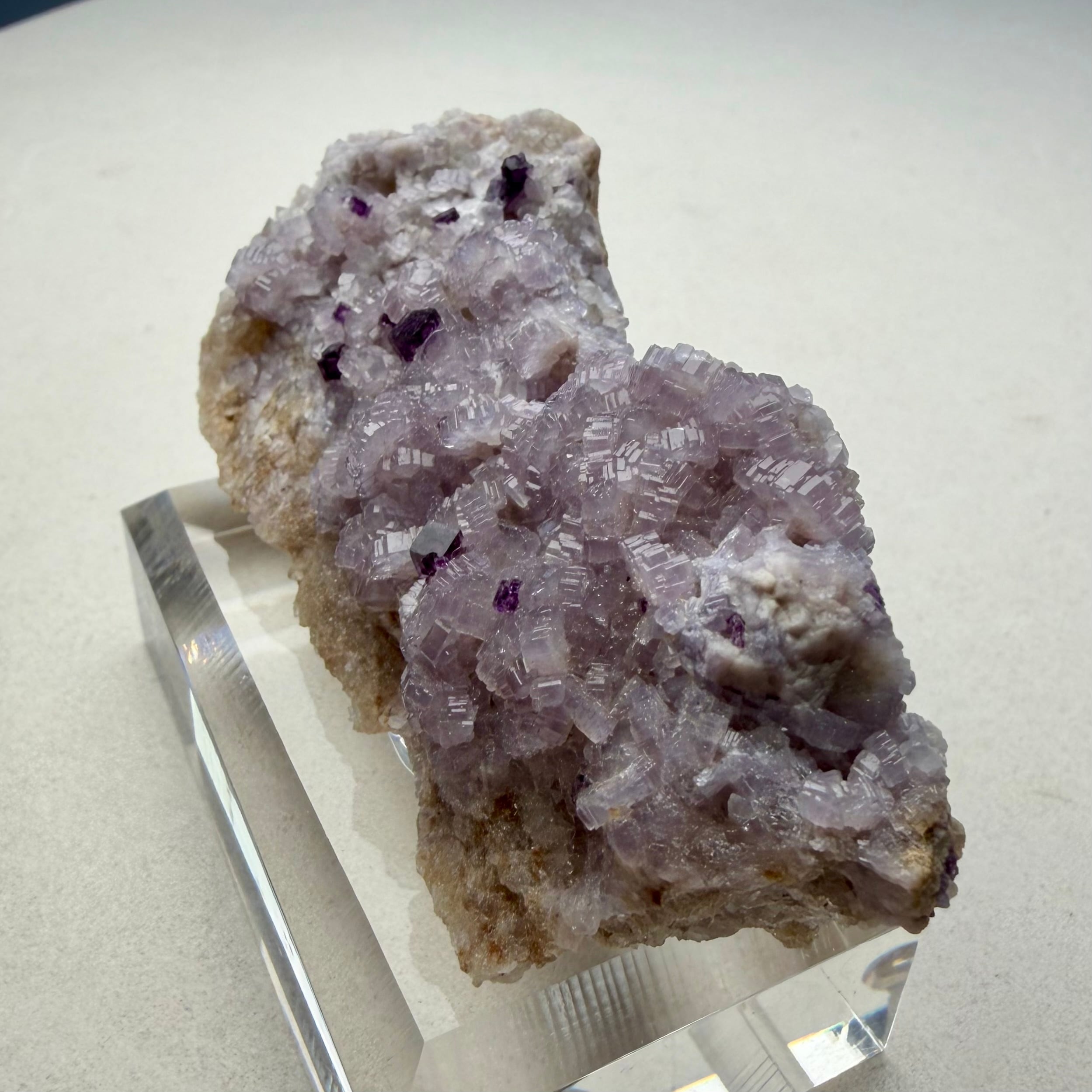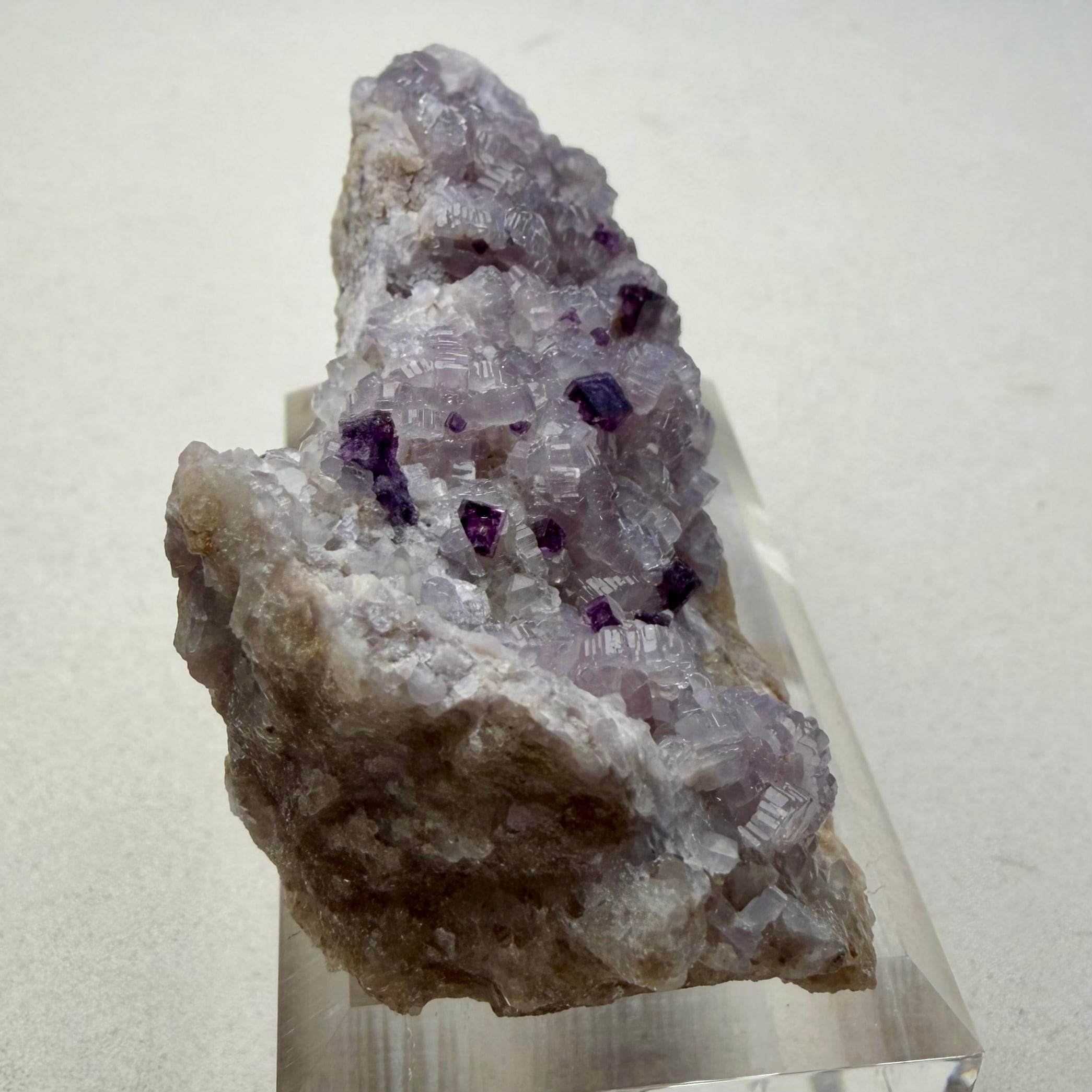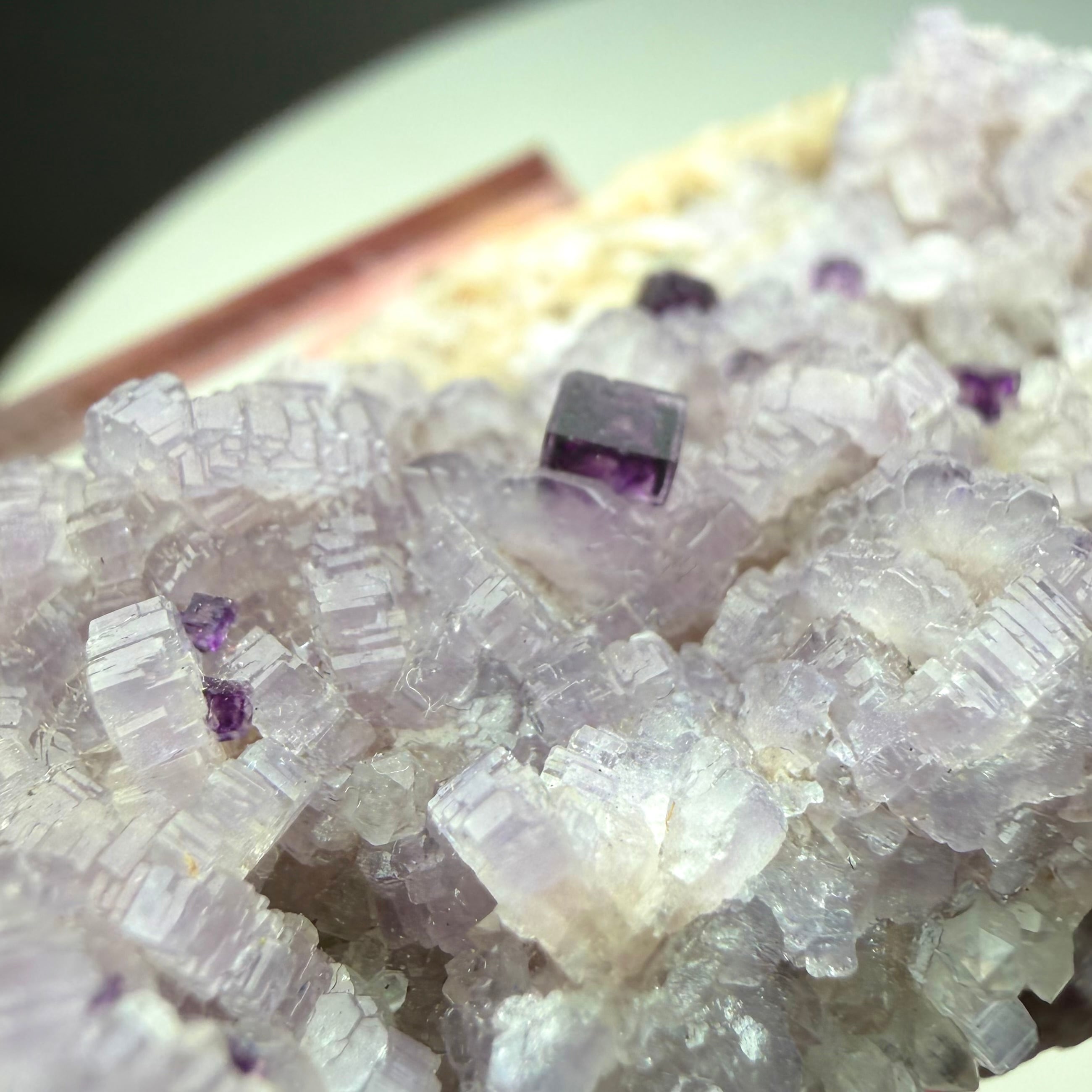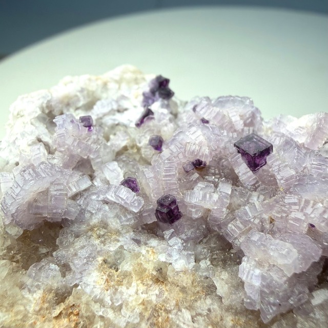 バイオレットカラーのアパタイト上に小さなフローライトが複数結晶しています、ドイツ産の標本としてこのコンビネーションは珍しいのではないでしょうか。