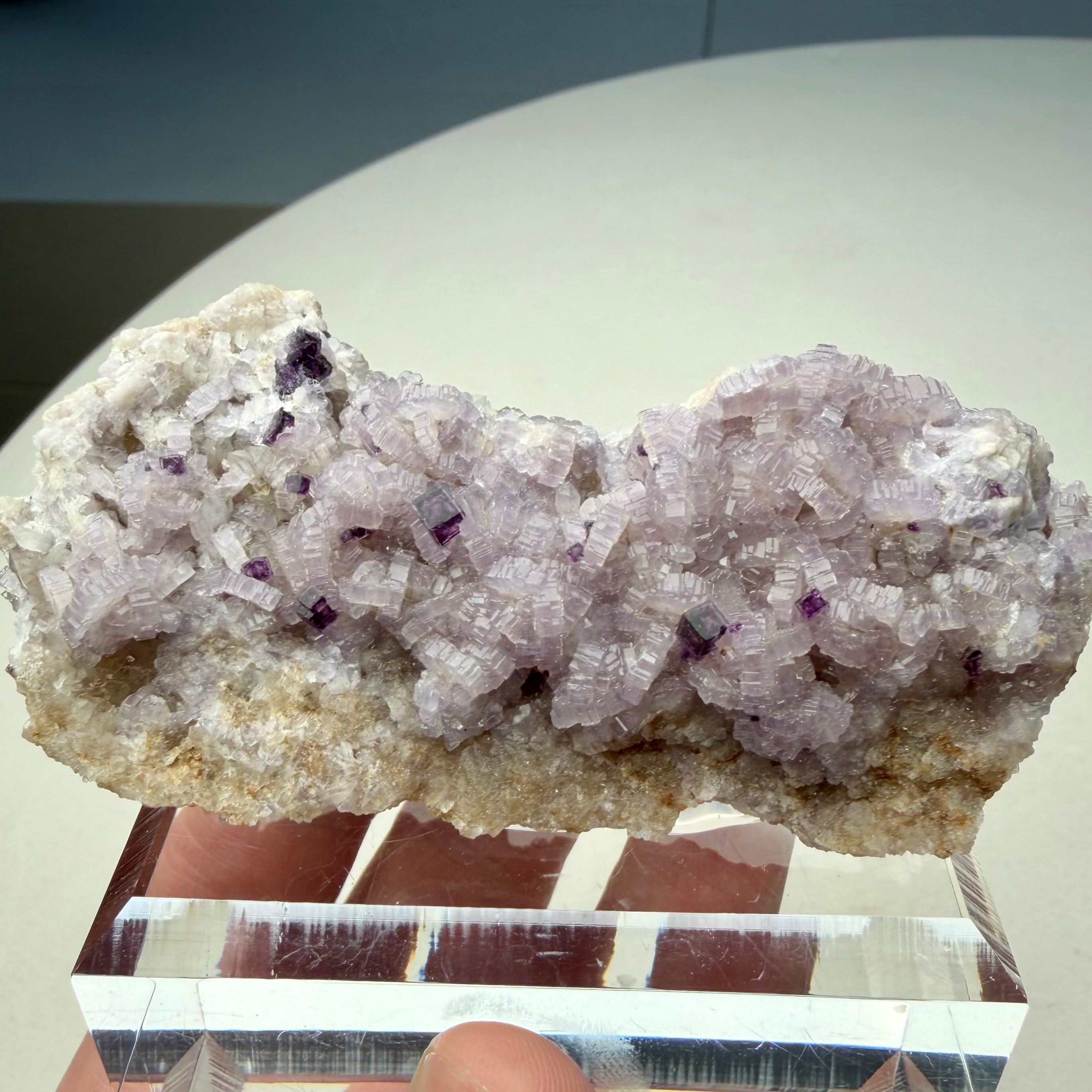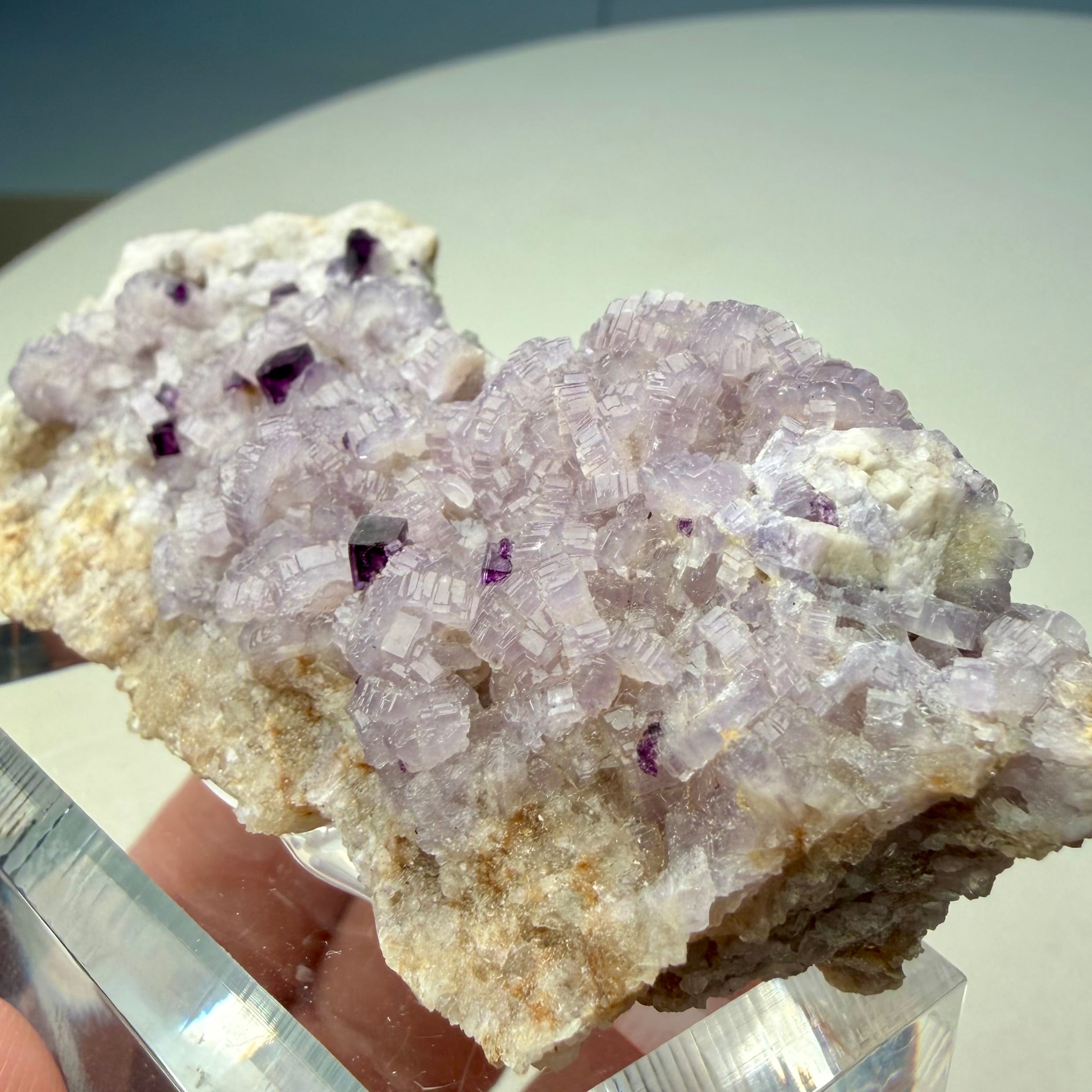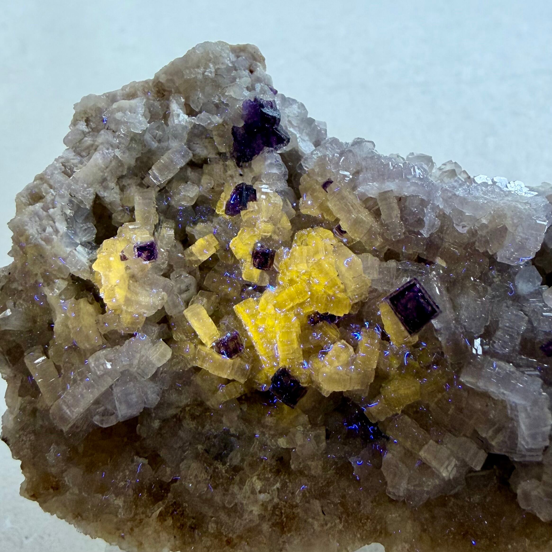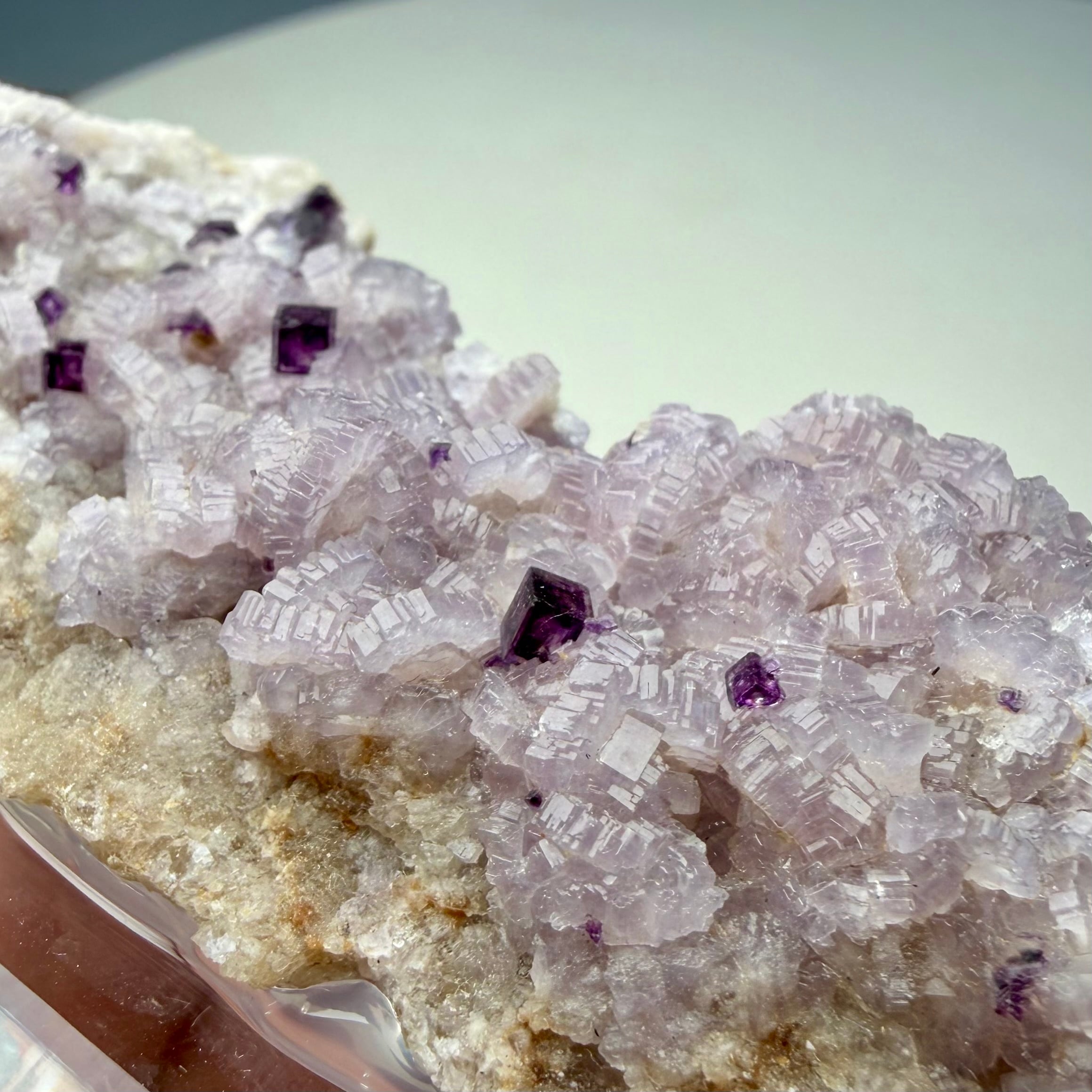 バイオレットカラーのアパタイト上に小さなフローライトが複数結晶しています、ドイツ産の標本としてこのコンビネーションは珍しいのではないでしょうか。