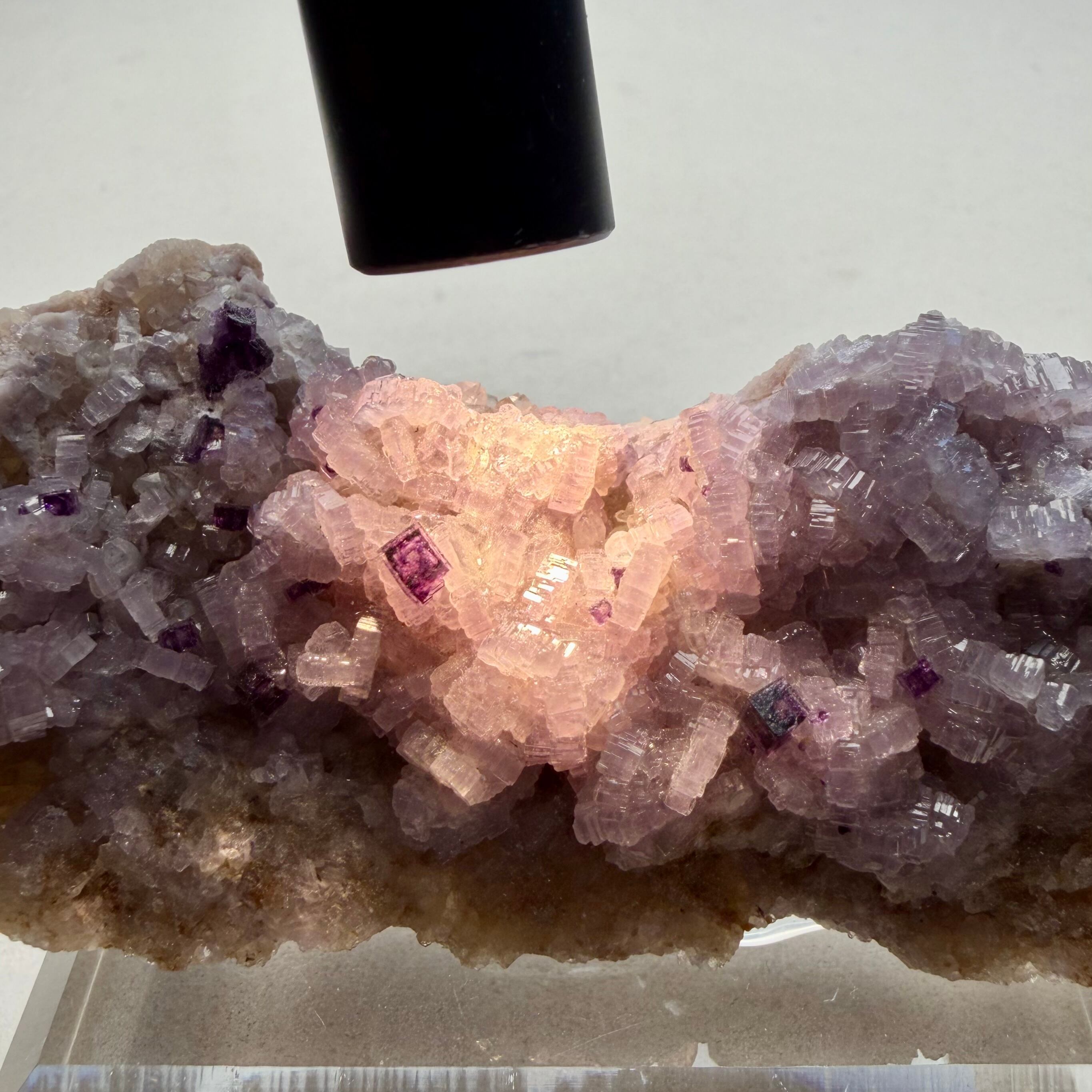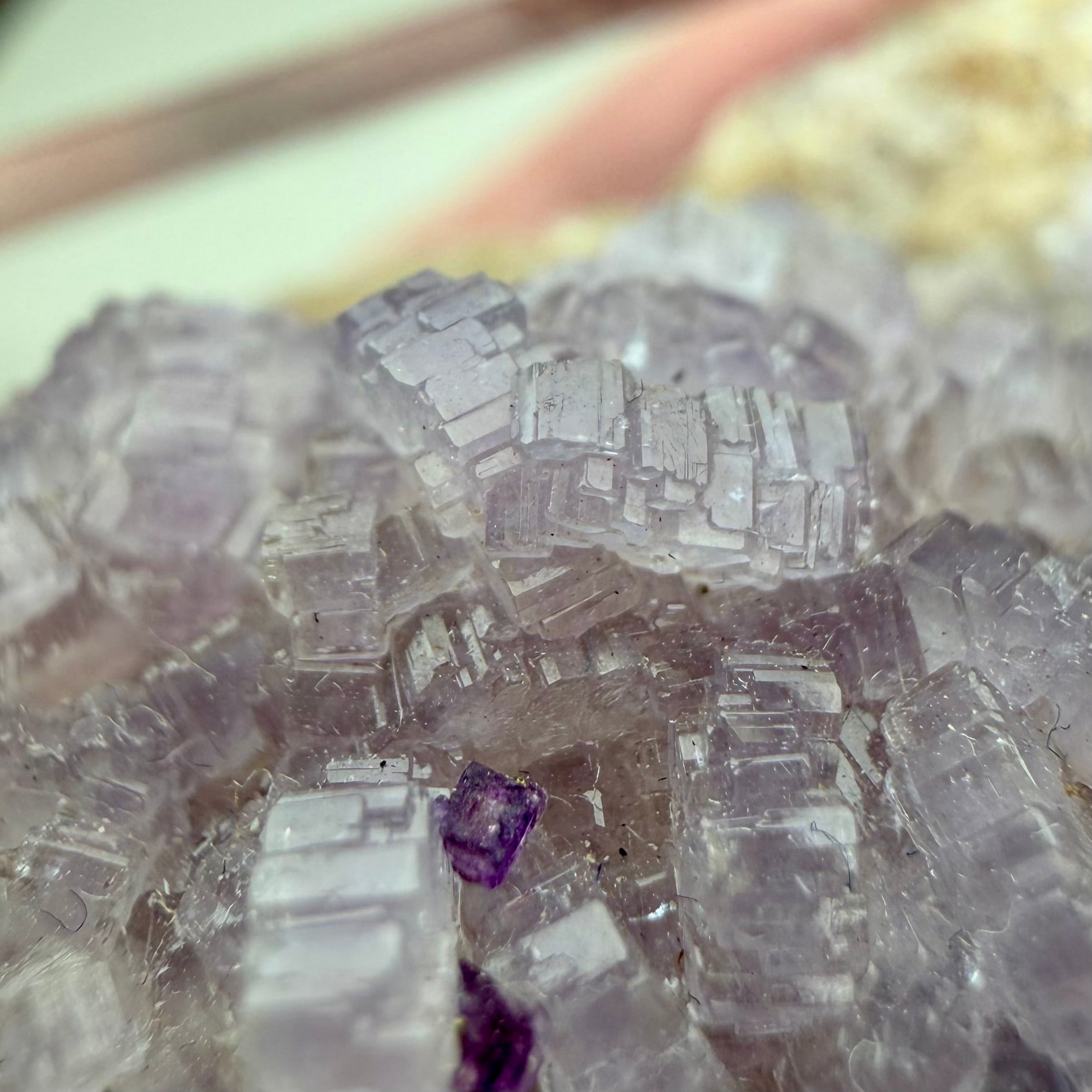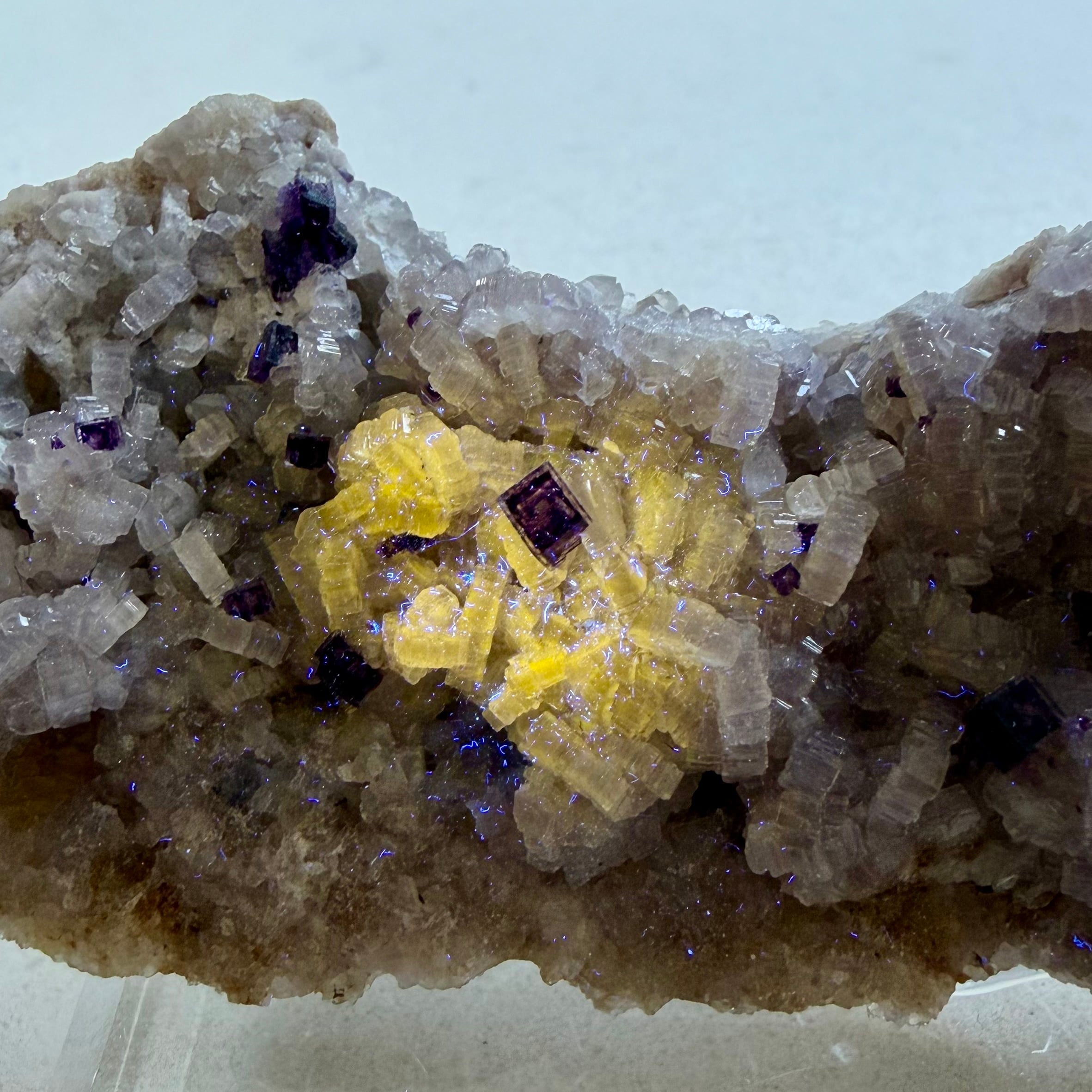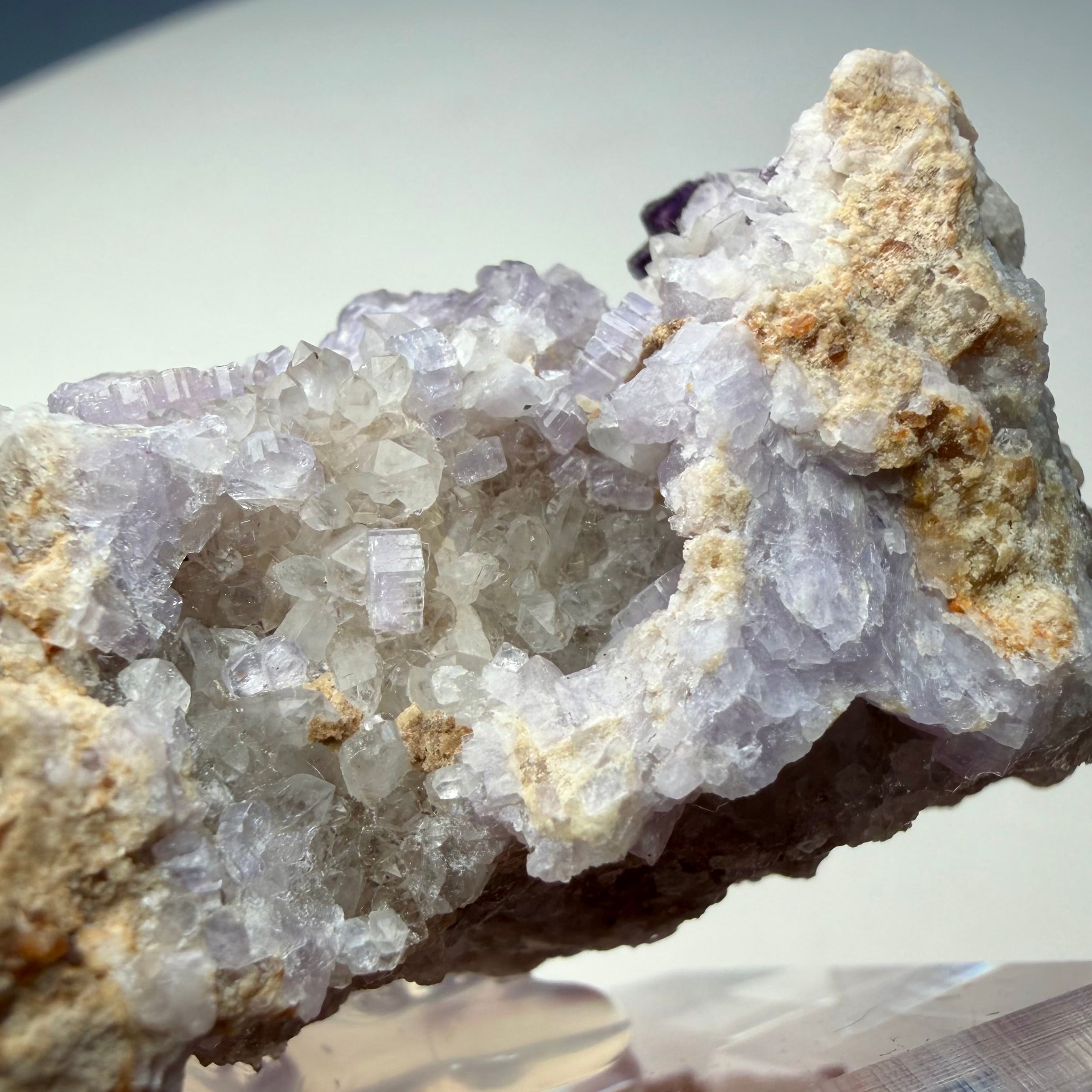 バイオレットカラーのアパタイト上に小さなフローライトが複数結晶しています、ドイツ産の標本としてこのコンビネーションは珍しいのではないでしょうか。