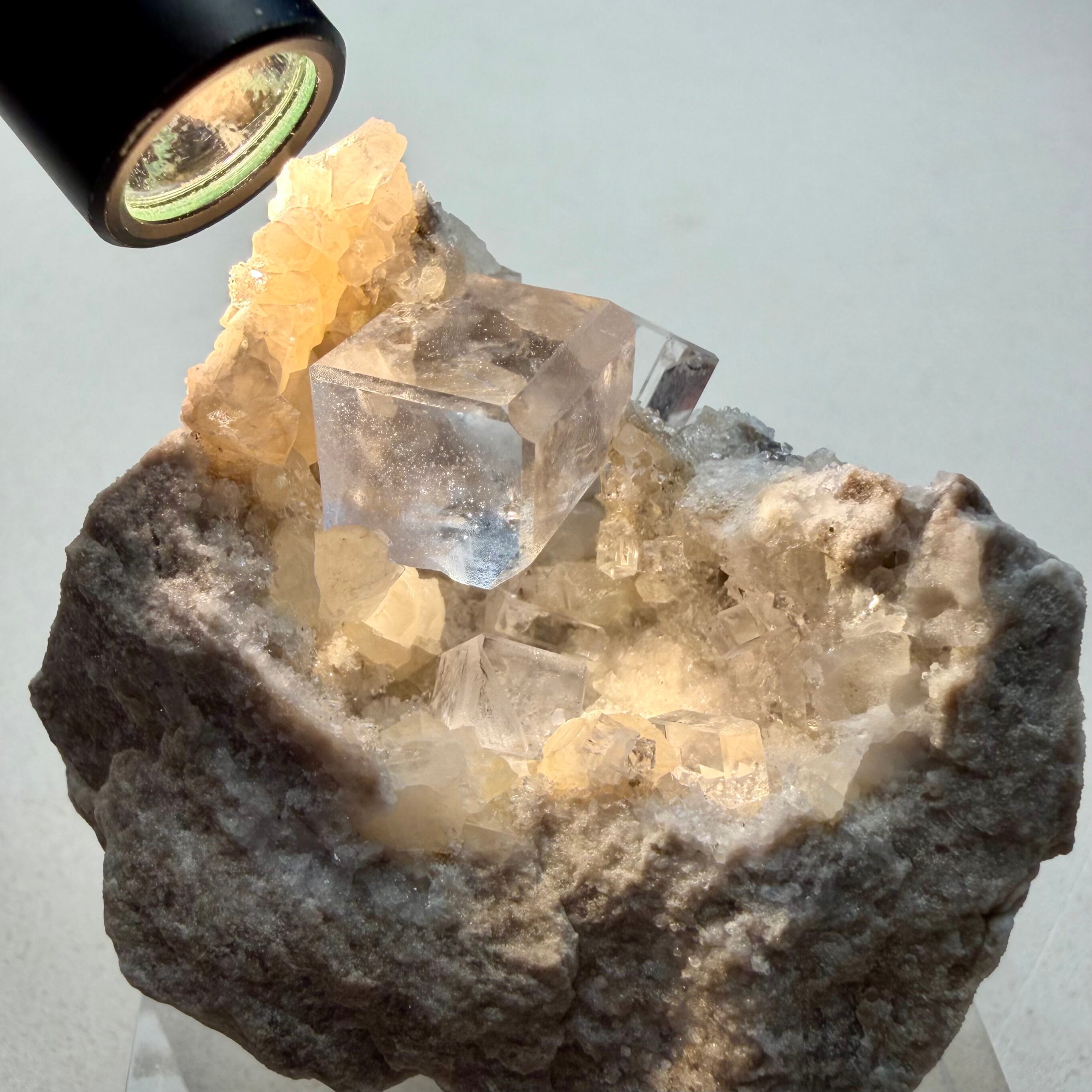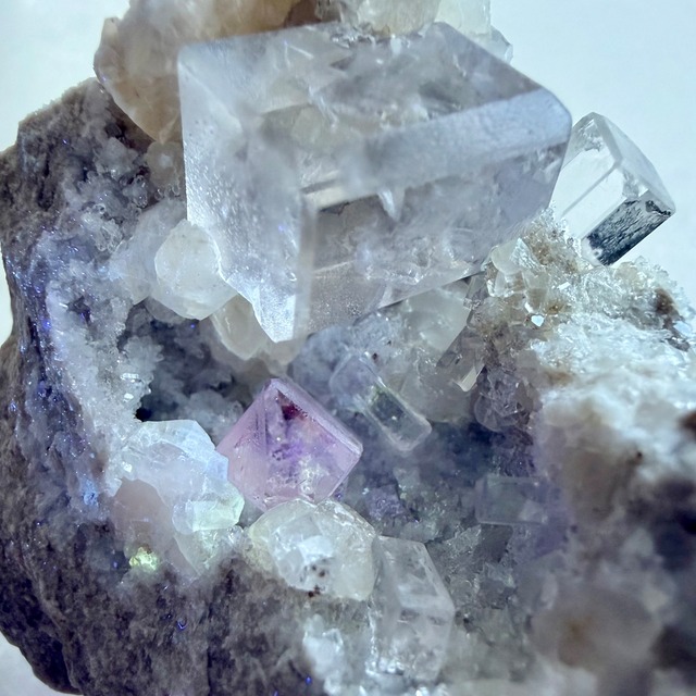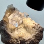 メイン結晶は特にクリアで目立つダメージも無い良結晶、サイドの小さいフローライトの一部に紫外線光下で赤い蛍光が見られます。