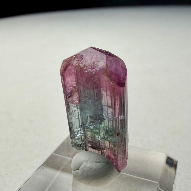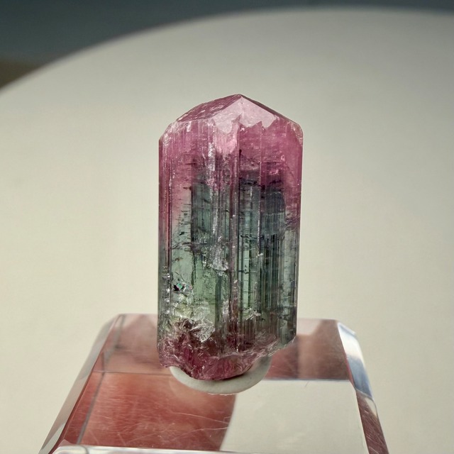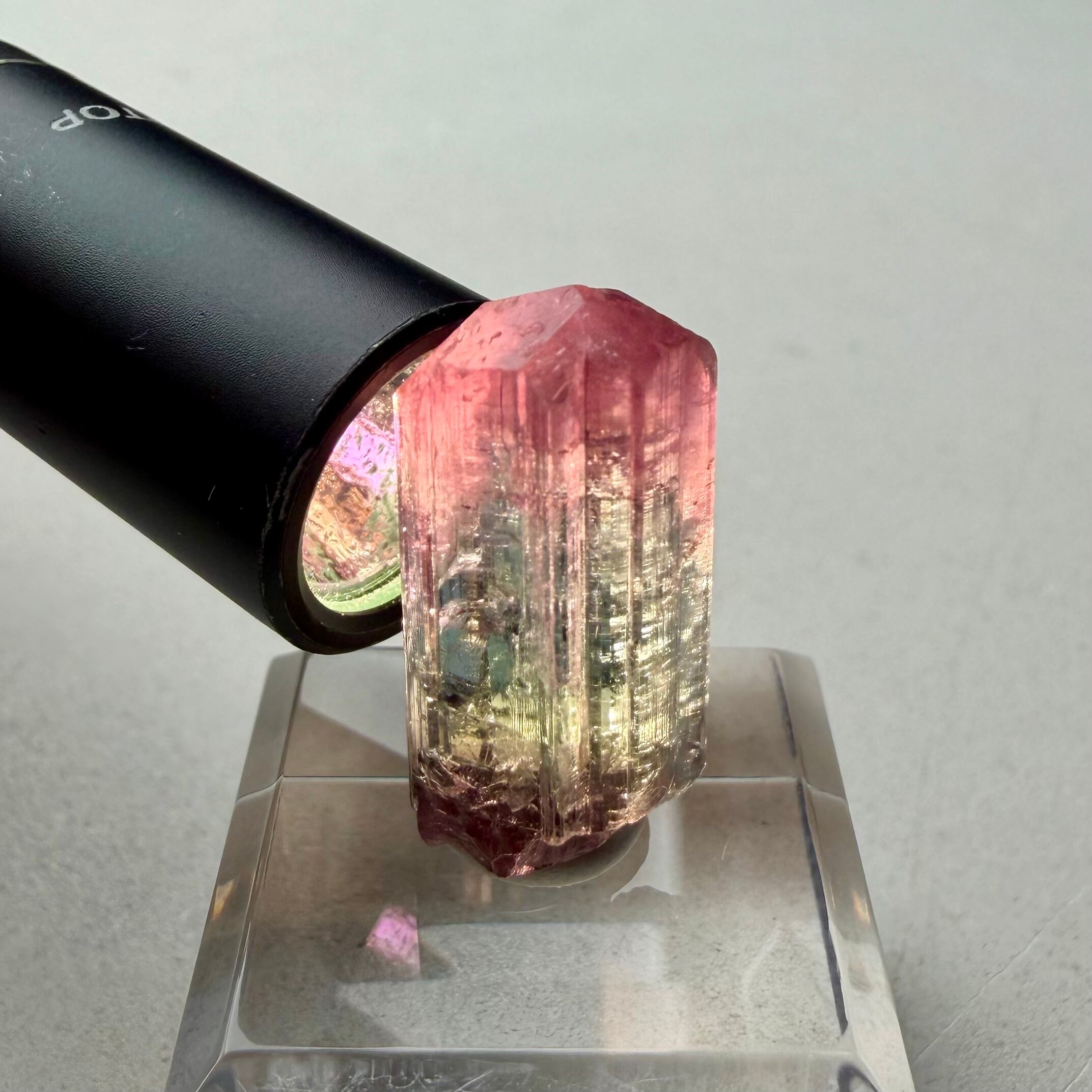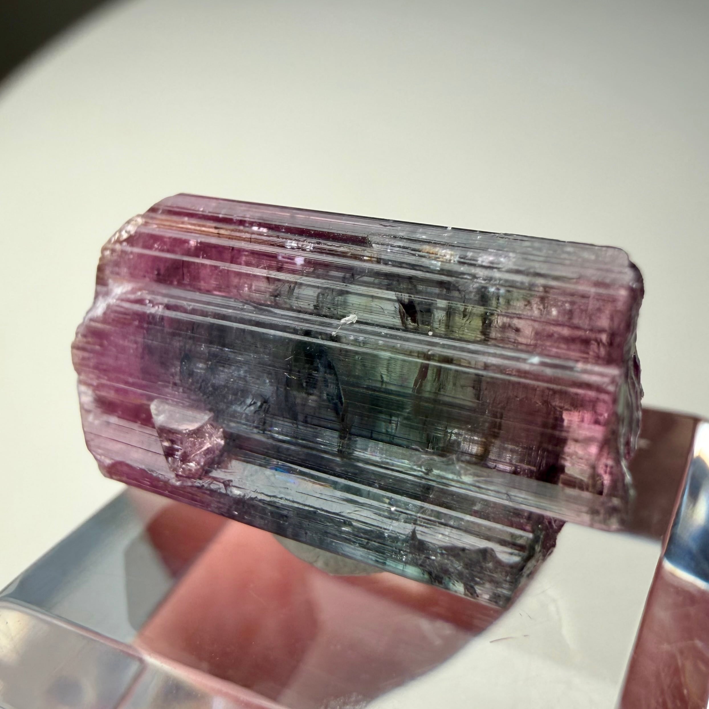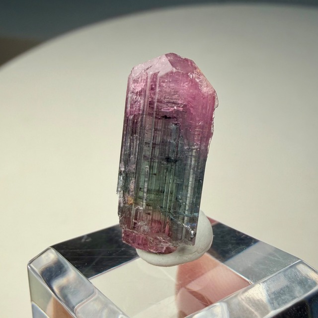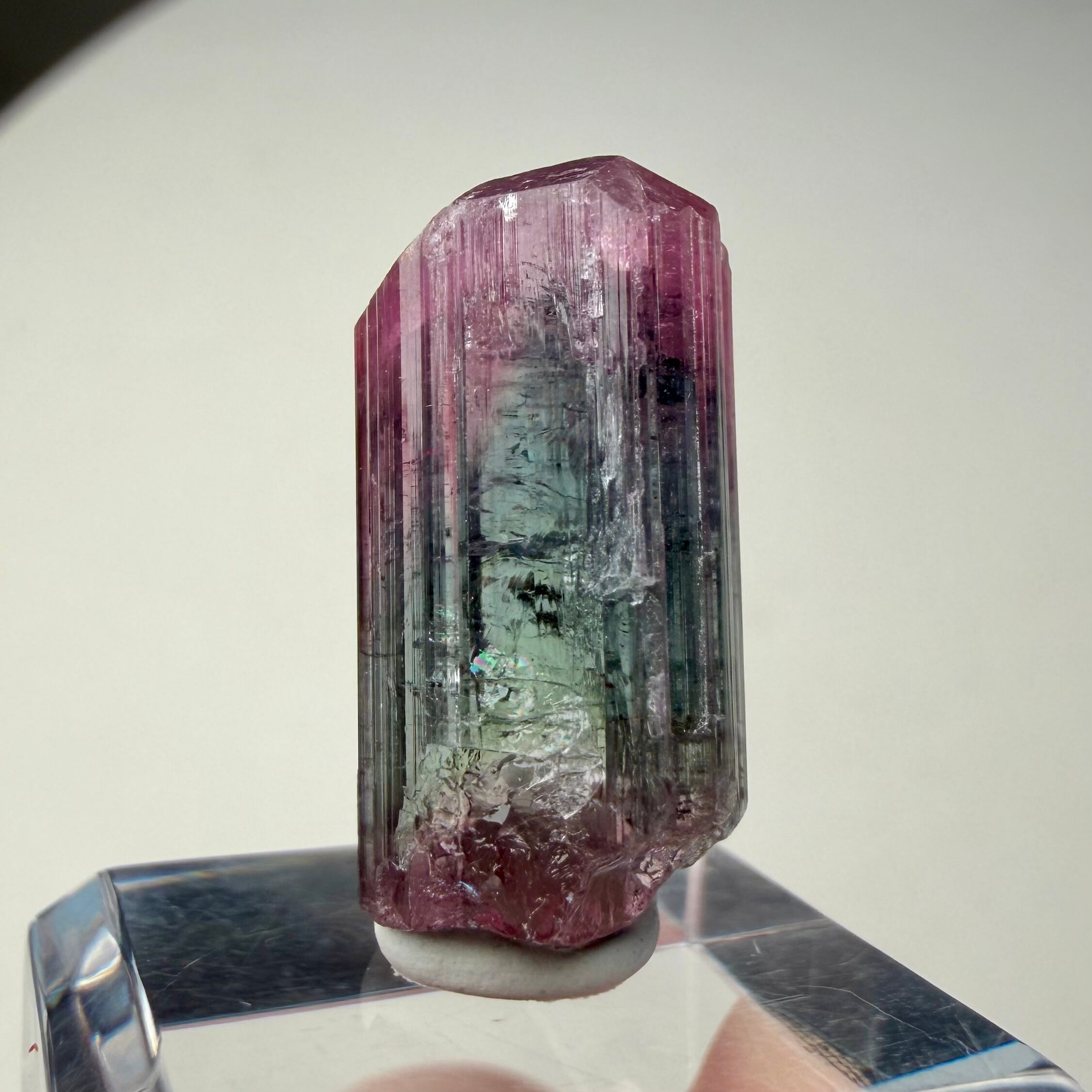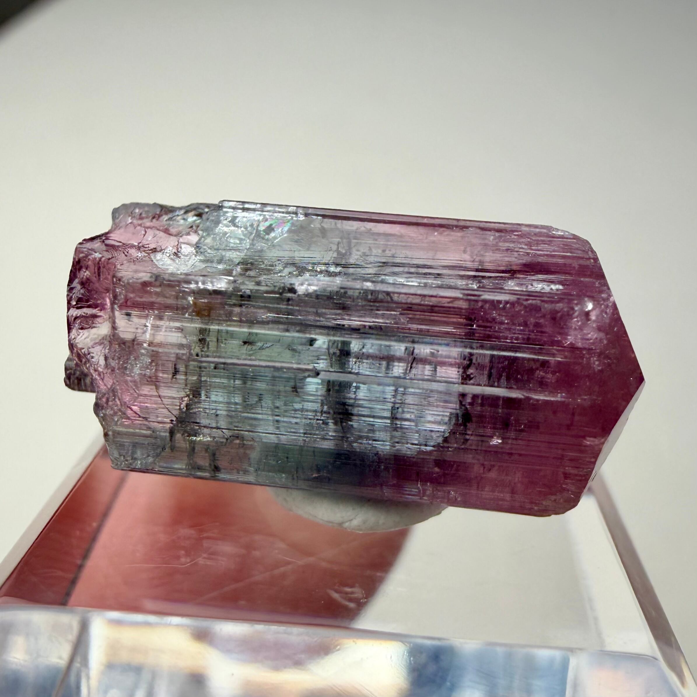 大枠としては赤とグリーンですが、赤からピンクへのグラデーション、グリーンのグラデーションやブルーグリーンの発色が見られるマルチカラーの美結晶です。