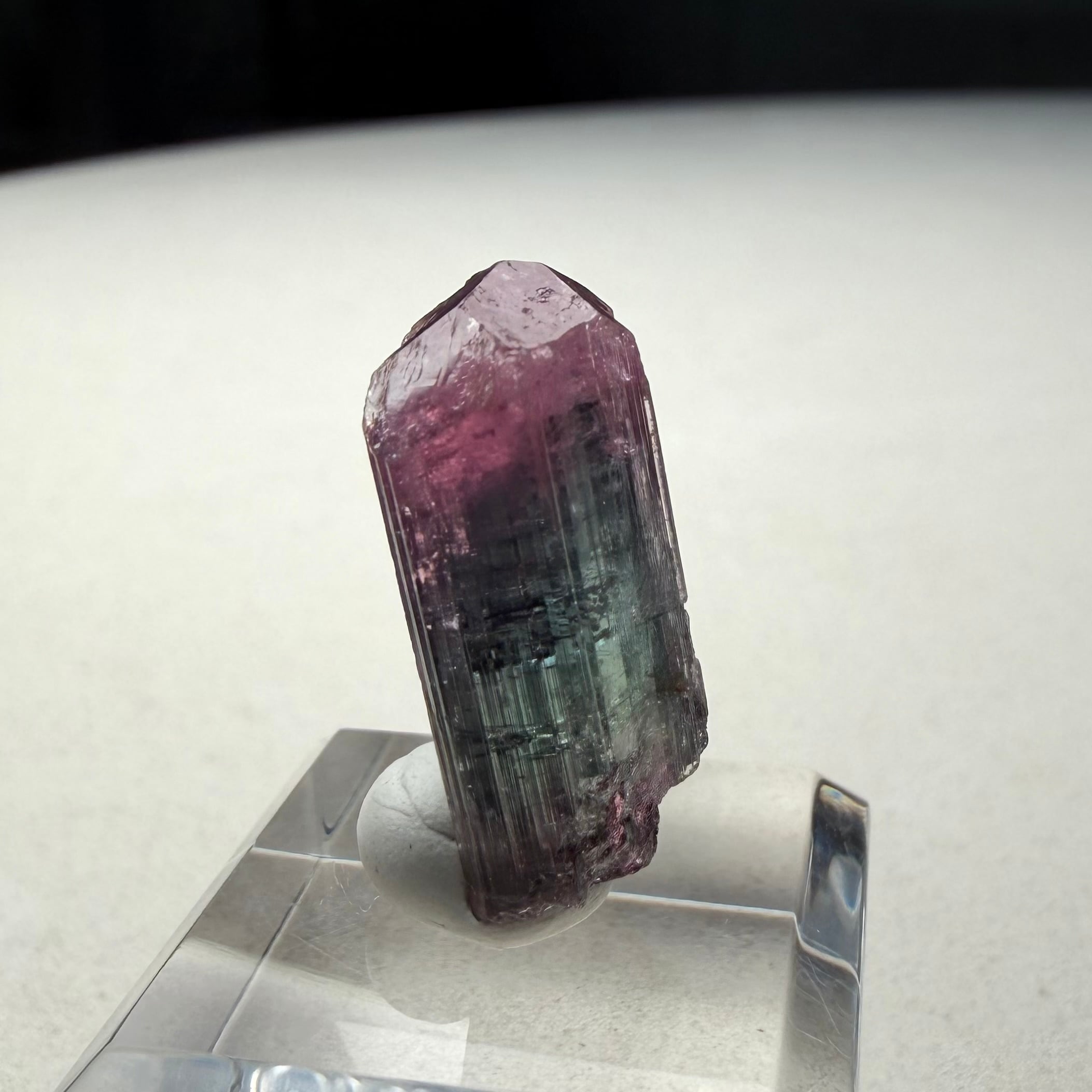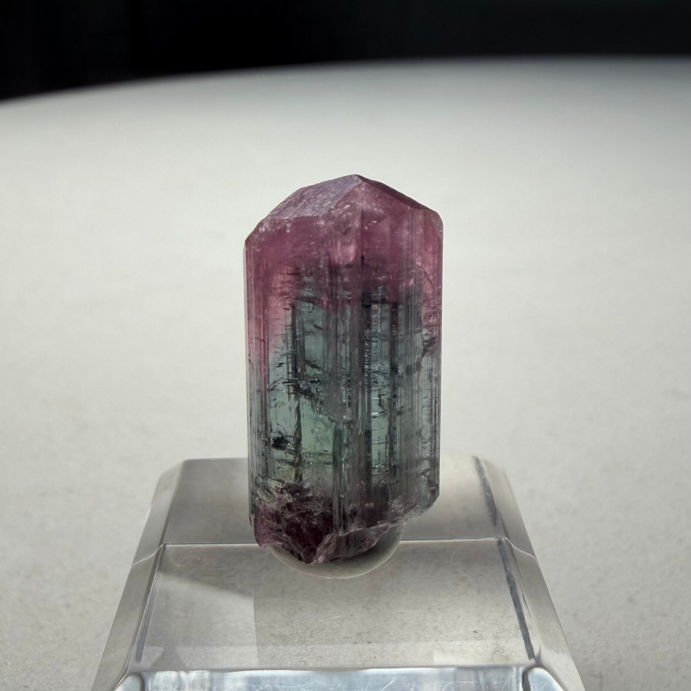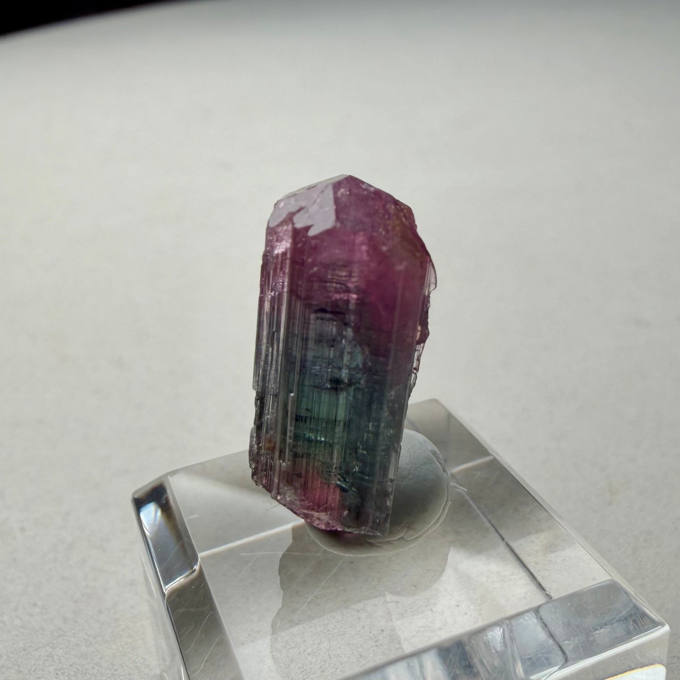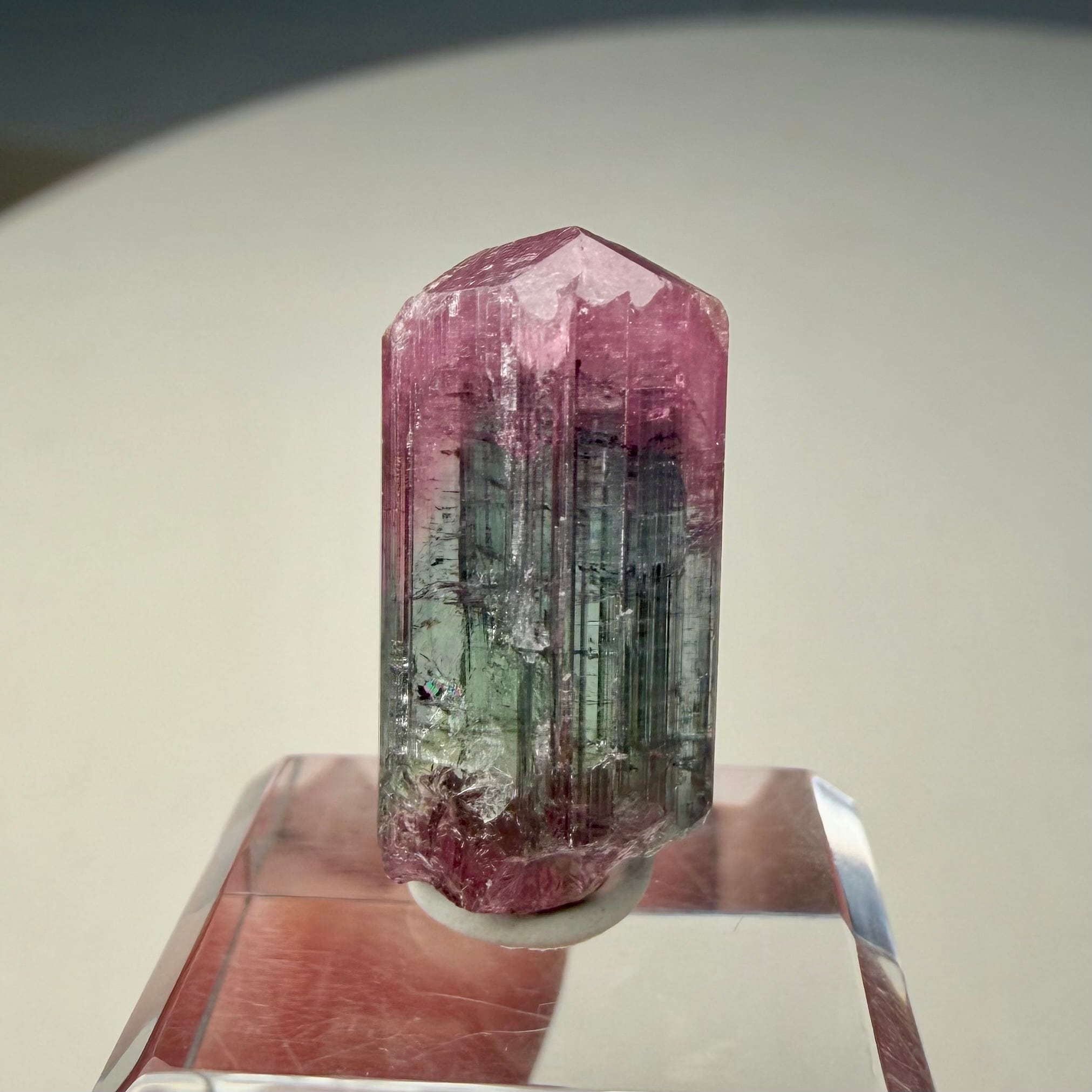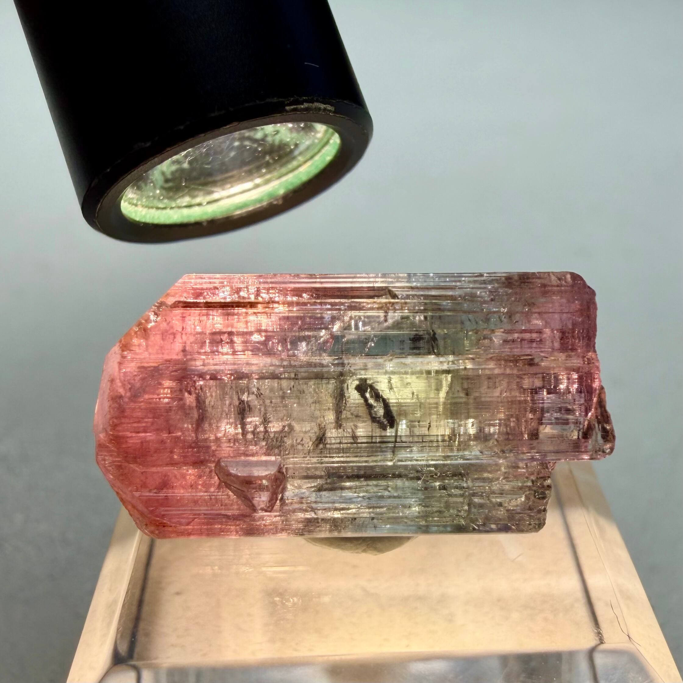 大枠としては赤とグリーンですが、赤からピンクへのグラデーション、グリーンのグラデーションやブルーグリーンの発色が見られるマルチカラーの美結晶です。