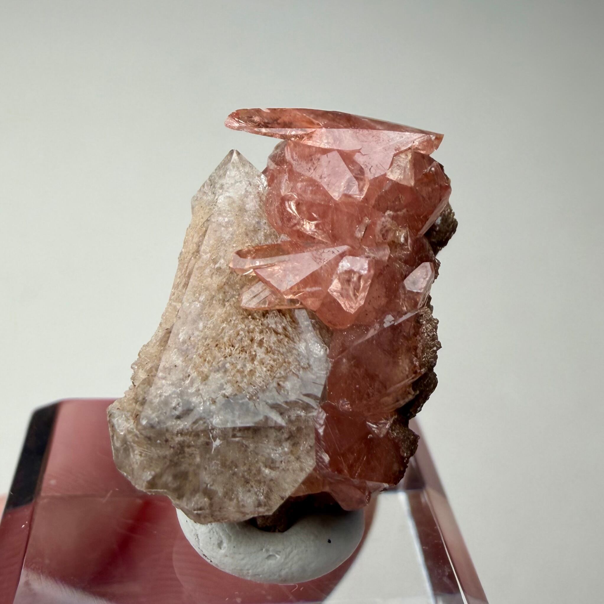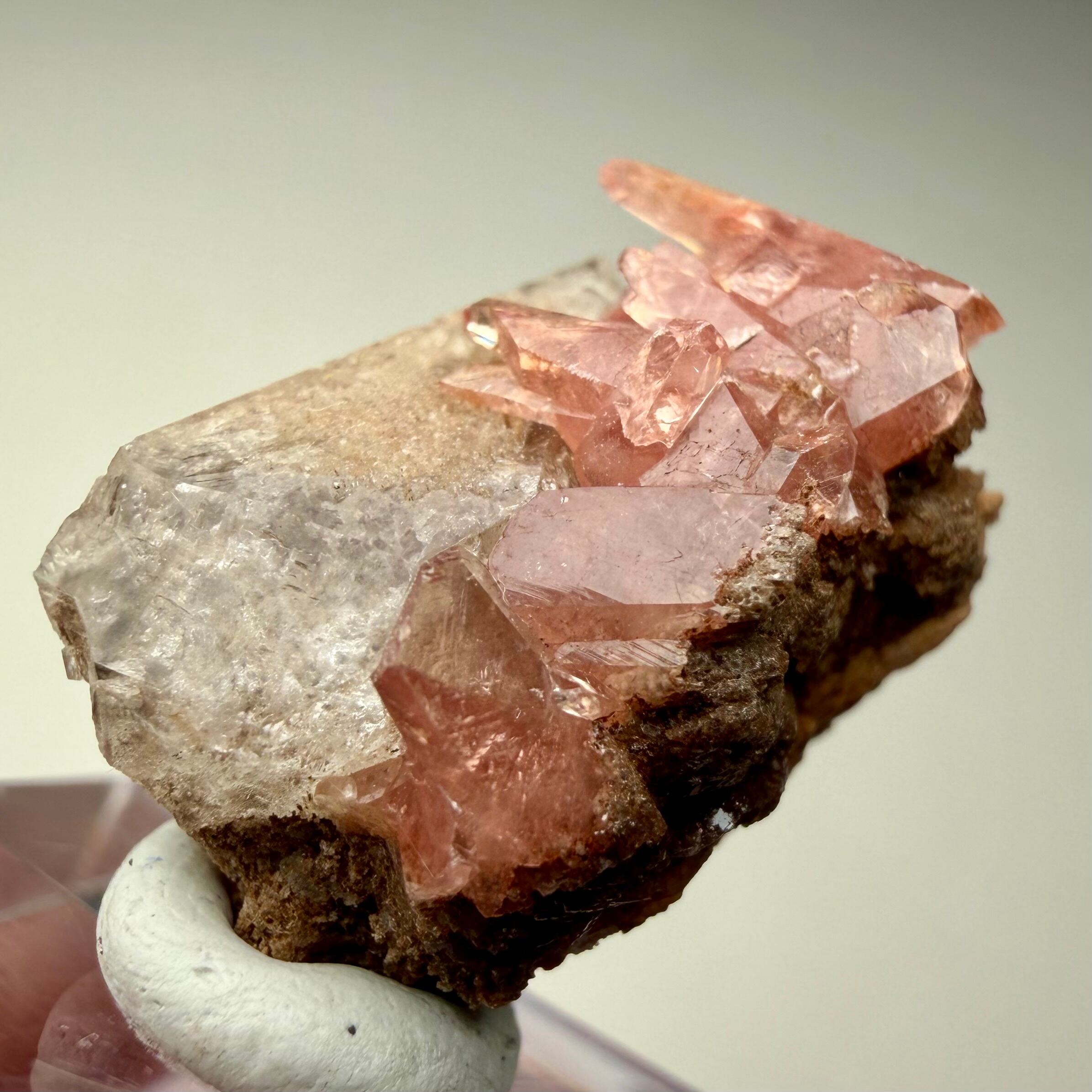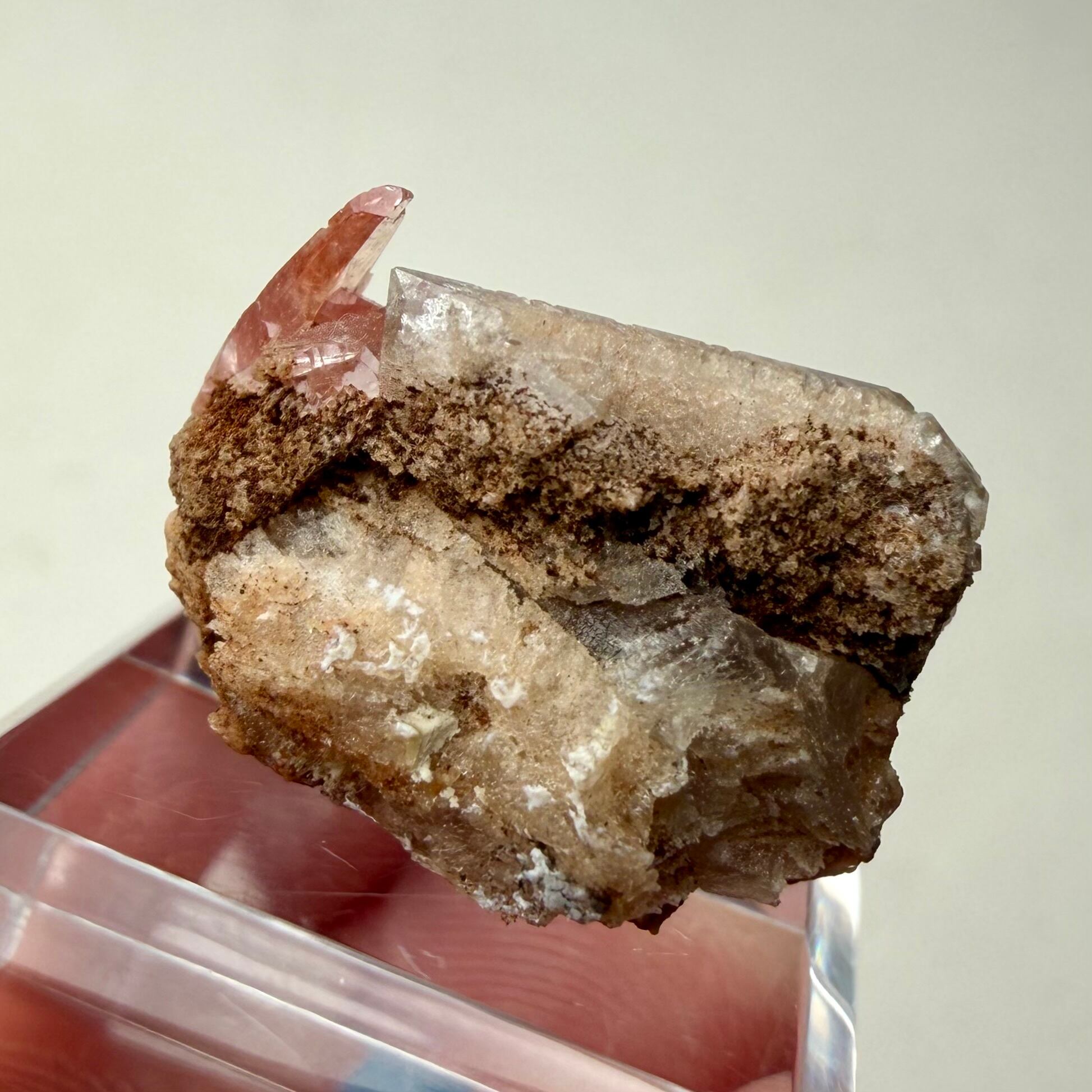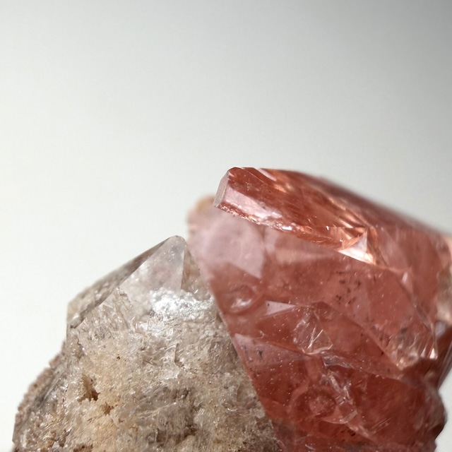 メキシコ産としては少し珍しい形状のロードクロサイトはクリアで発色も良好、クォーツは内部に砂岩の様な内包物があり、透過光下ではその特徴が顕著に見られます。