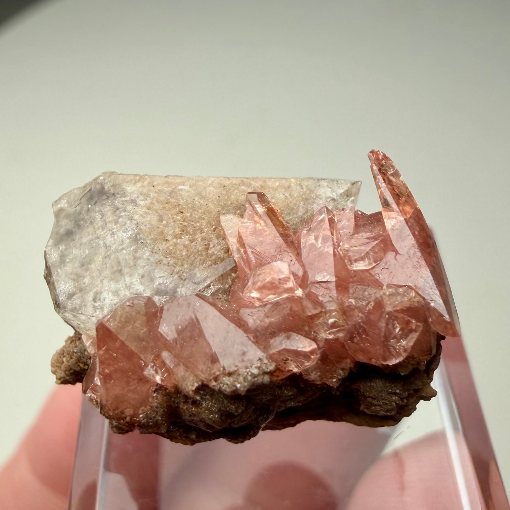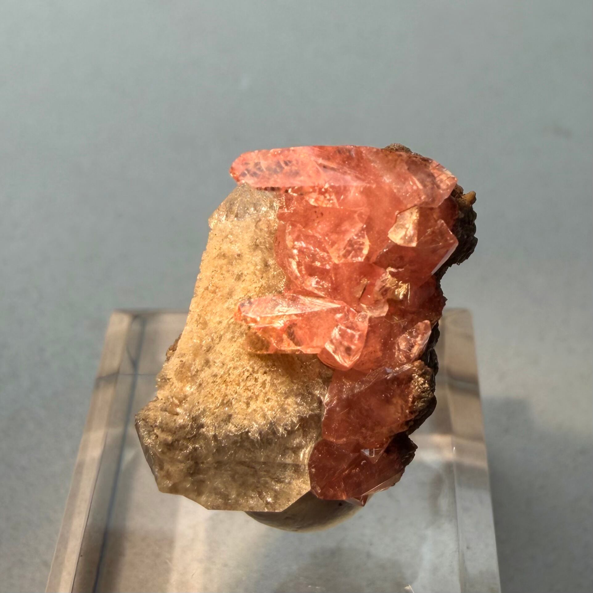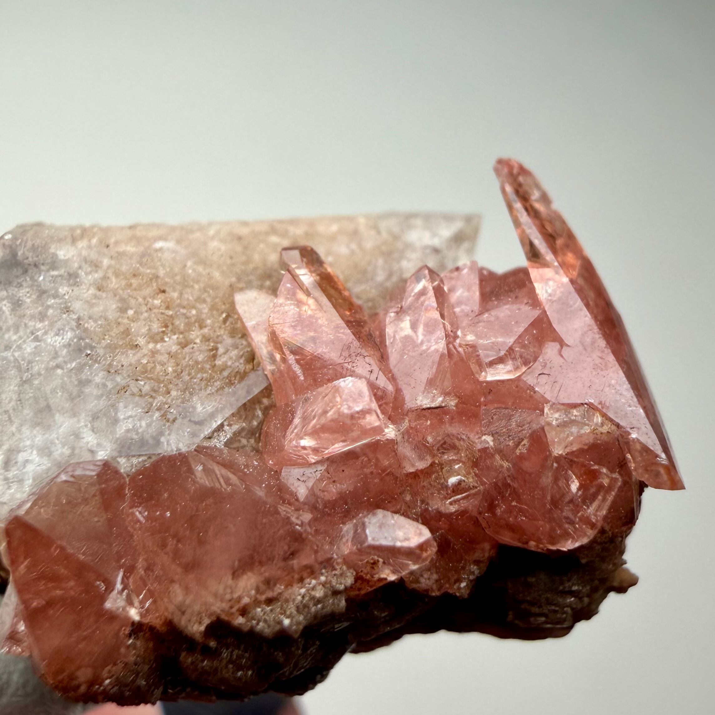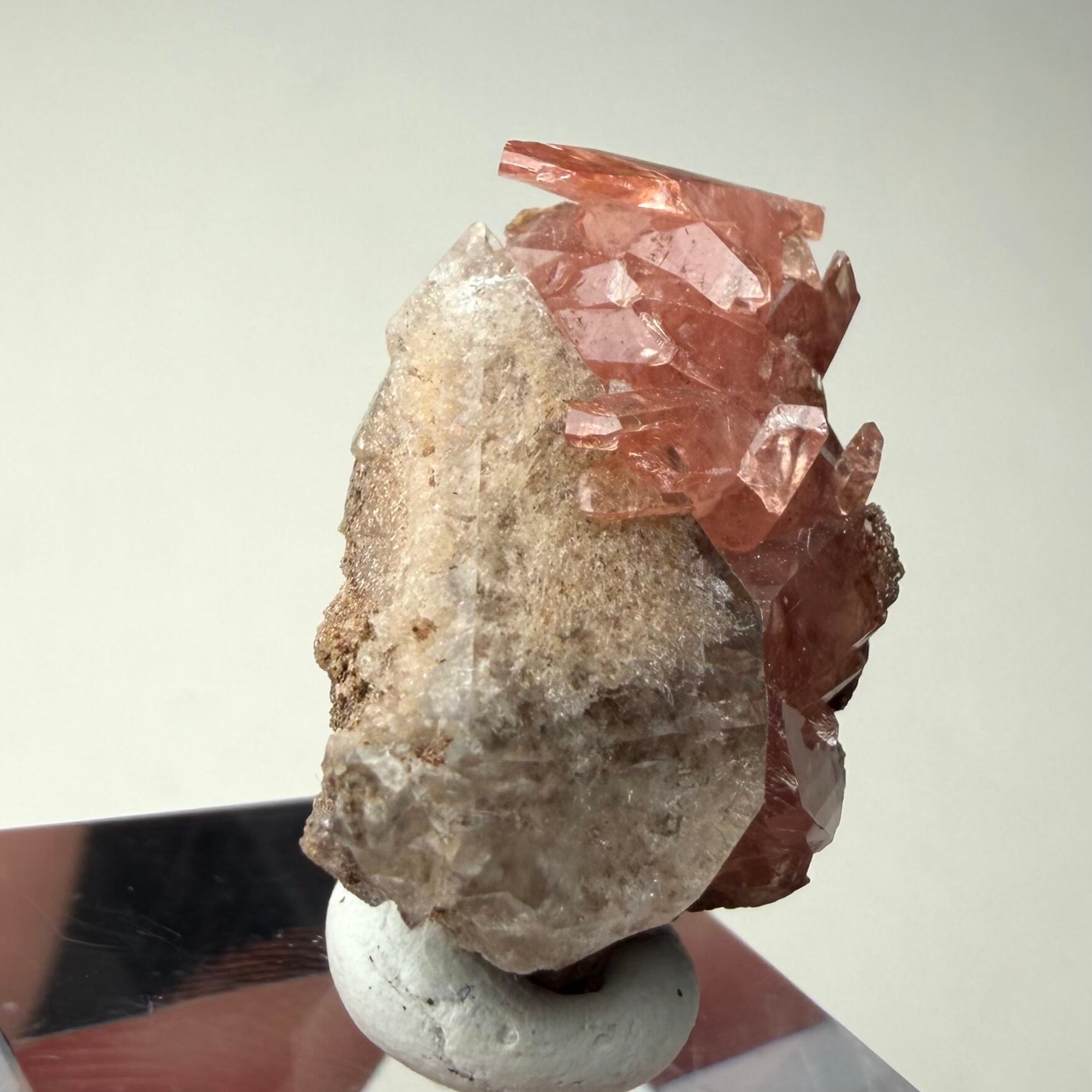 メキシコ産としては少し珍しい形状のロードクロサイトはクリアで発色も良好、クォーツは内部に砂岩の様な内包物があり、透過光下ではその特徴が顕著に見られます。