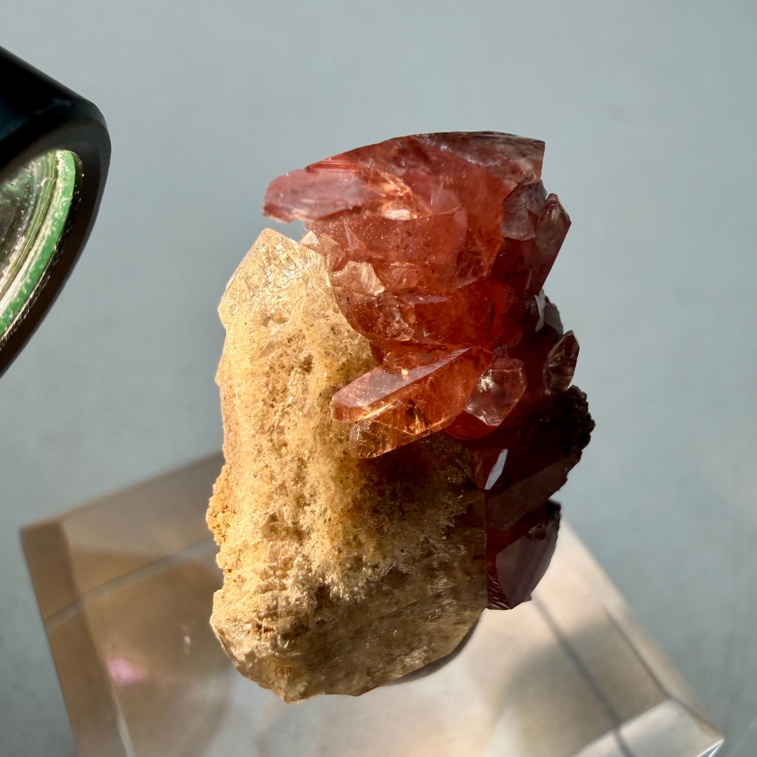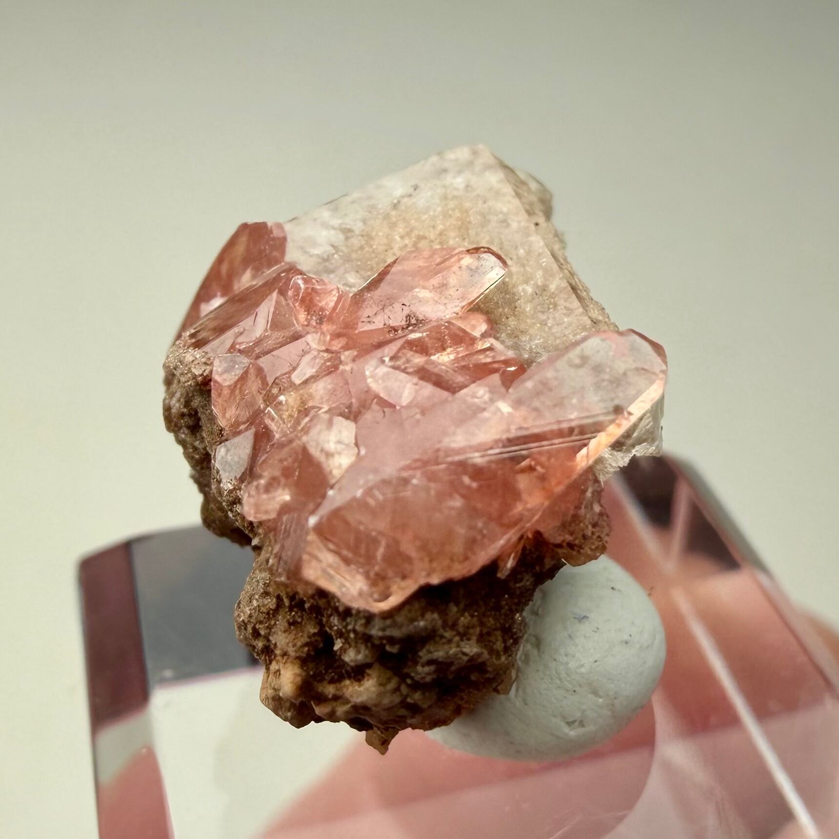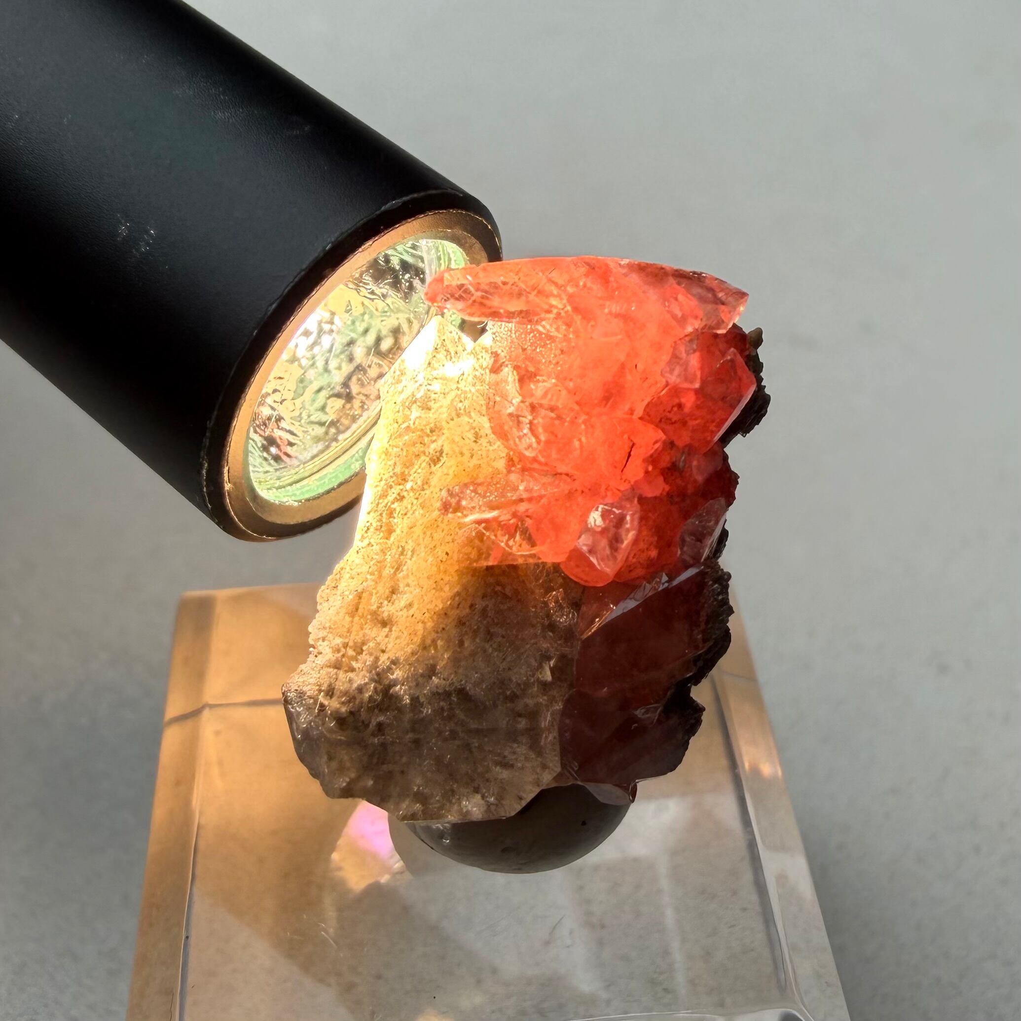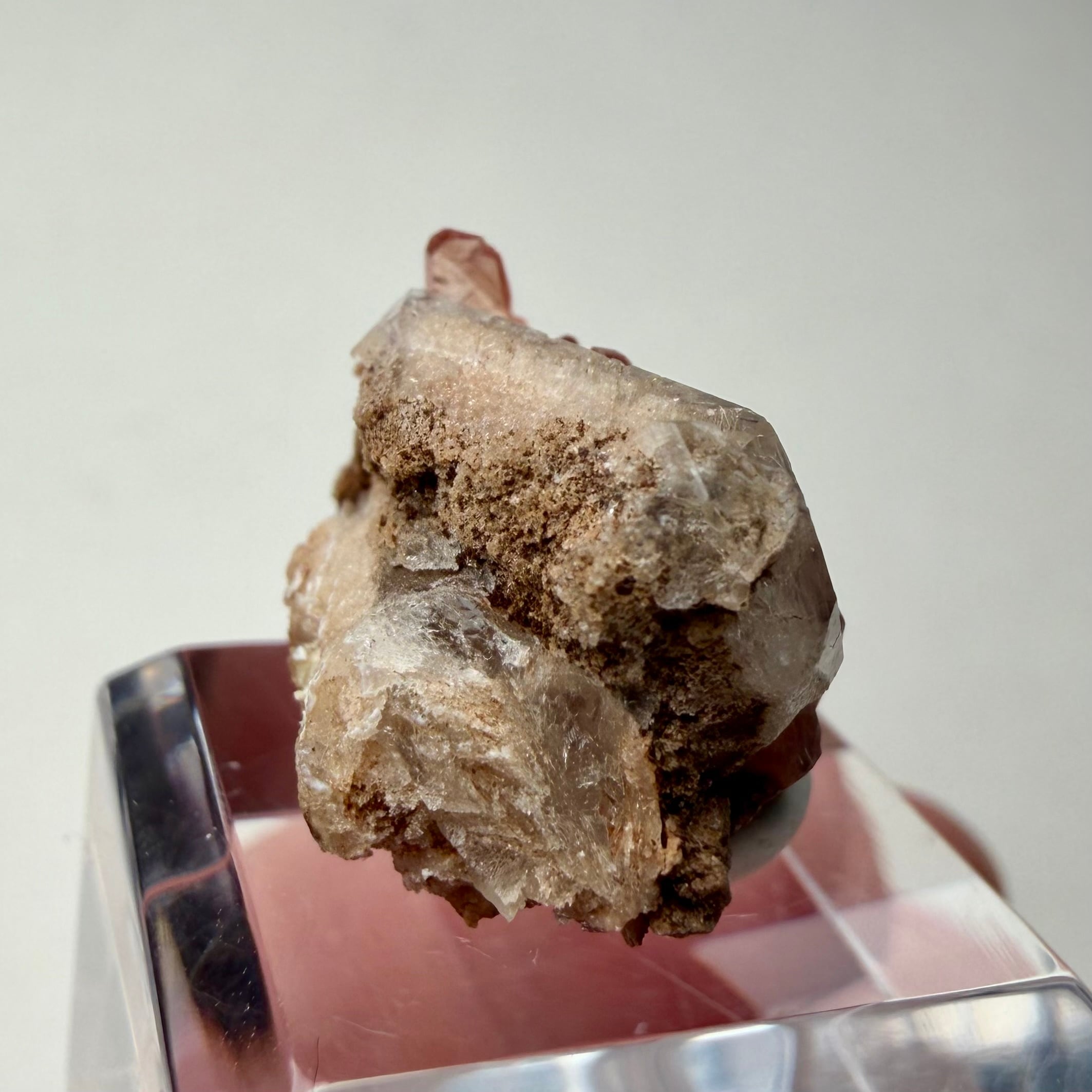 メキシコ産としては少し珍しい形状のロードクロサイトはクリアで発色も良好、クォーツは内部に砂岩の様な内包物があり、透過光下ではその特徴が顕著に見られます。