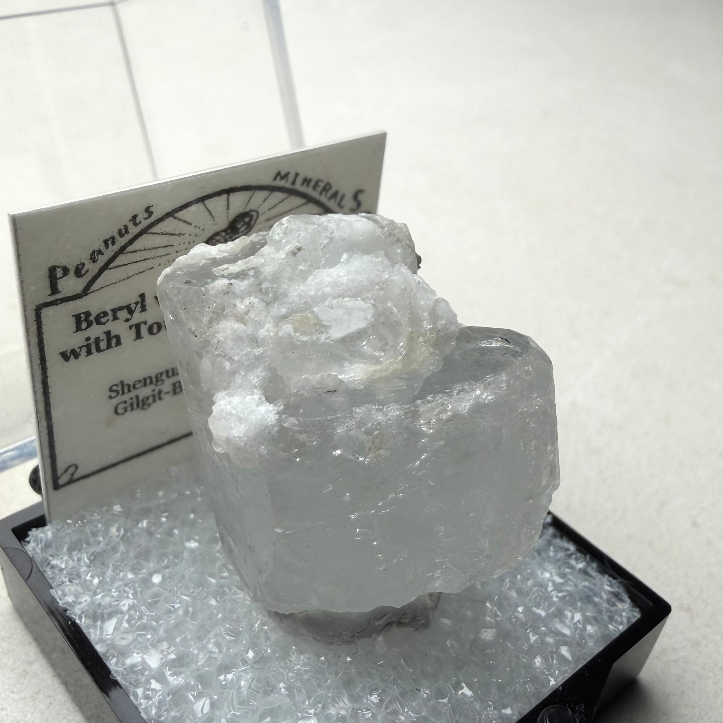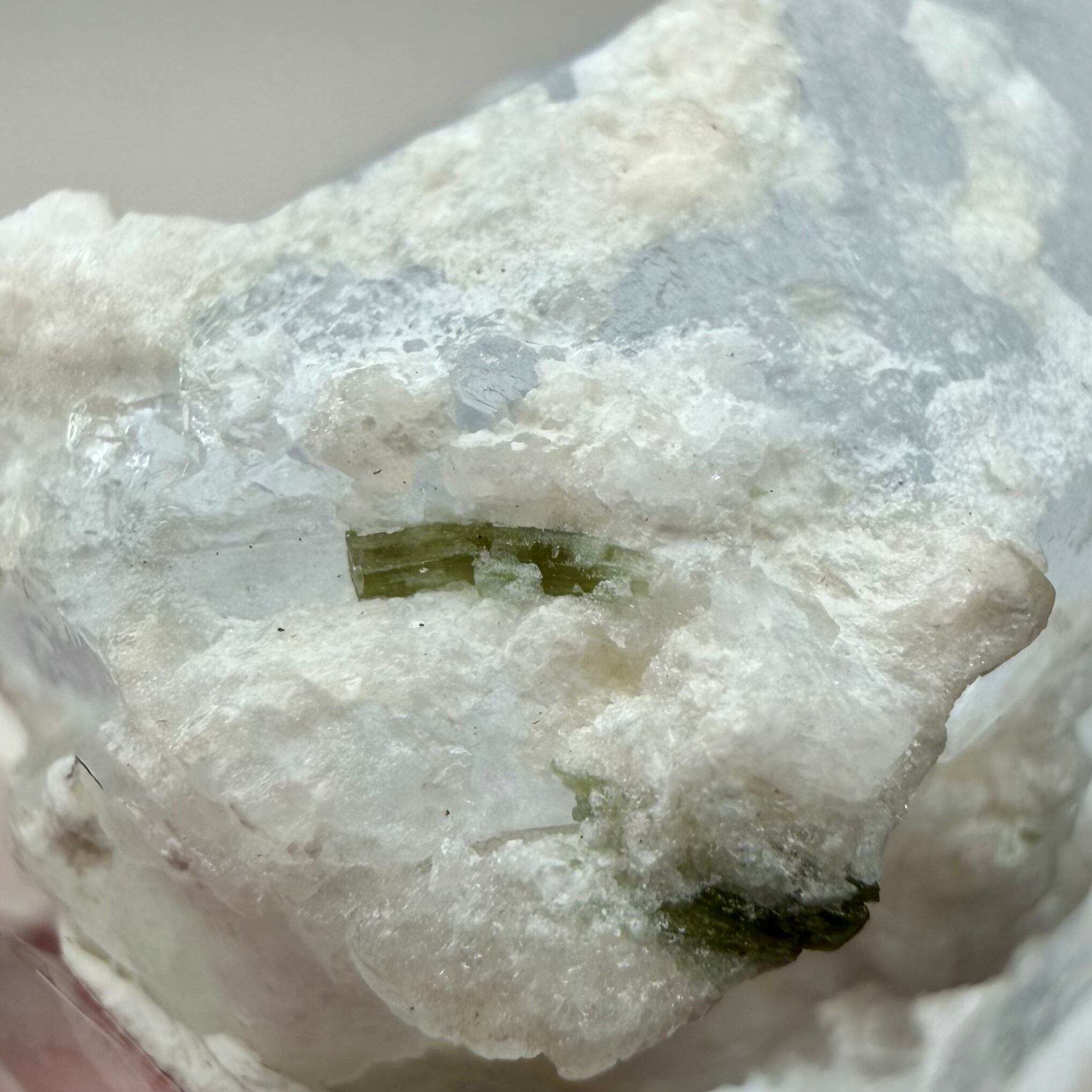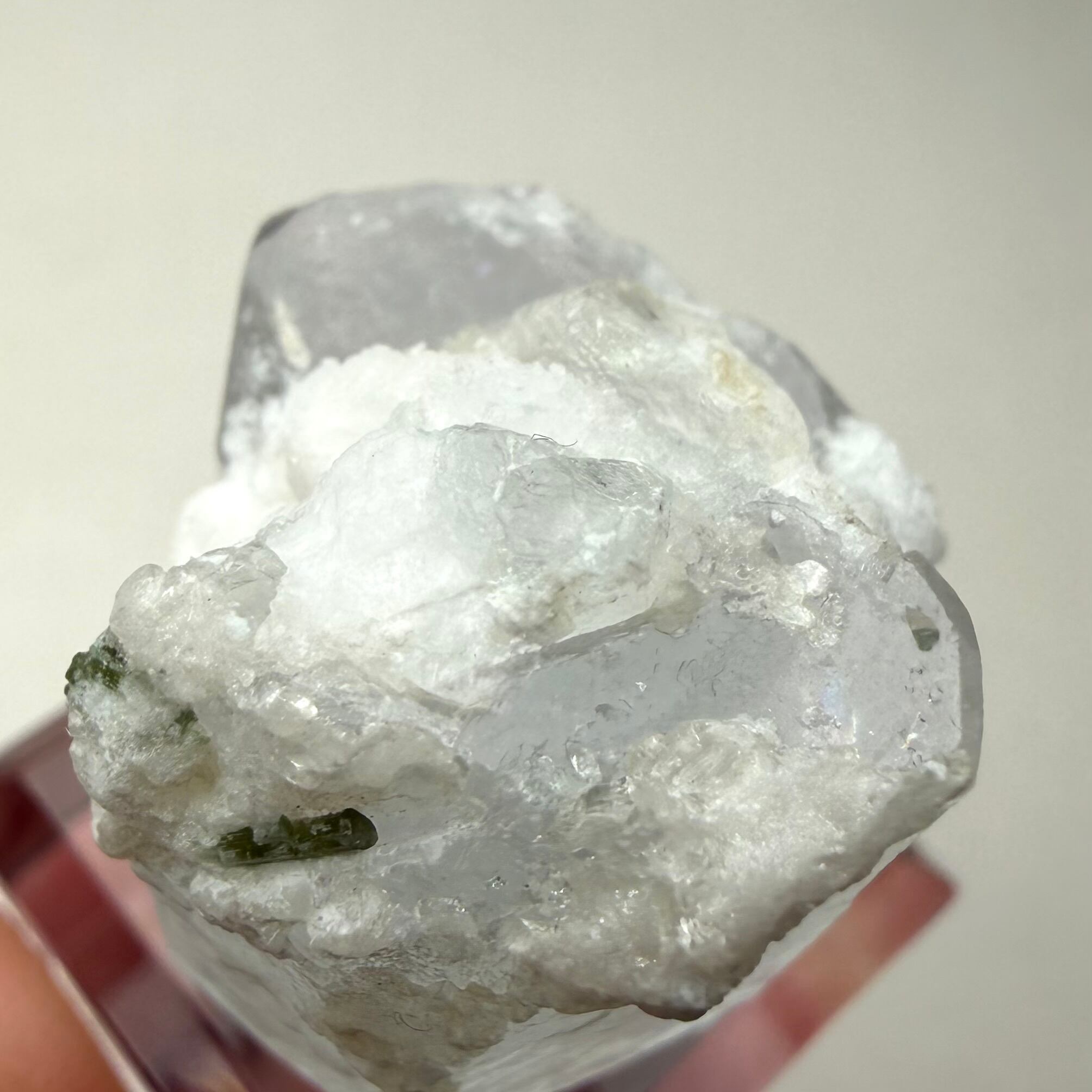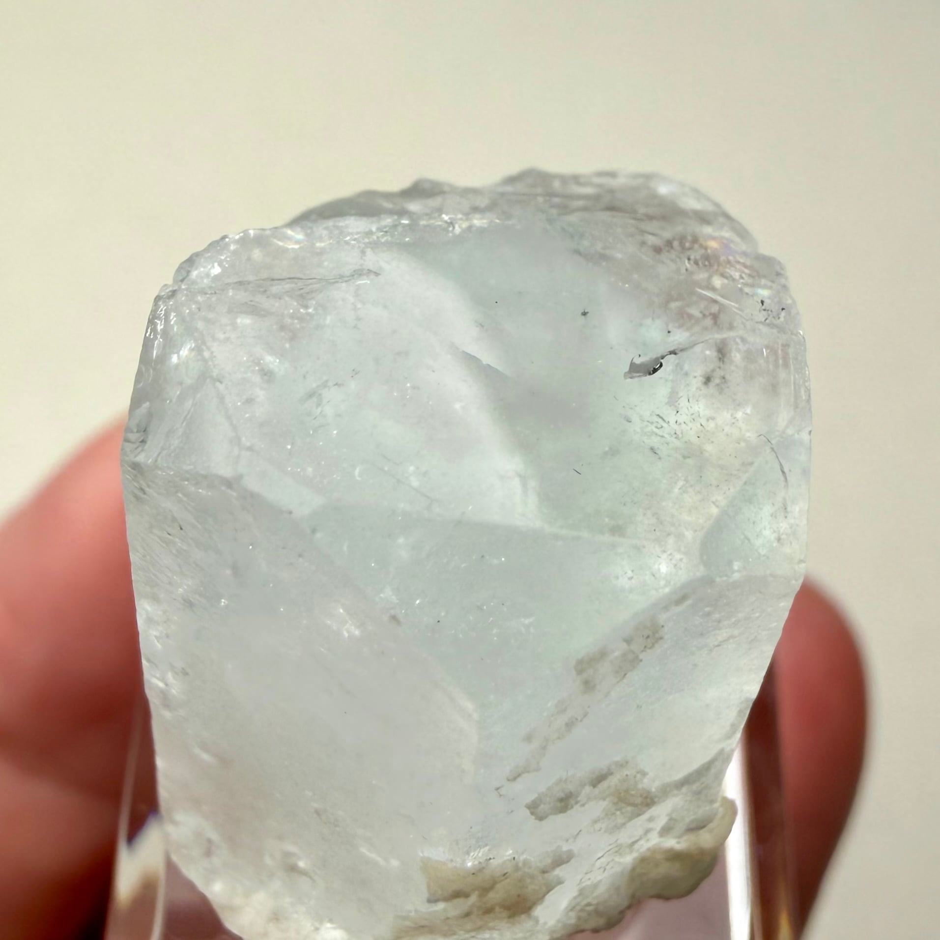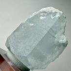 カラーレスに近い非常に淡いブルーのアクアマリンで、結晶内部に白い内包物が入るためかミルキーカラーといった印象、ただ極々僅かにピンクの雰囲気が入るため、産地的にもモルガマリンの一歩手前の結晶といった印象です。