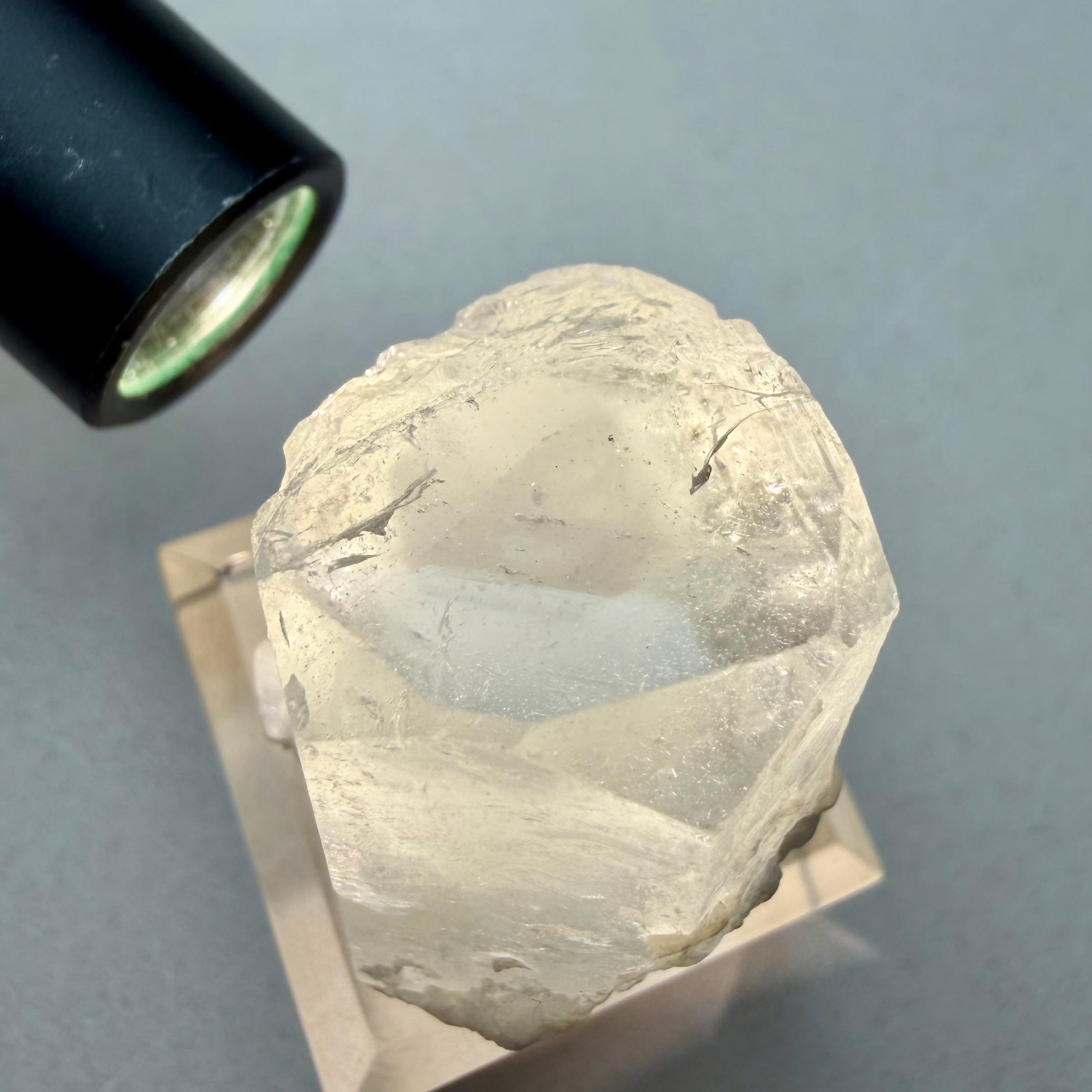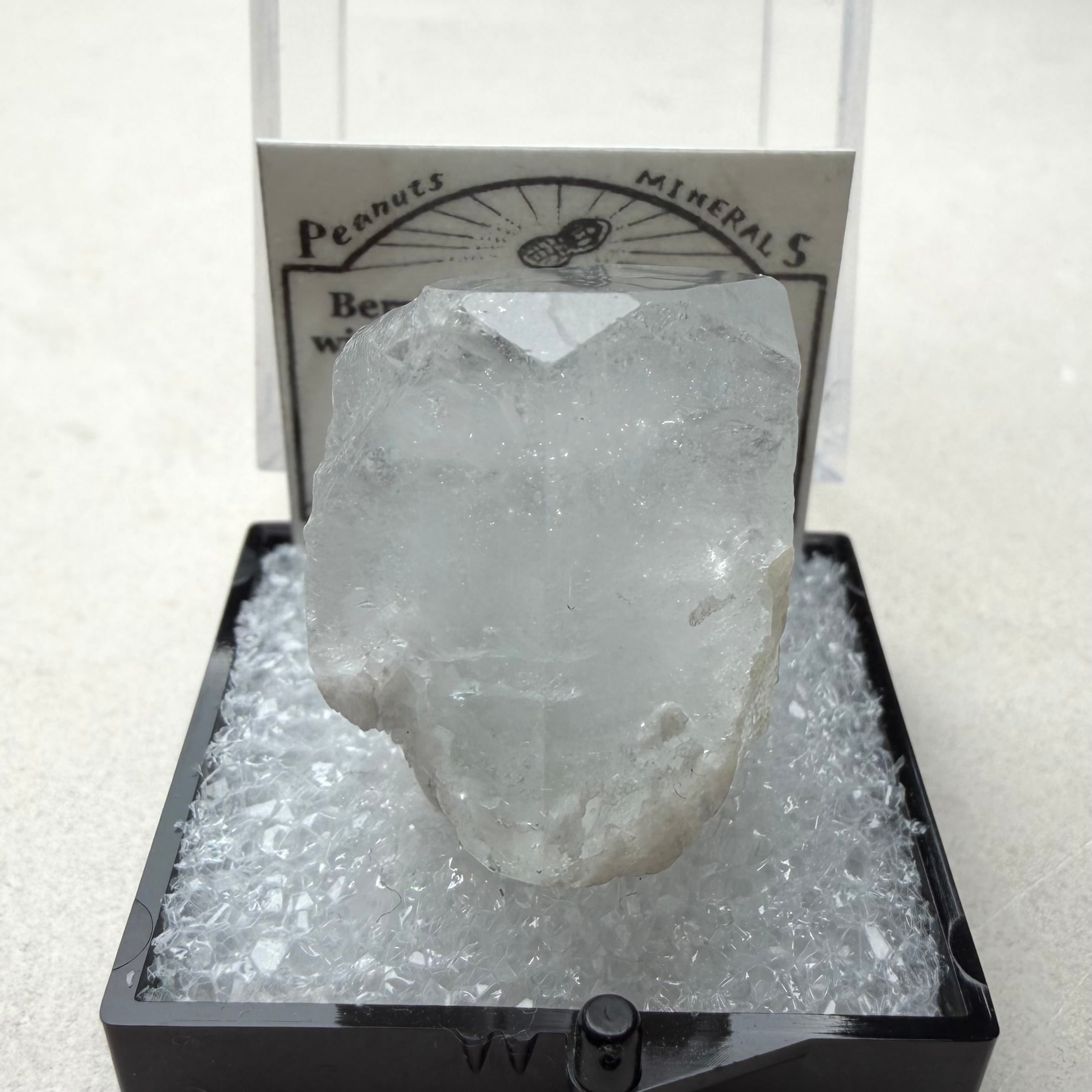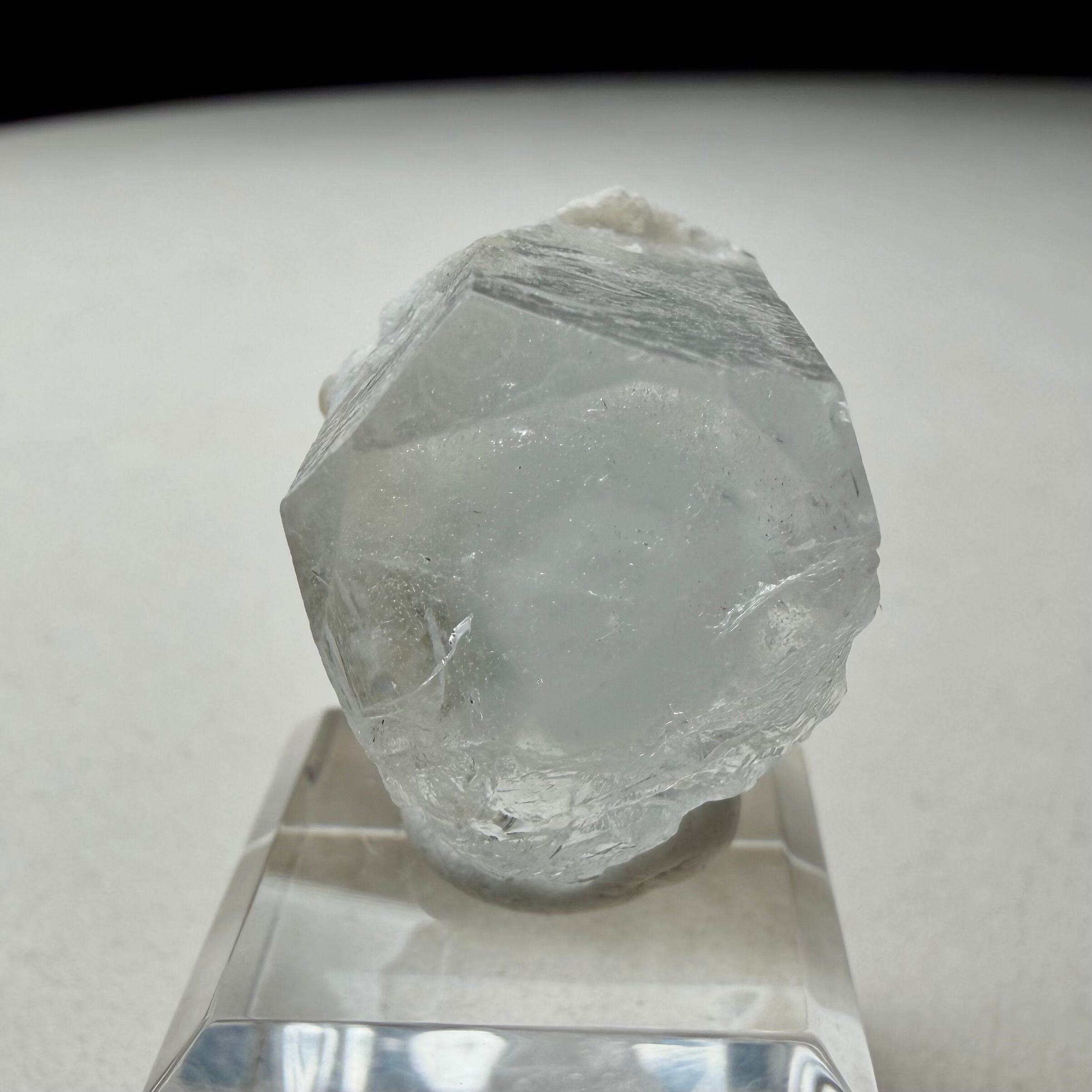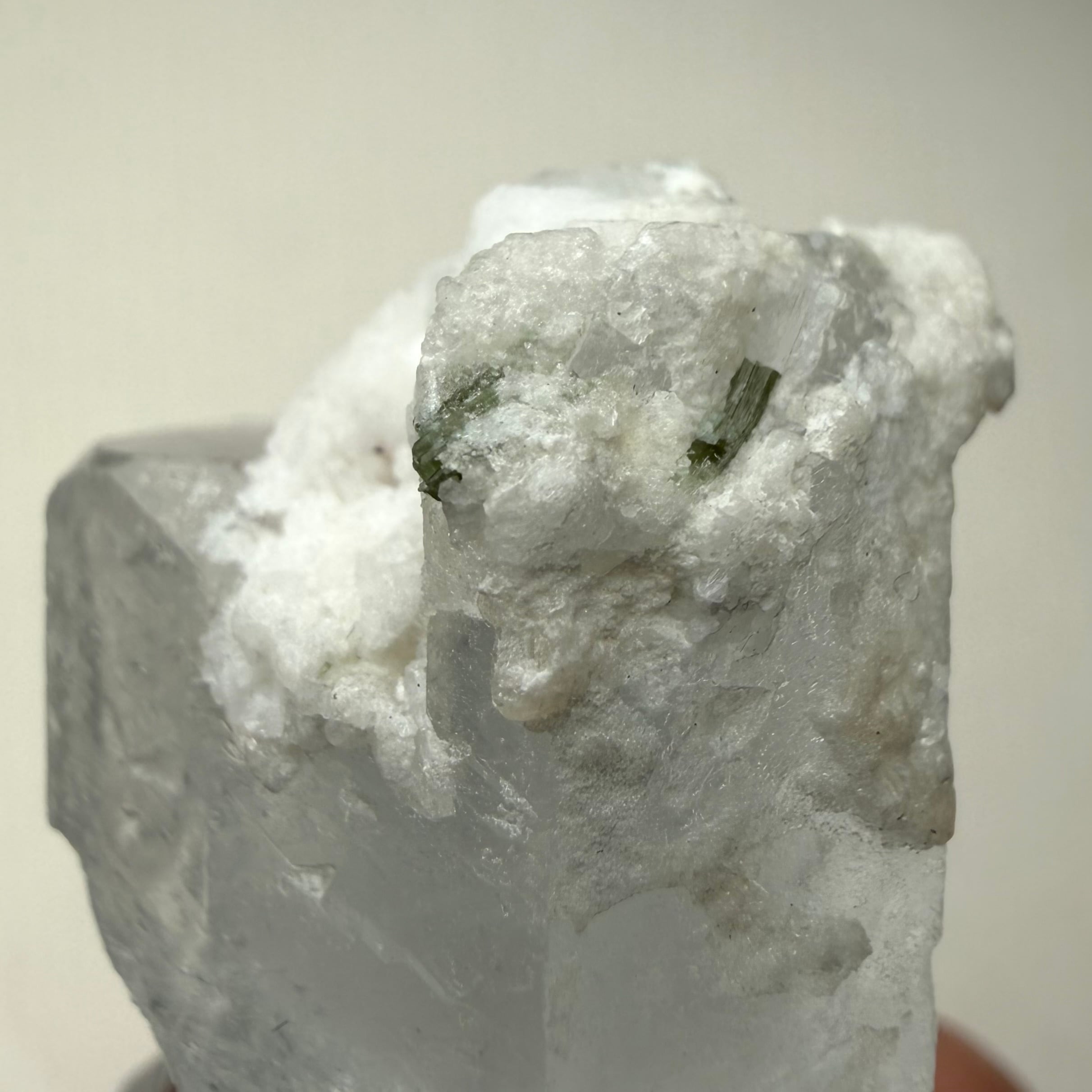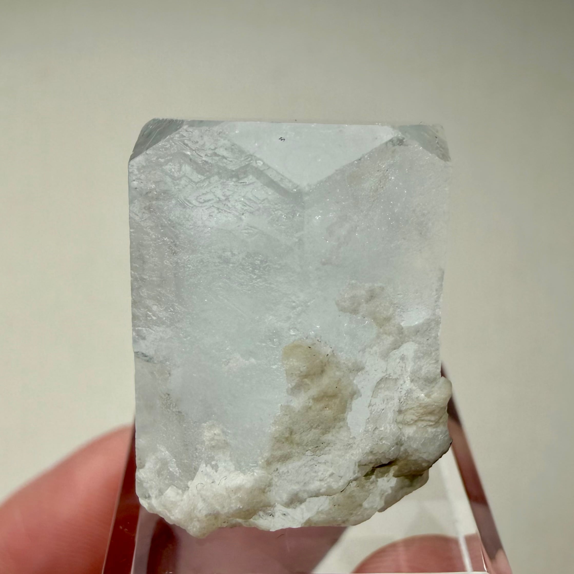 カラーレスに近い非常に淡いブルーのアクアマリンで、結晶内部に白い内包物が入るためかミルキーカラーといった印象、ただ極々僅かにピンクの雰囲気が入るため、産地的にもモルガマリンの一歩手前の結晶といった印象です。