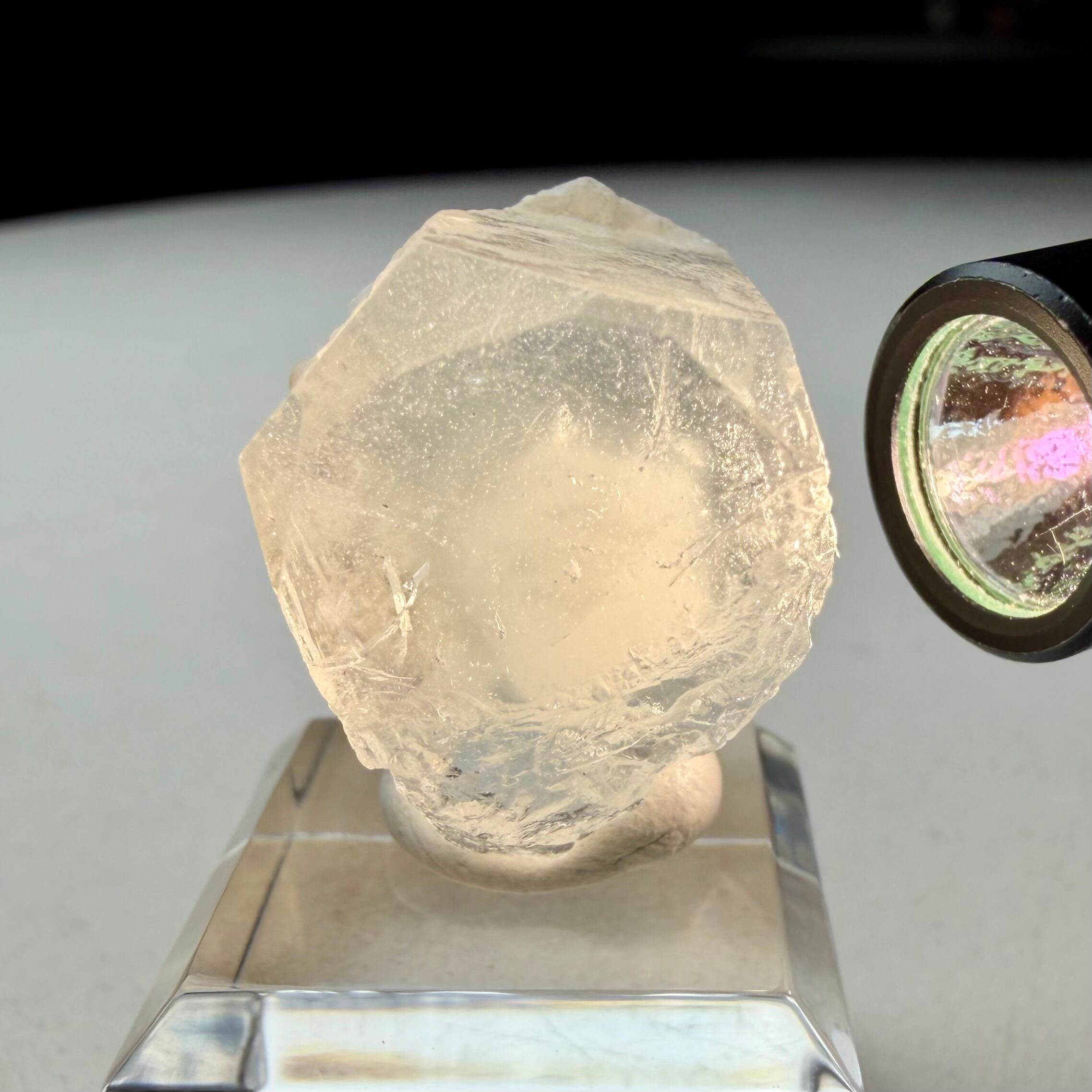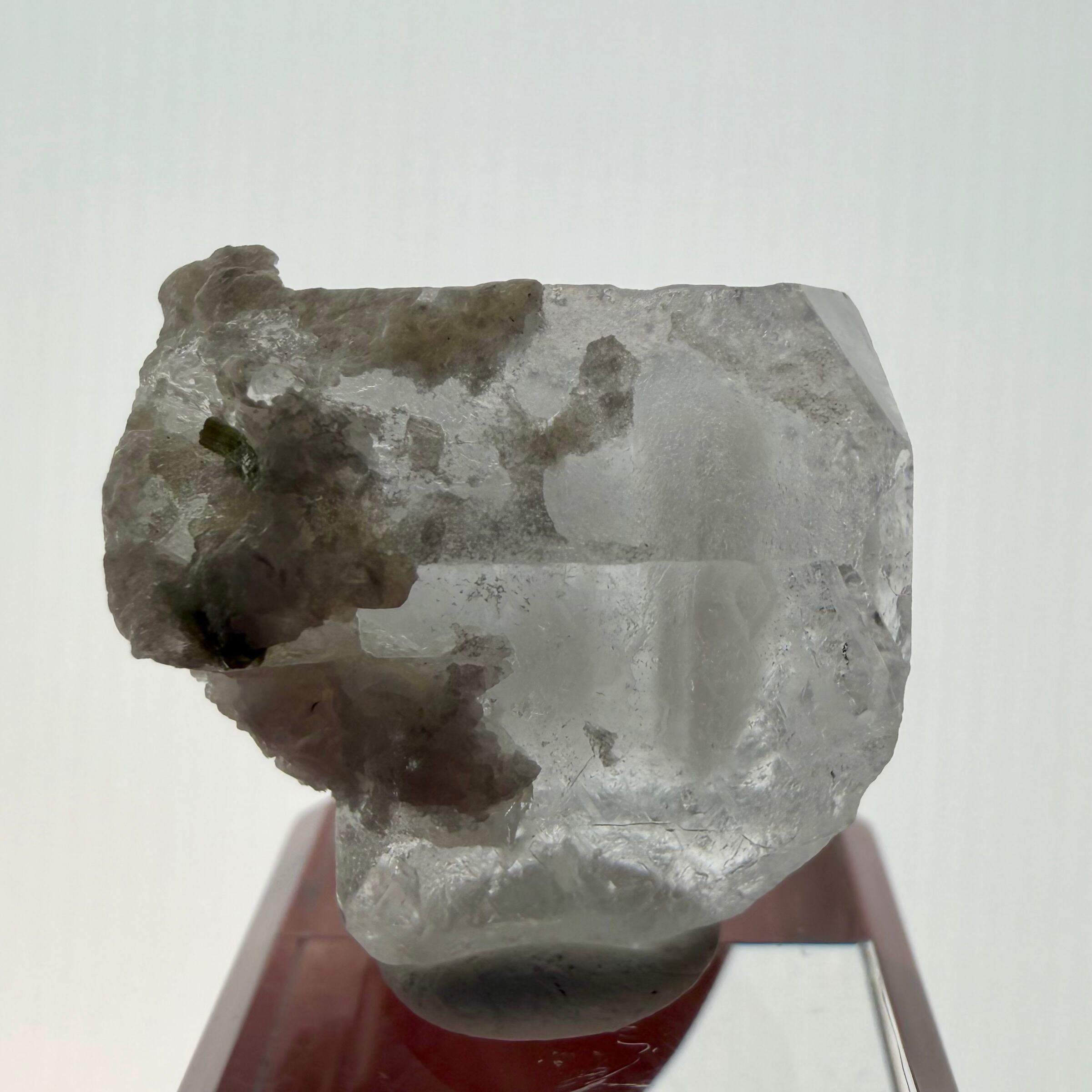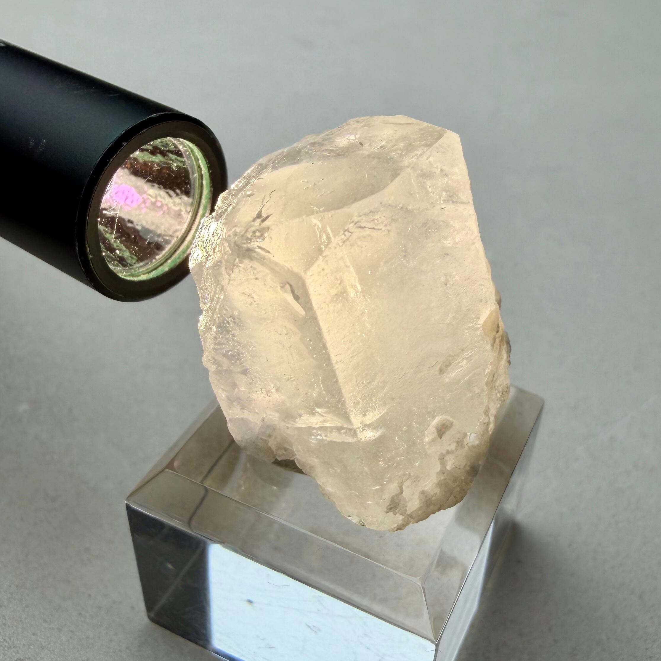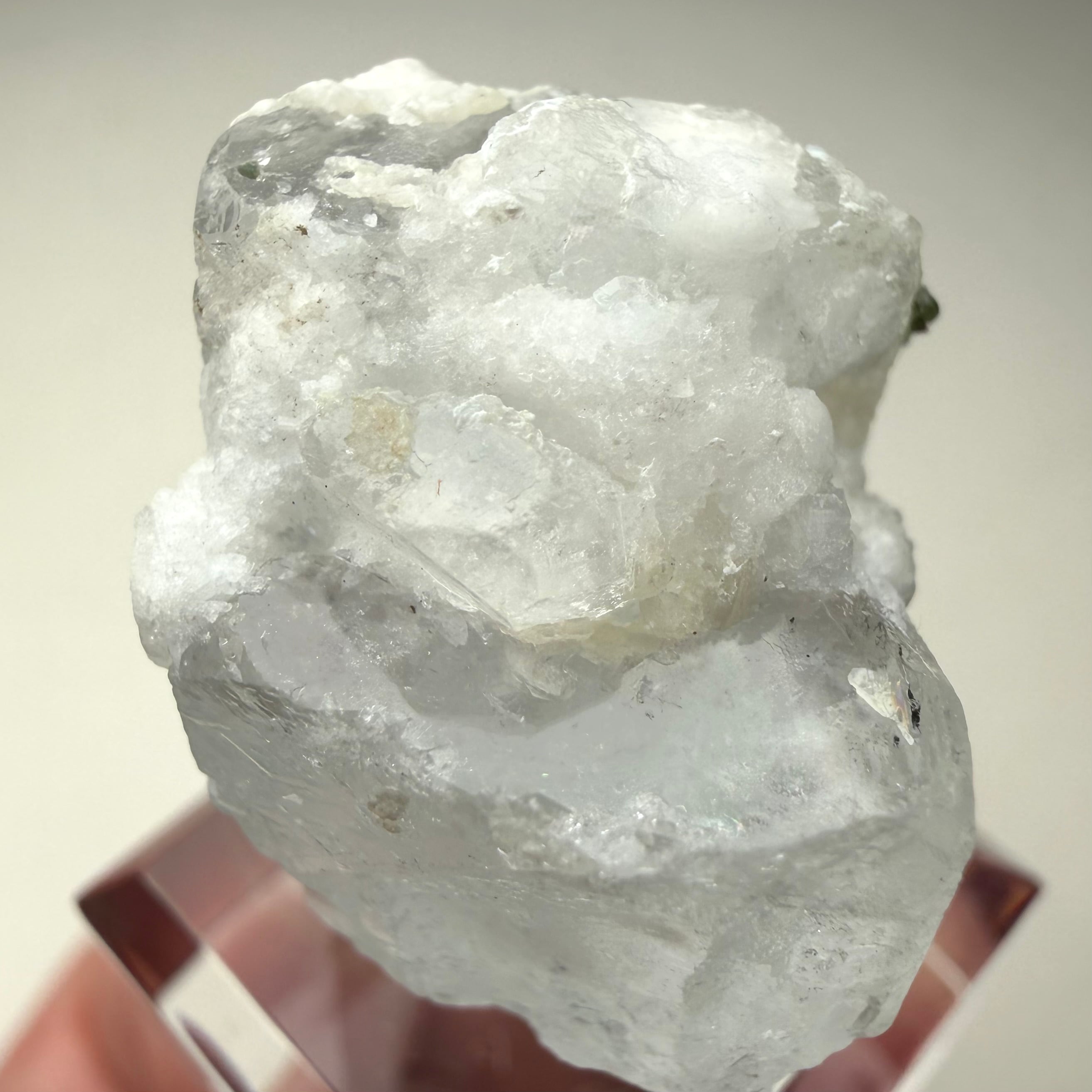 カラーレスに近い非常に淡いブルーのアクアマリンで、結晶内部に白い内包物が入るためかミルキーカラーといった印象、ただ極々僅かにピンクの雰囲気が入るため、産地的にもモルガマリンの一歩手前の結晶といった印象です。