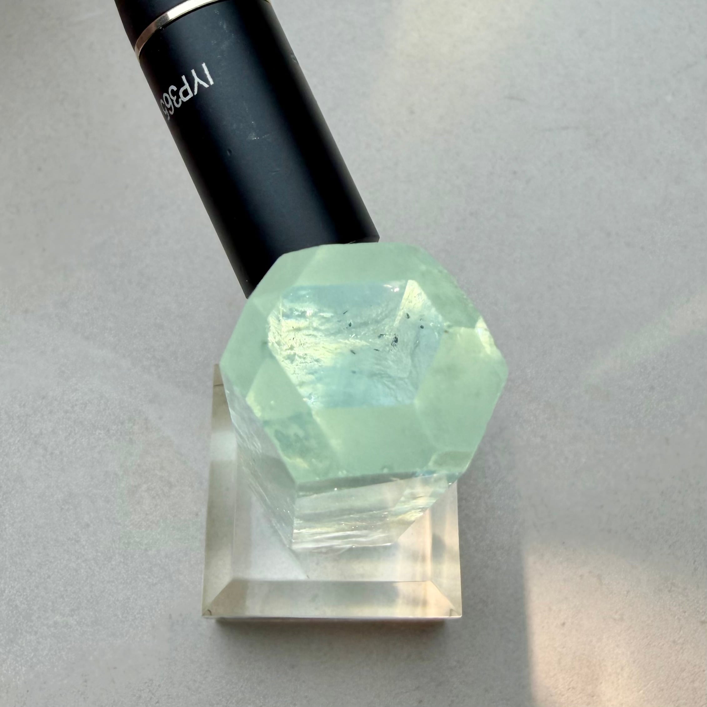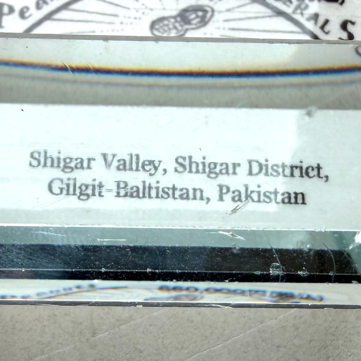 文字を透けさせた画像等でもわかる通り、内部のクラックやインクルージョンも見られず、サイズ感も伴った最良の結晶です。