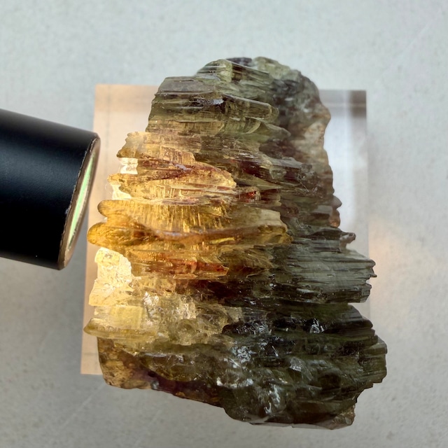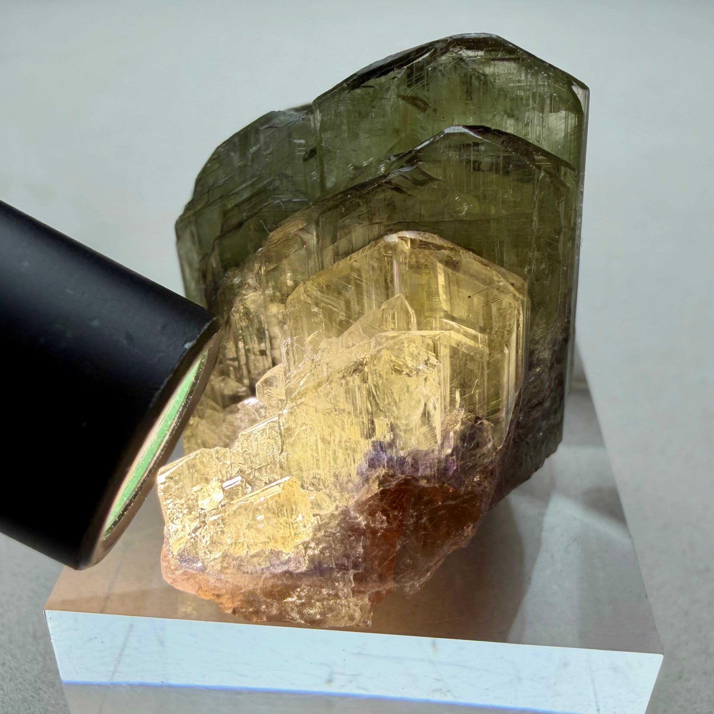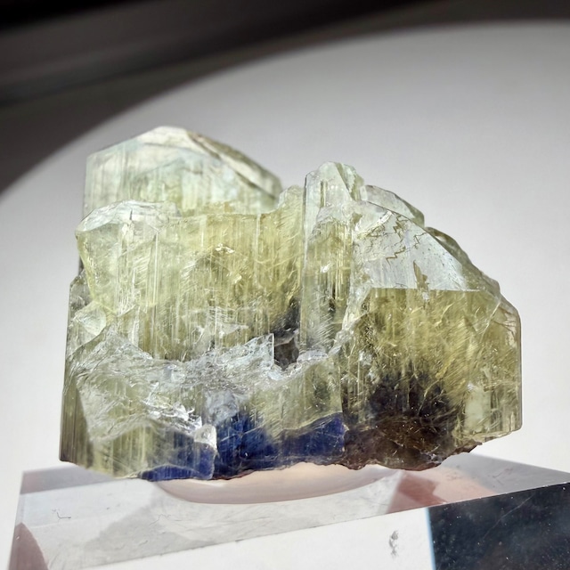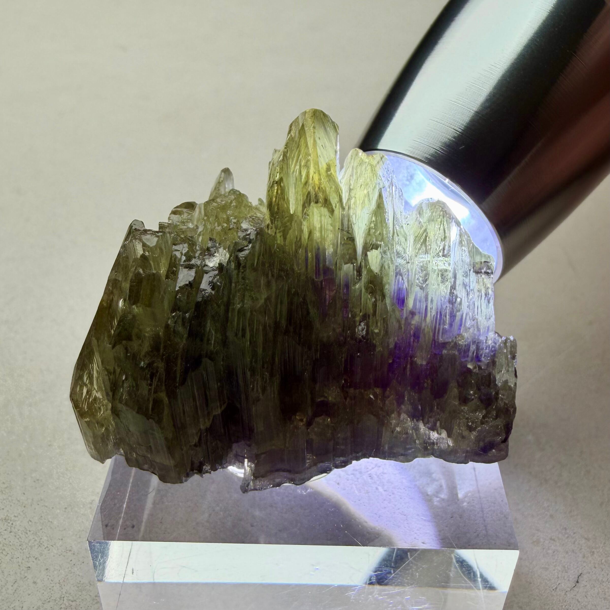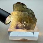 その結晶の半分以上はイエロー寄りの発色のためゾイサイト表記が妥当なのかもしれませんが、根元部分はしっかりとブルーパープルの発色が見られるため、バイカラータンザナイトと言って良さそうです。