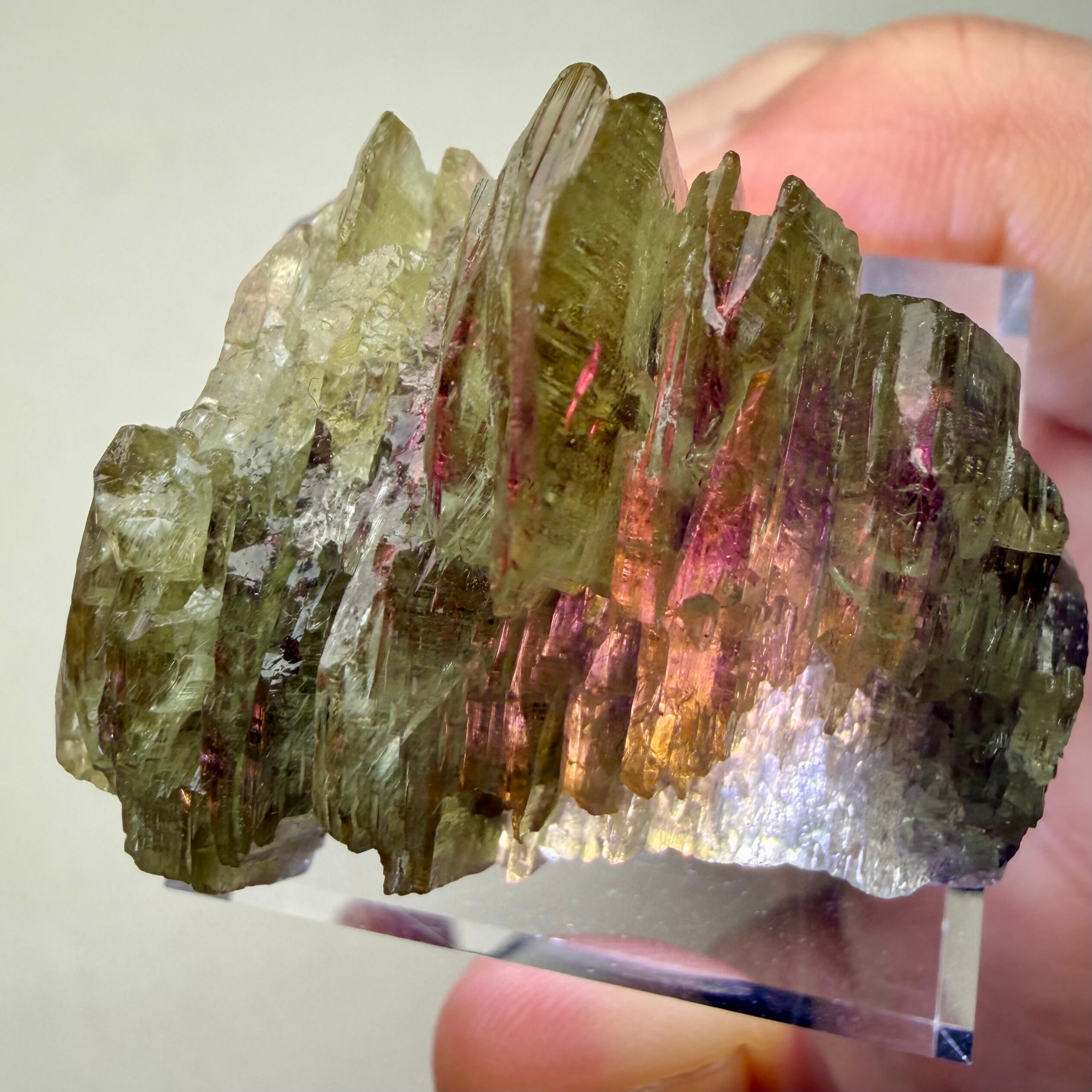 特に、結晶下部から照らすことで、上から覗き込むと鮮やかな赤い発色が見られます。