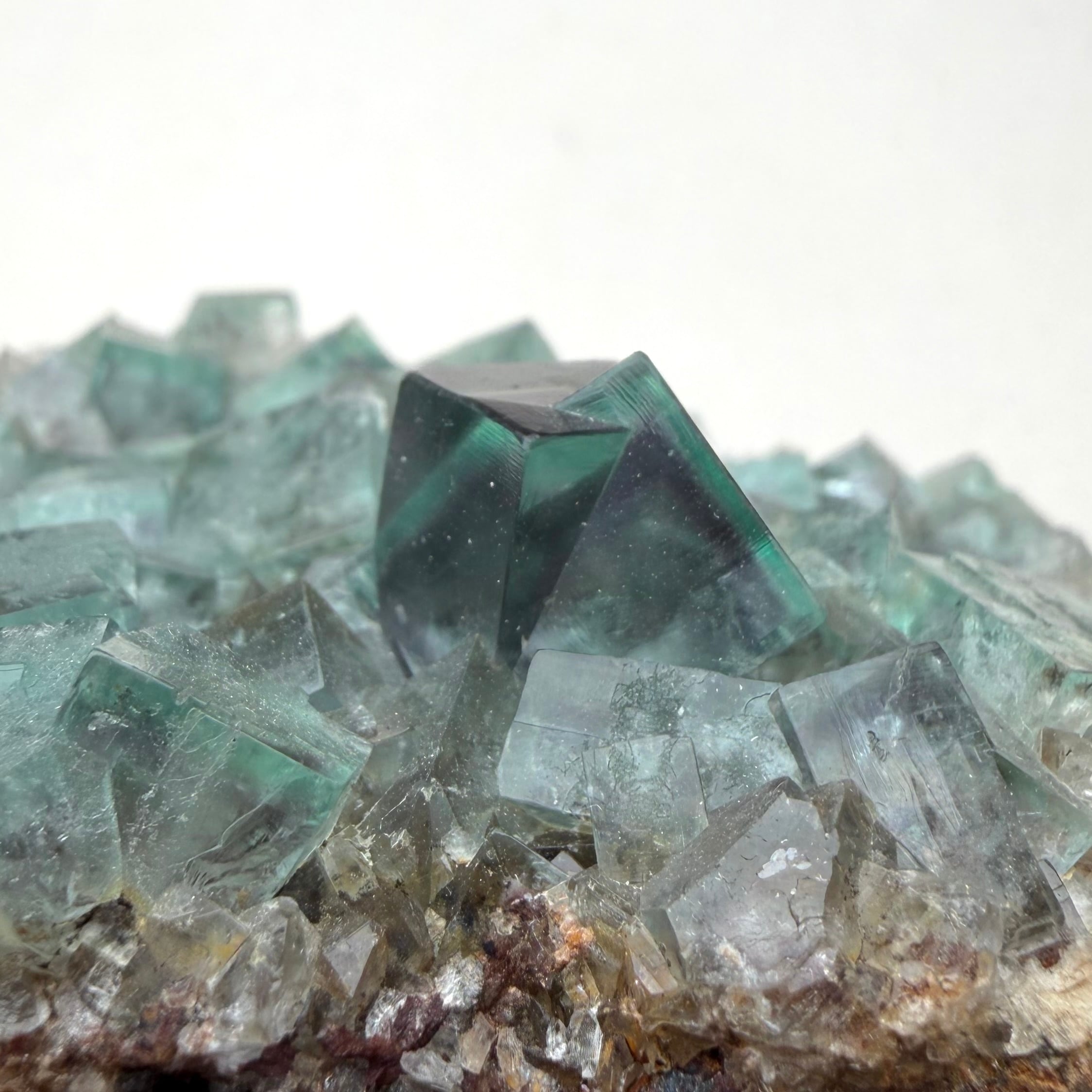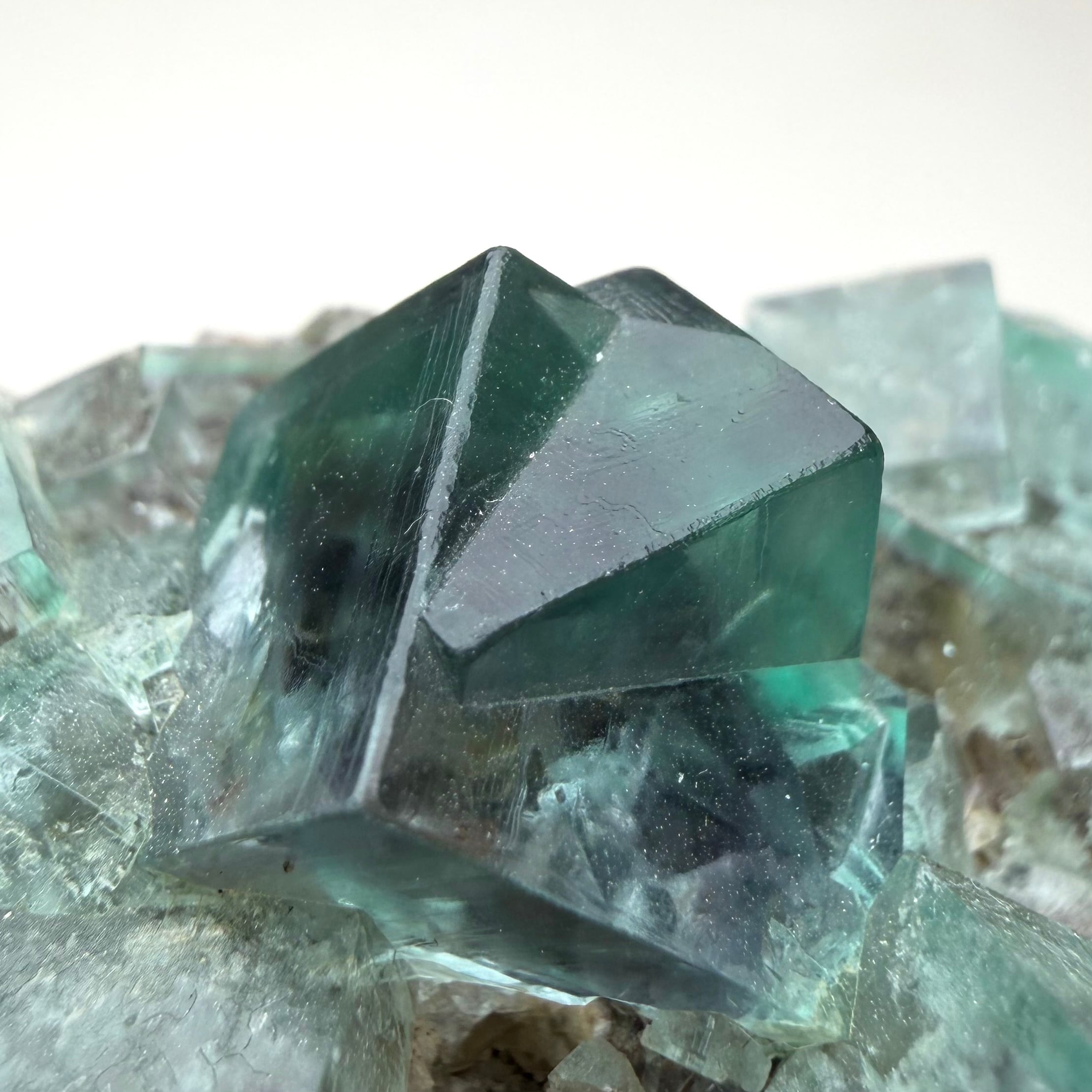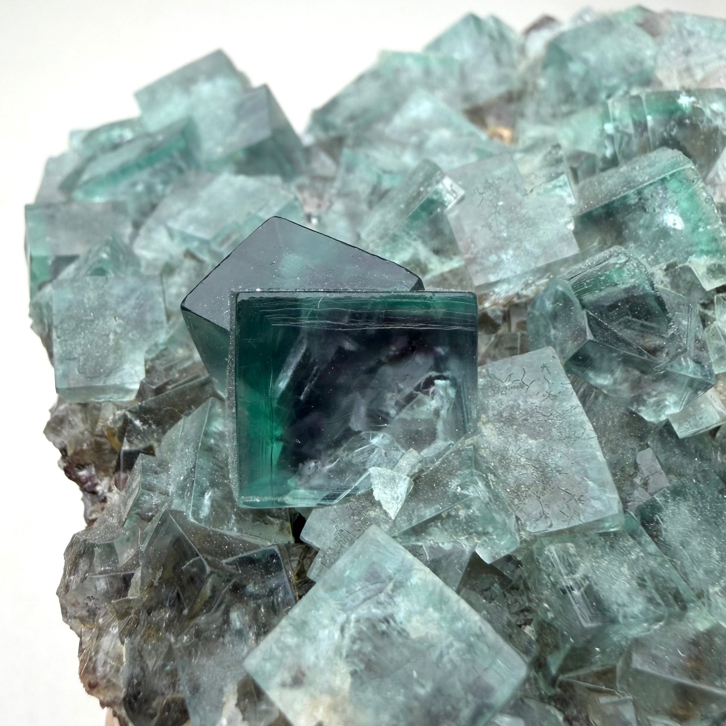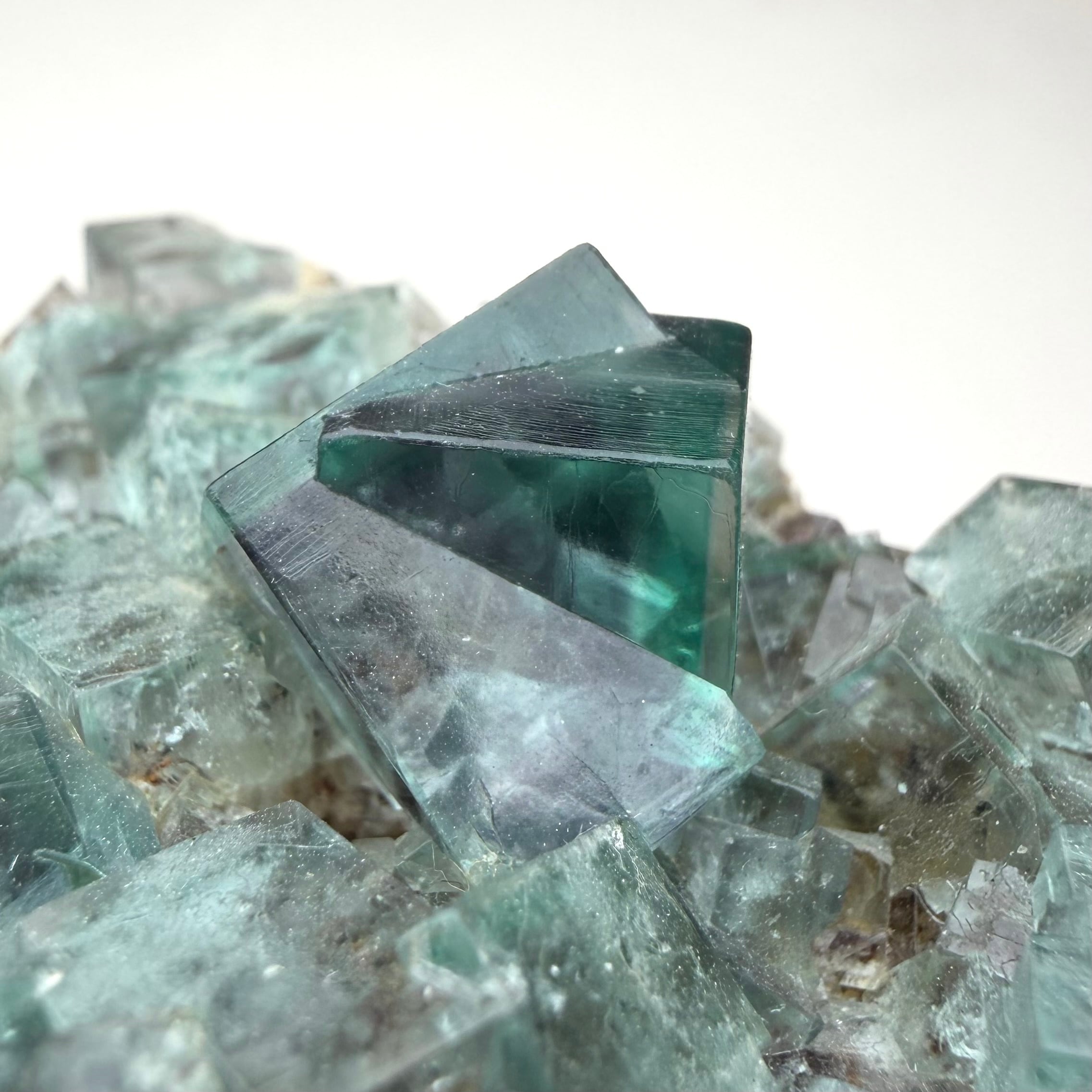 サイズ感のあるメイン結晶を中心にしたクラスターで、その他の小さな標本は結晶の面や内部が白くなったものが多い反面、Blue Circle Cement Quarryの、しっかりと大きいクラスター標本は中々見かけないため、そう言った意味でも魅力的な標本です。