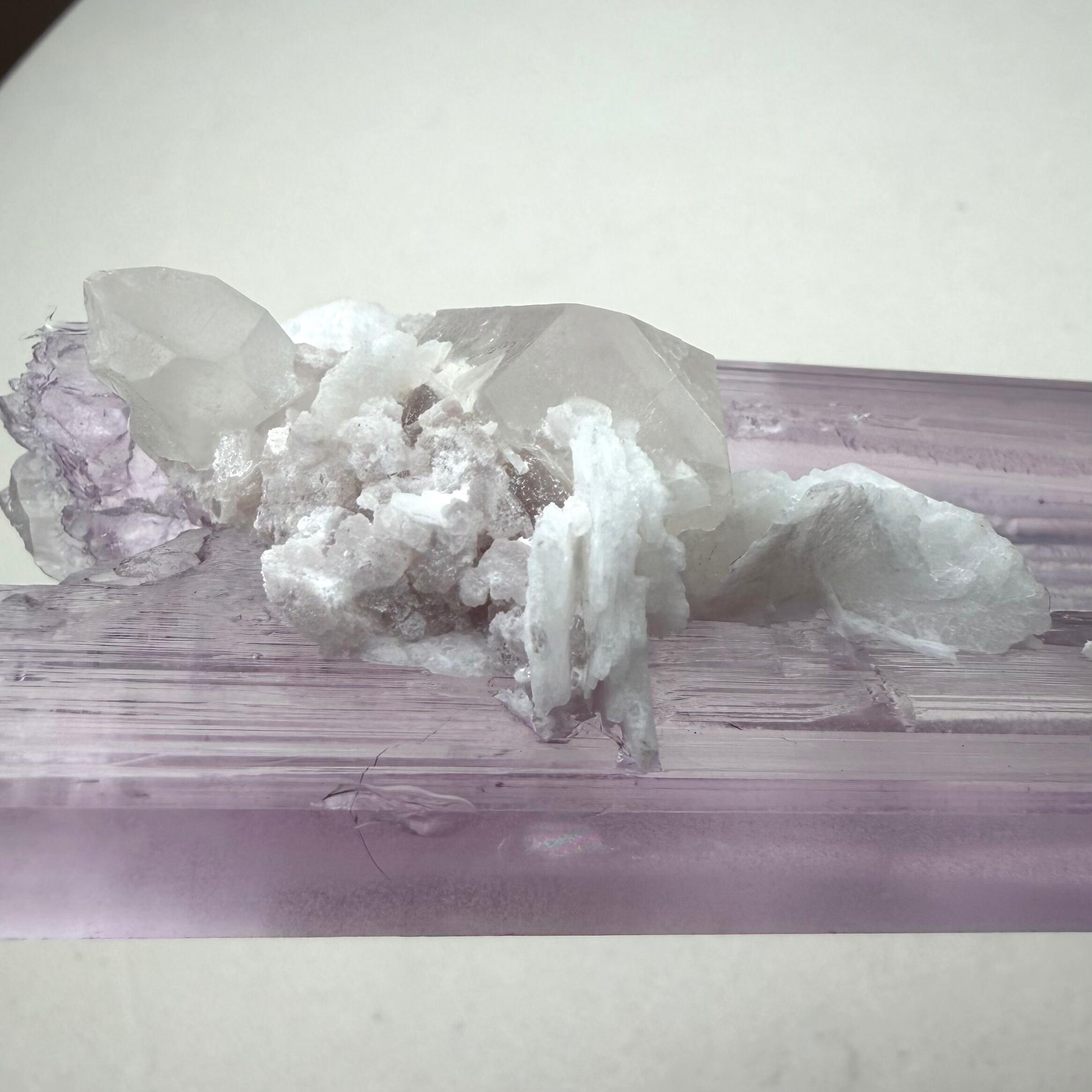 その他にもクォーツが共生、クンツァイトの中心部に穴が空いていて枠の様な状態になっていて、かつその枠の一部にナチュラルな断面が入る等々、サイズと共にユニークなポイントが複数見られる見所の多い標本です。