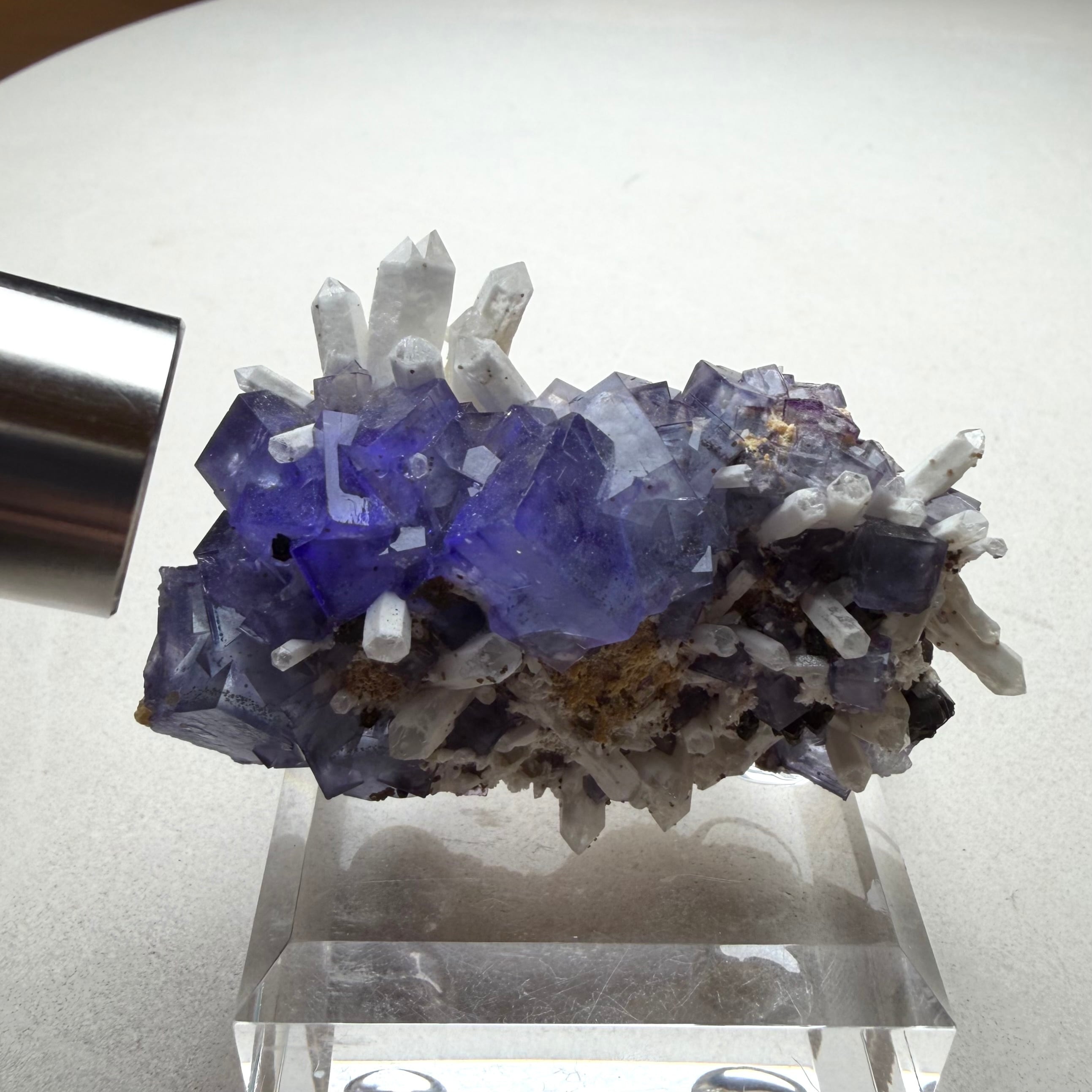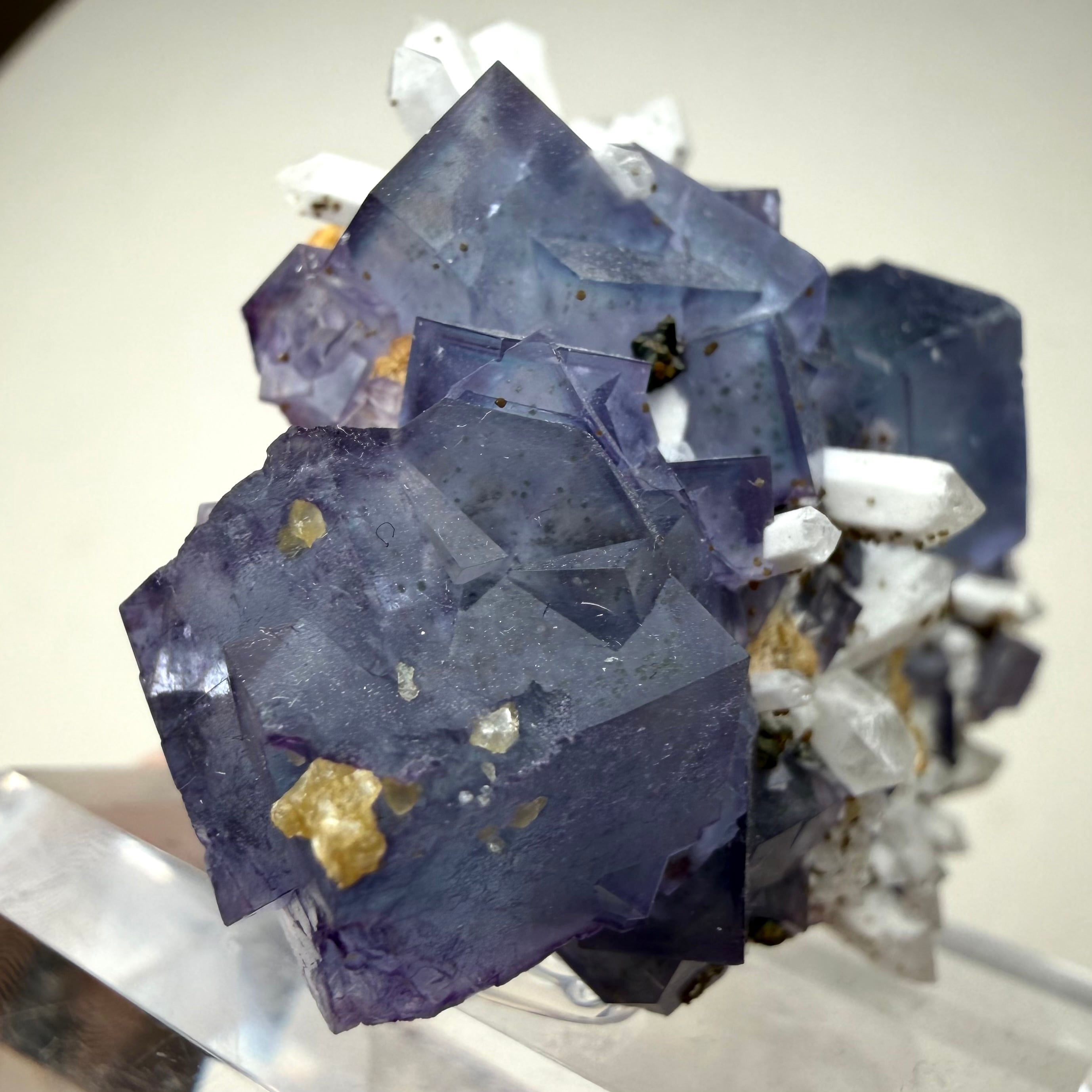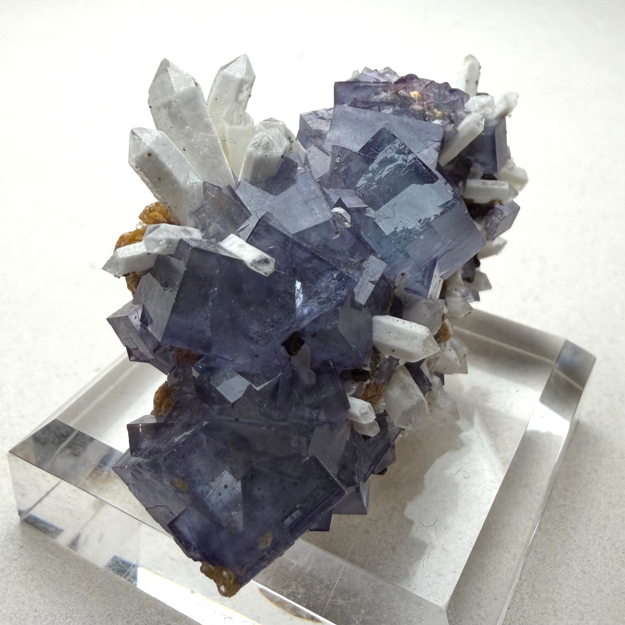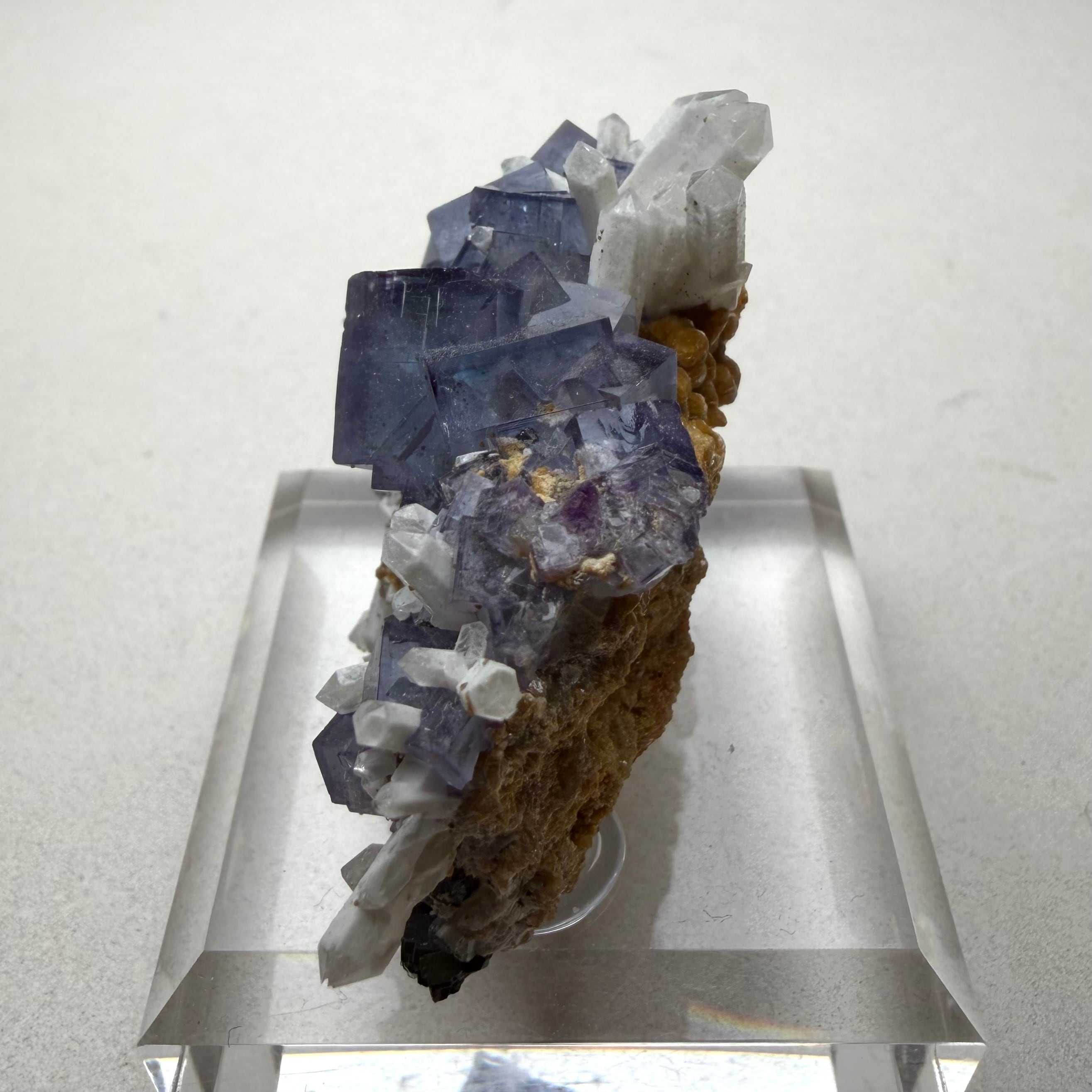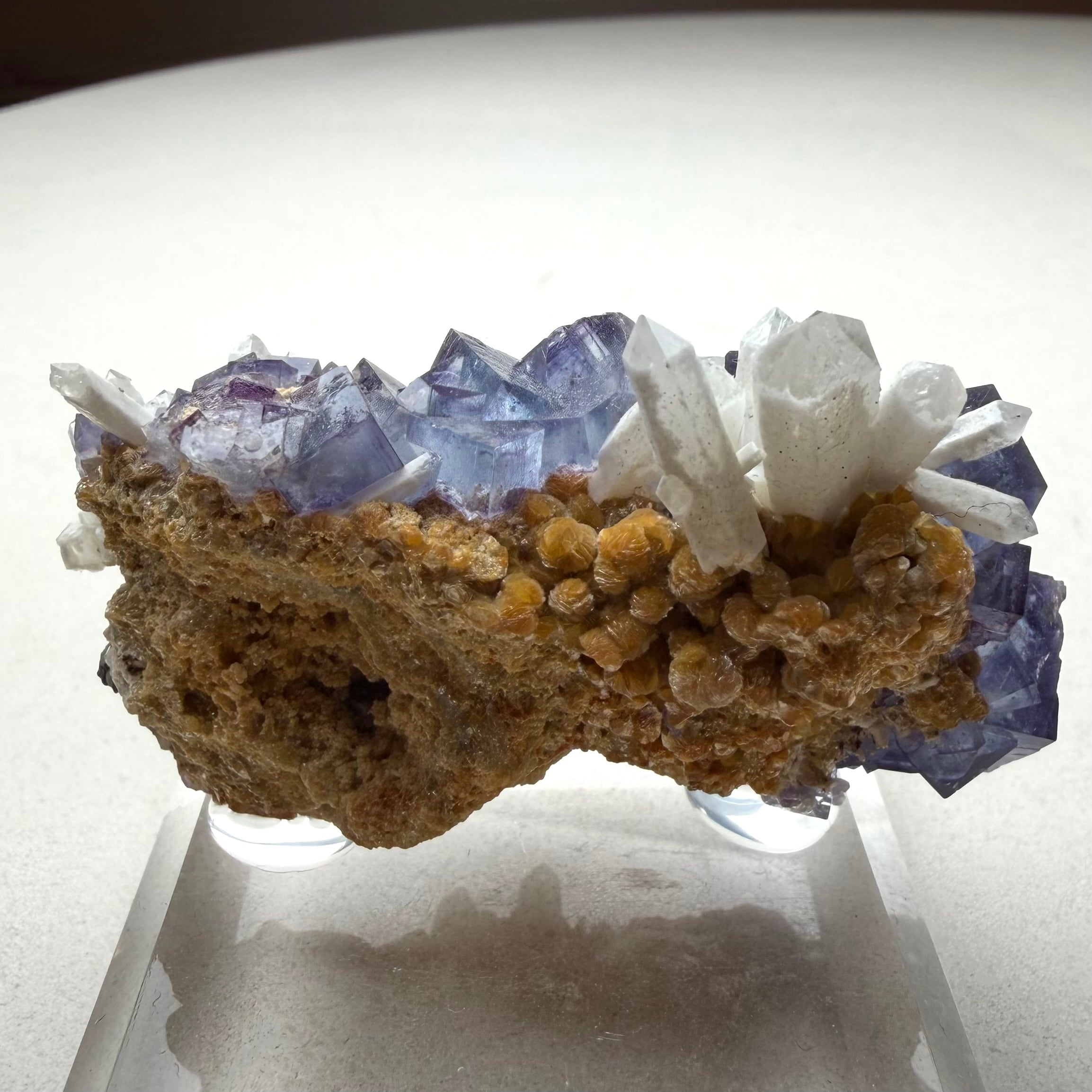 クリアで艶のあるブルーパープルのフローライトと白濁したクォーツとのバランスが良好で、状態の良さと景色の良さを併せ持った標本です。