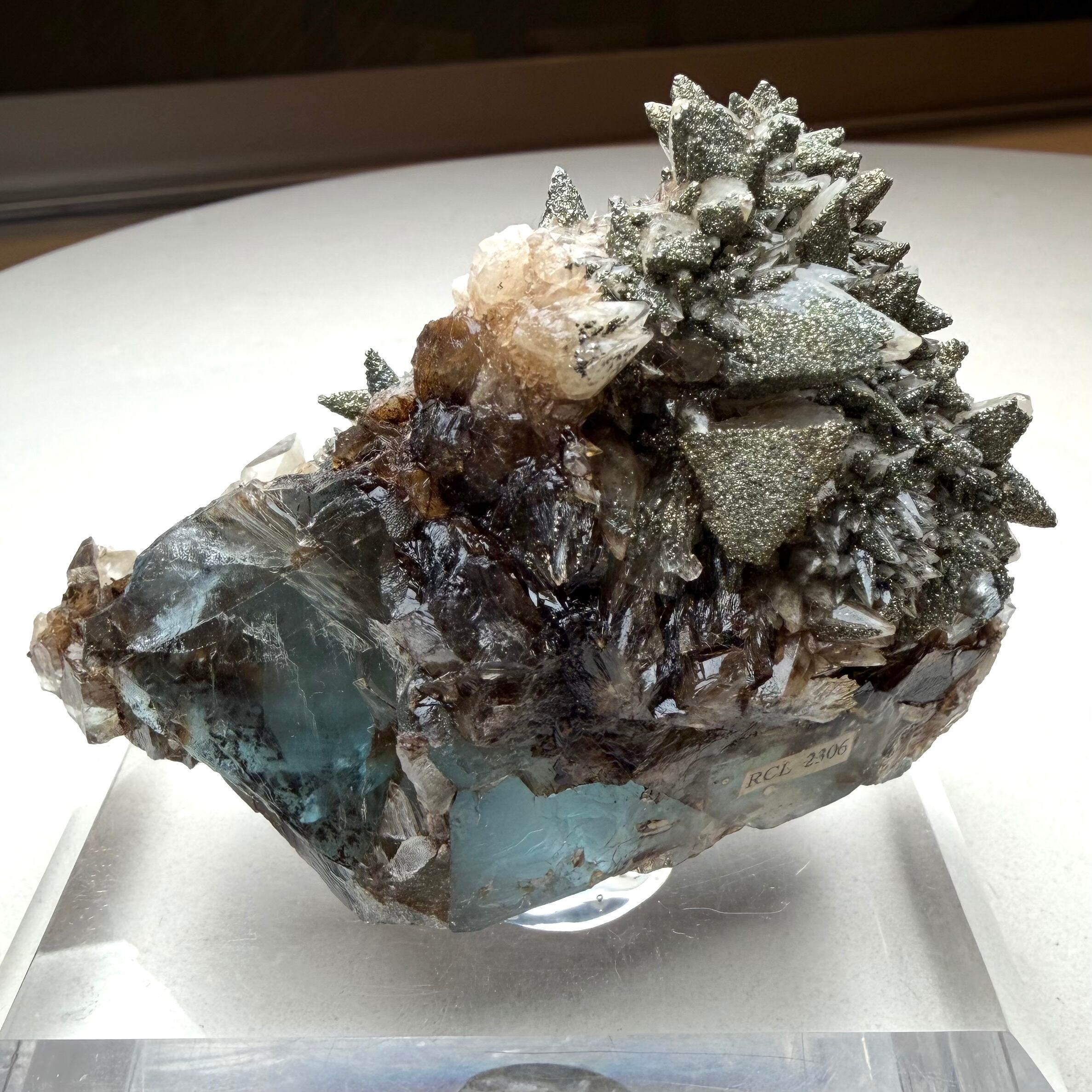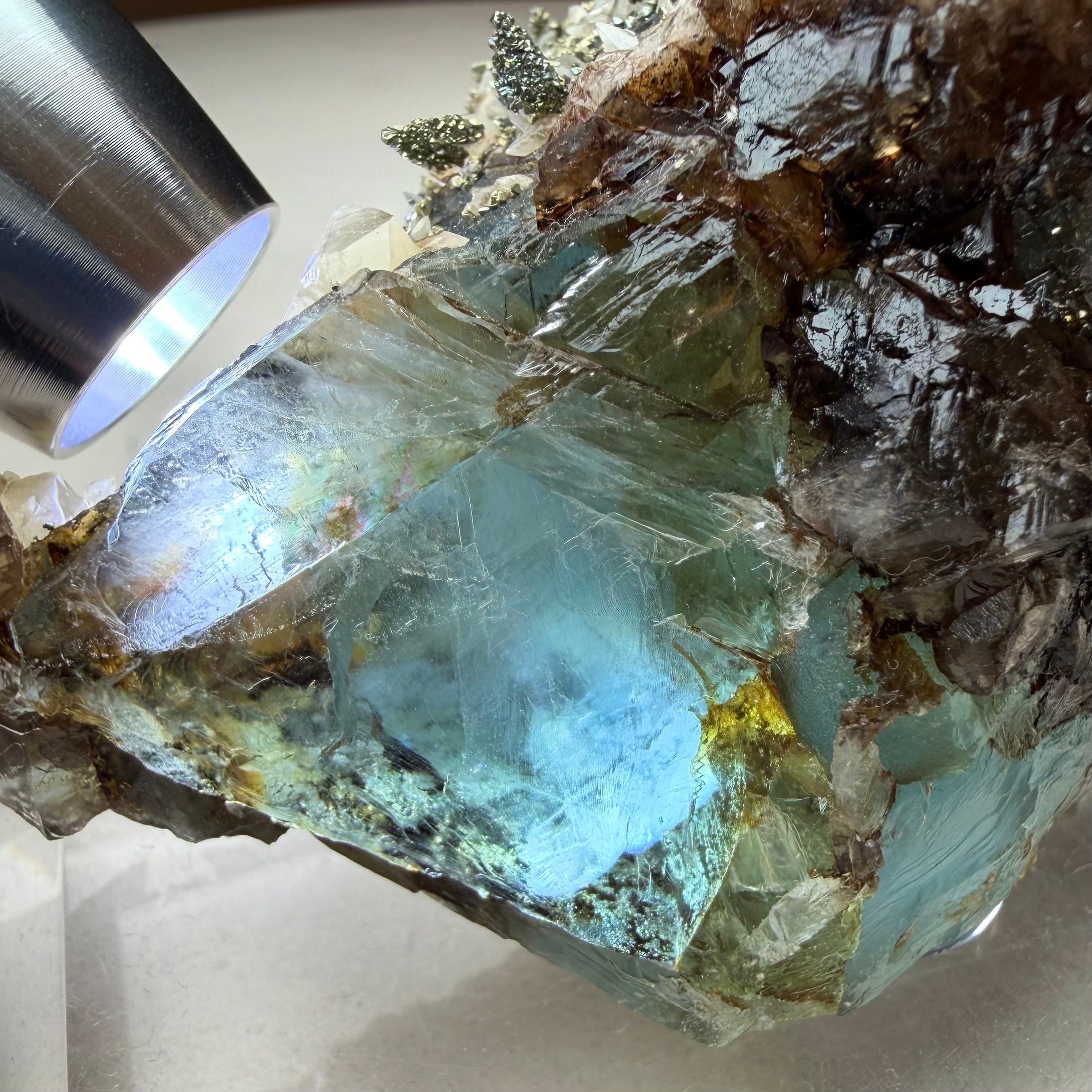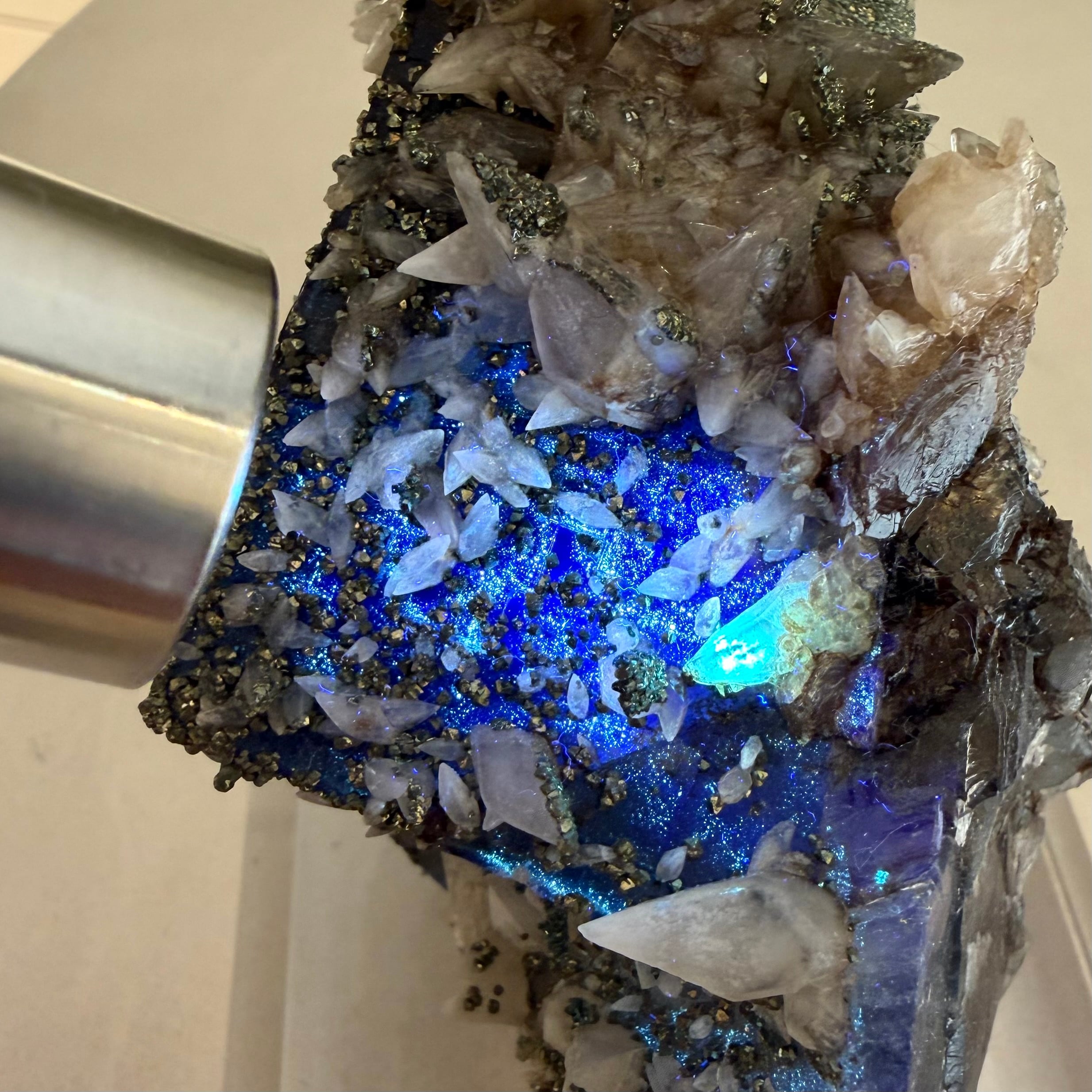 カルサイトやマーカサイト、スファレライトとのコンビネーションですが、それらがフローライトをしっかりと覆うことでフローライト自体のポテンシャルが自然光下ではどうしても隠れがちになる、ユニークですが少しもったいなさもある標本です。