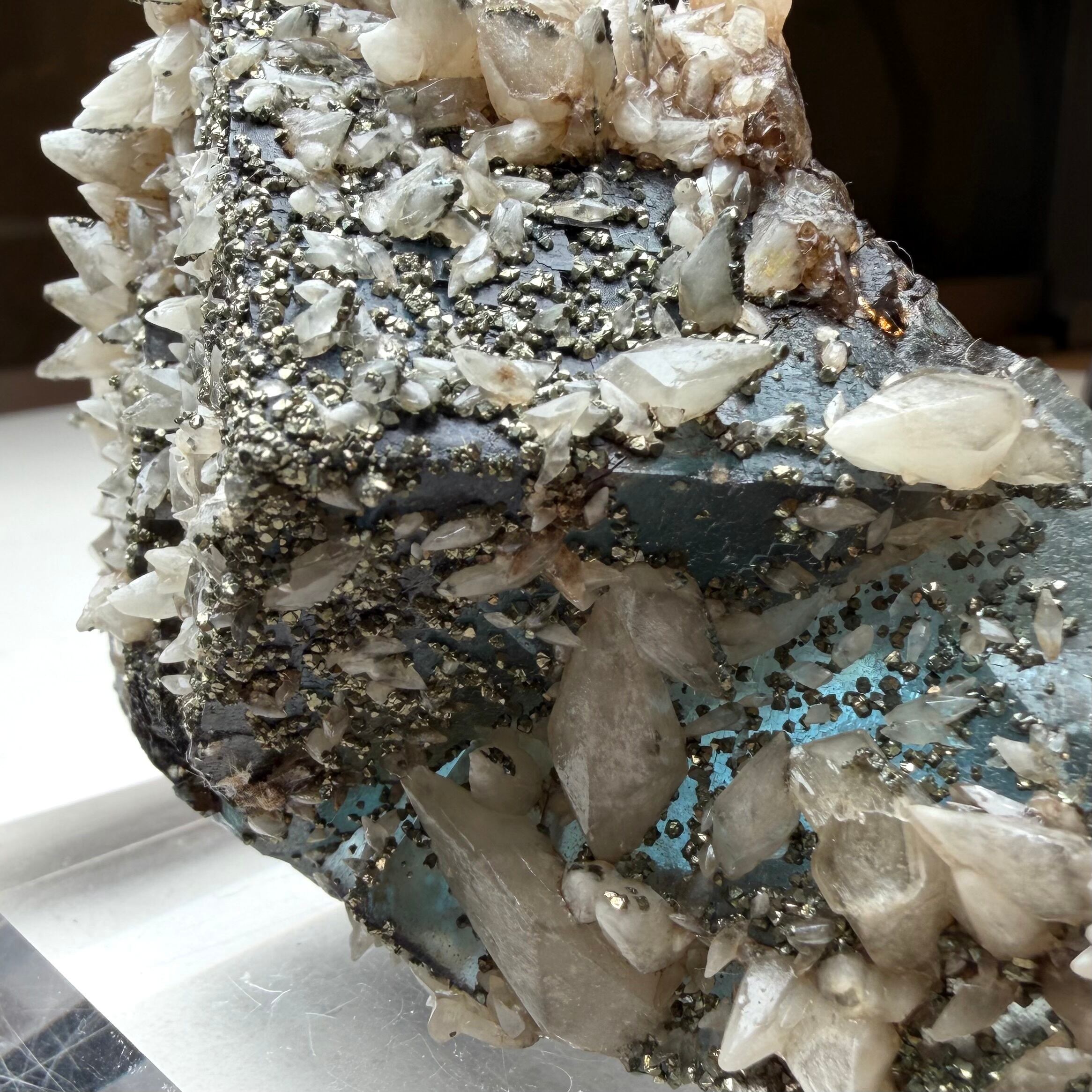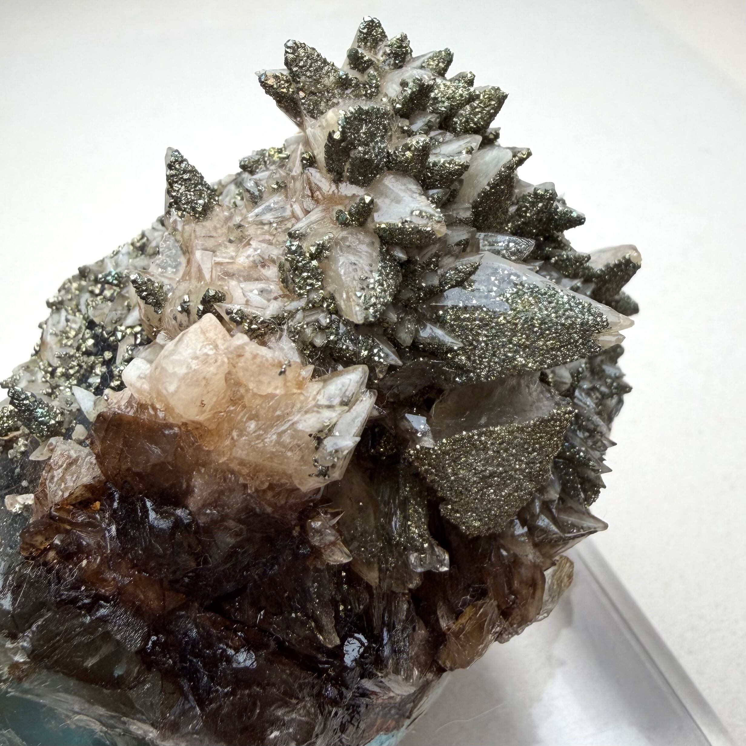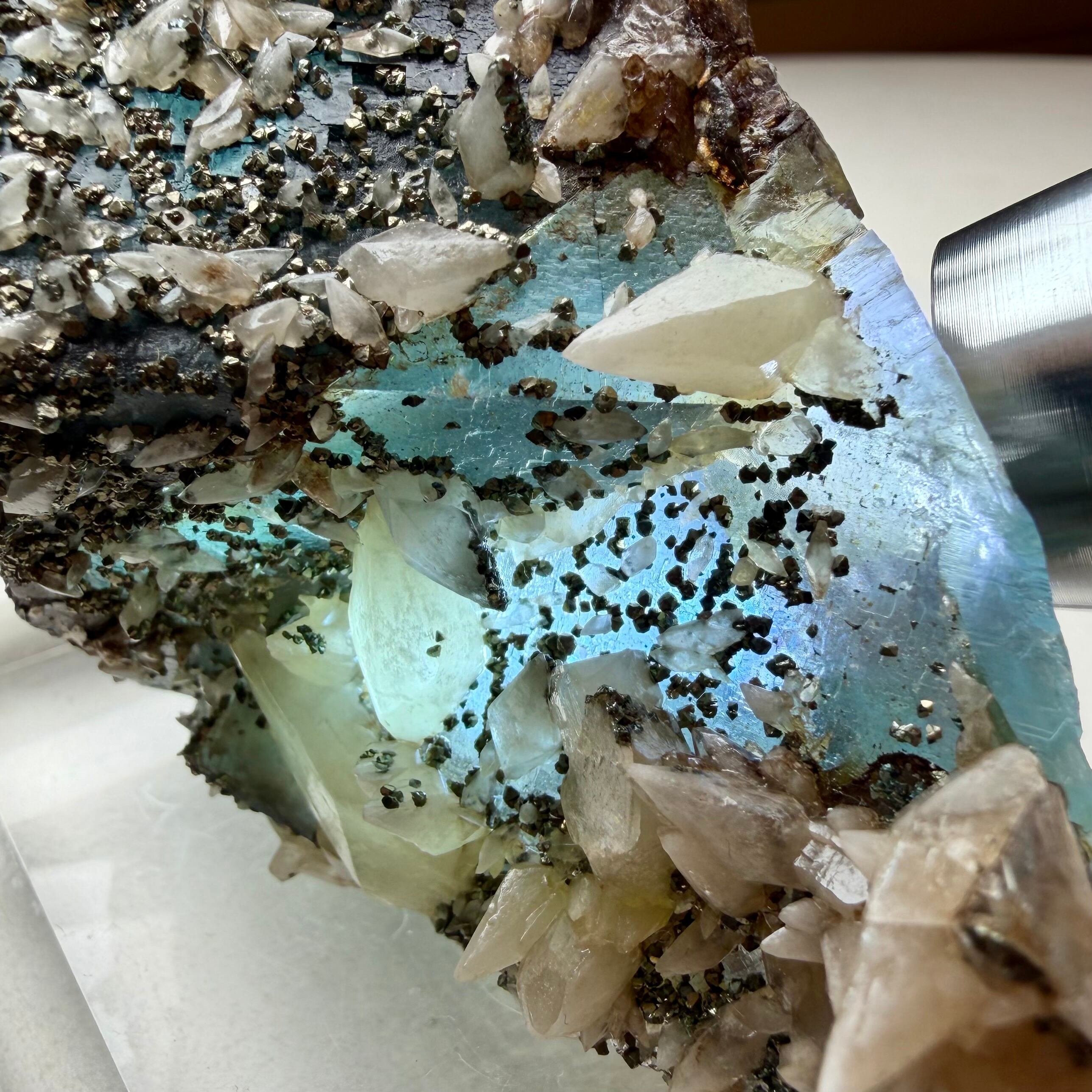 カルサイトやマーカサイト、スファレライトとのコンビネーションですが、それらがフローライトをしっかりと覆うことでフローライト自体のポテンシャルが自然光下ではどうしても隠れがちになる、ユニークですが少しもったいなさもある標本です。