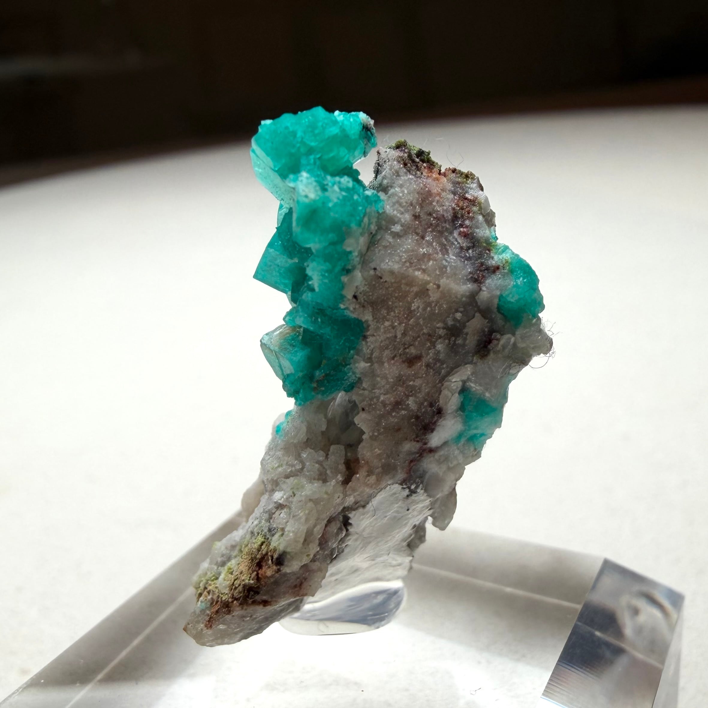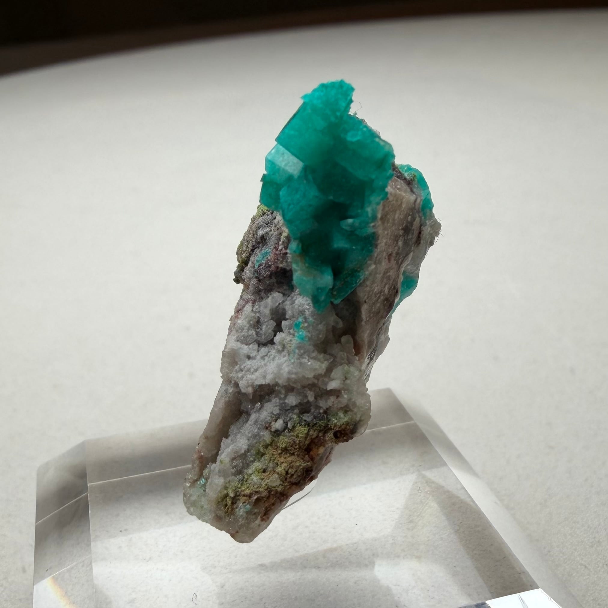 結晶と母岩とのバランスが良好で、その母岩上にはダイオプテーズとはまた違ったグリーンのダフタイトが結晶していて、グリーンのグラデーションの様な景色が楽しめます。