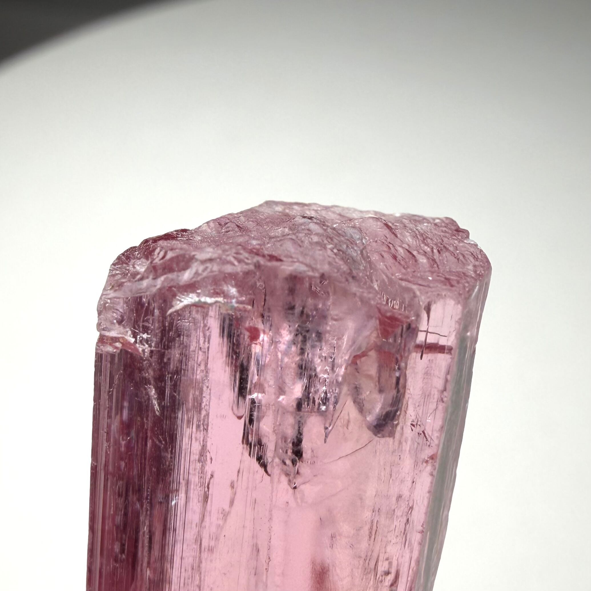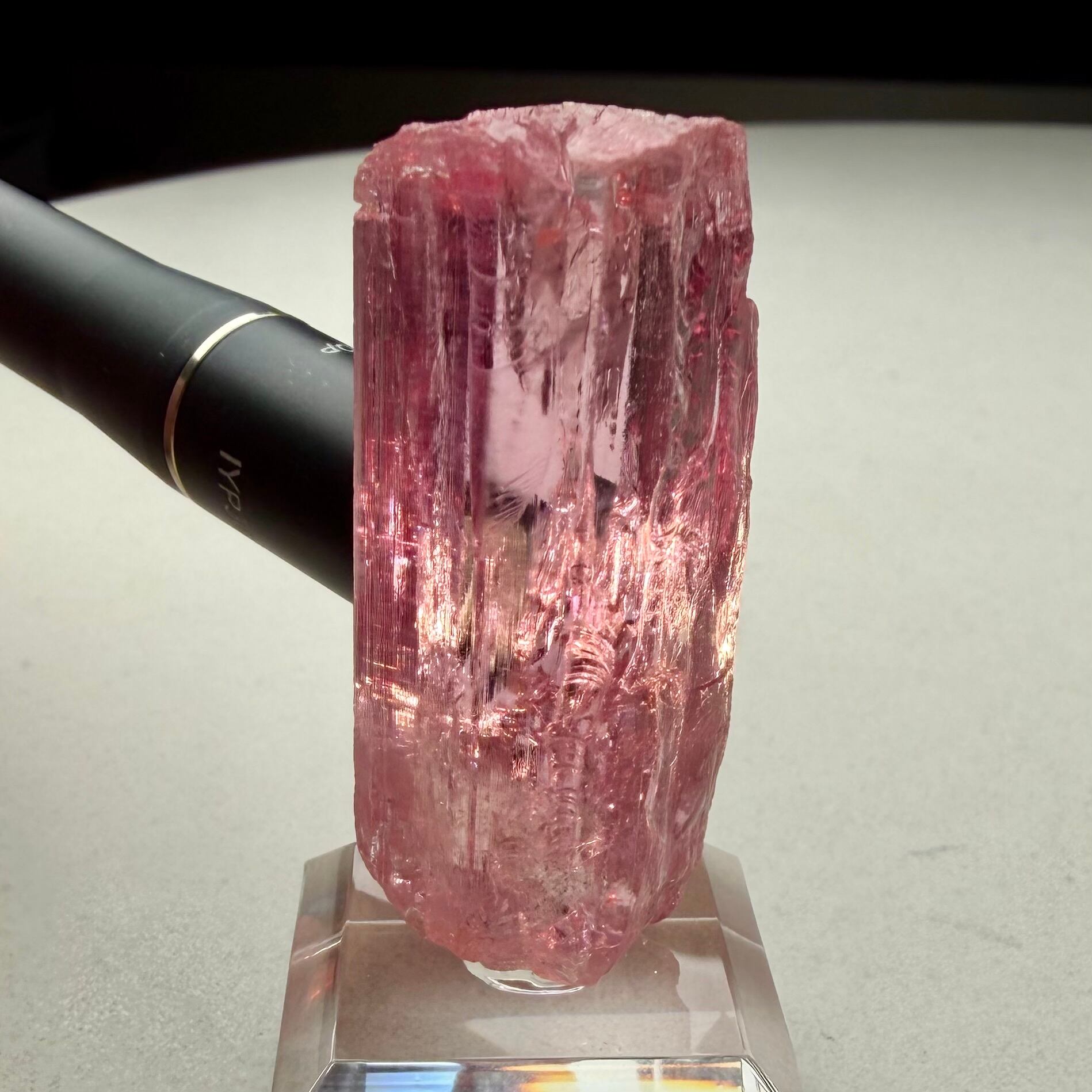 両方のトップ、それぞれに小さくダメージはありますがしっかりと結晶面のある両錐の結晶で、単結晶として高さが47ミリ、厚みも20ミリ近くそれぞれある、ピンクトパーズとしてはかなりのサイズ感を誇ります。