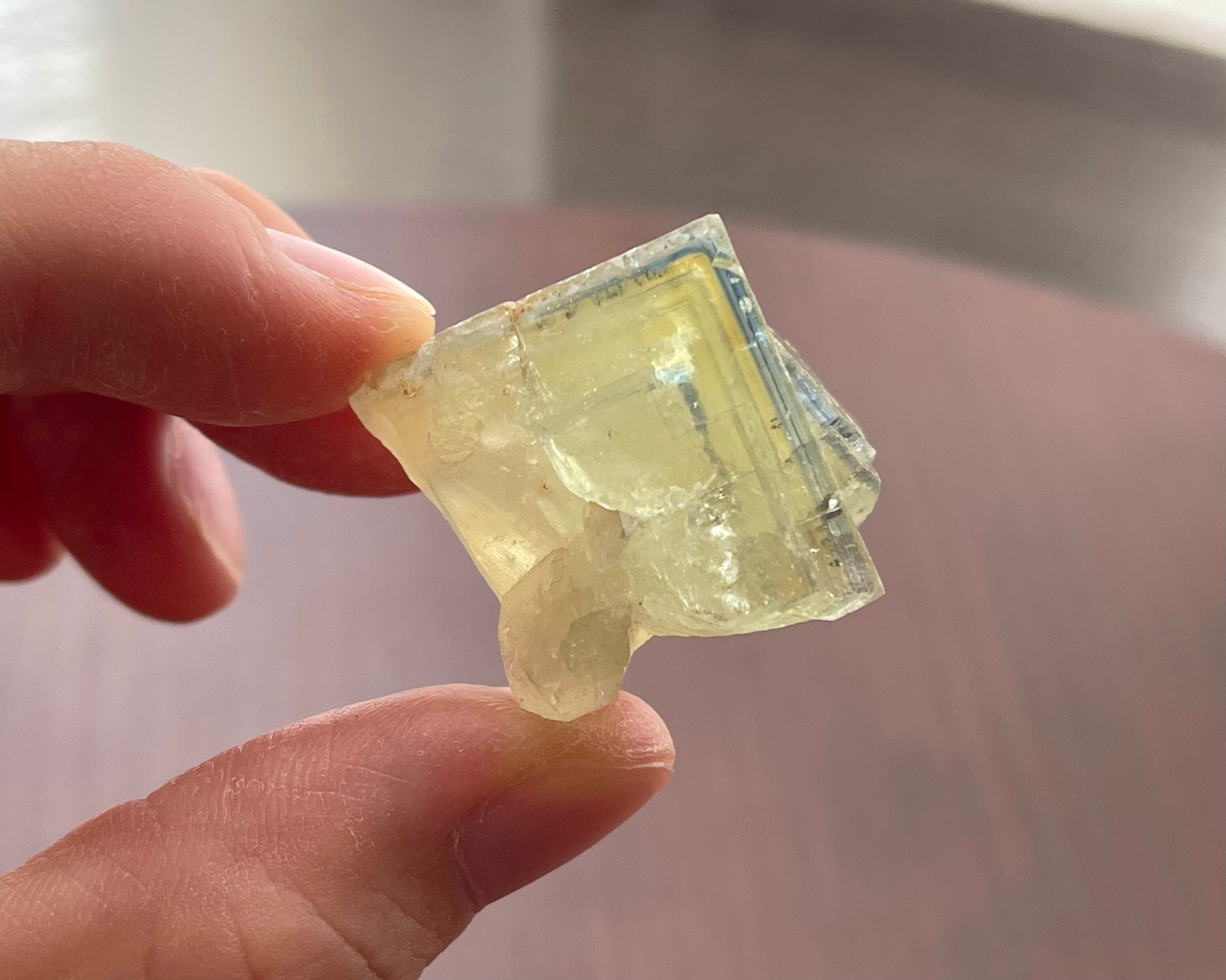 淡いイエローにブルーのゾーニングが何層にも入る、よく見るとユニークさが際立つ結晶です。