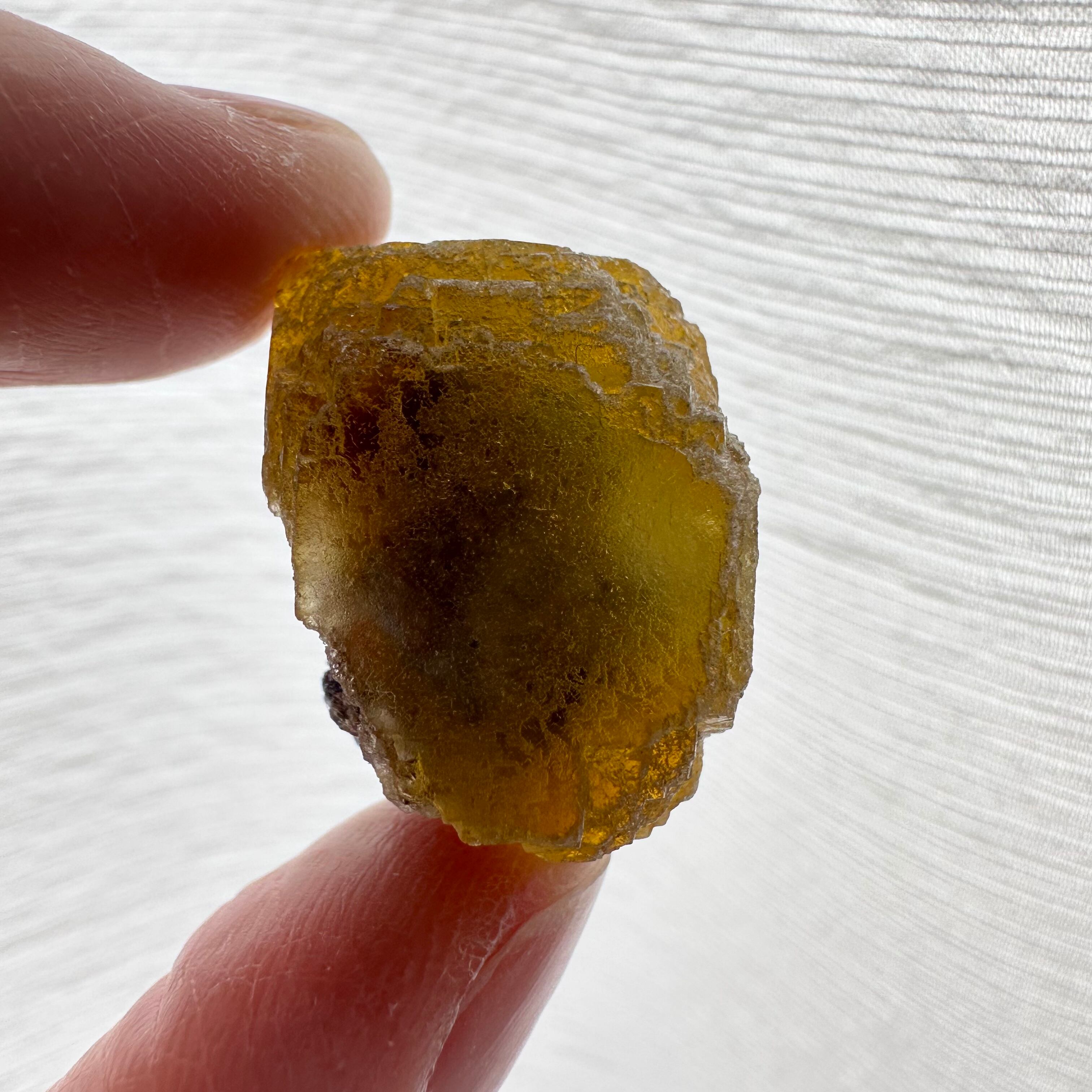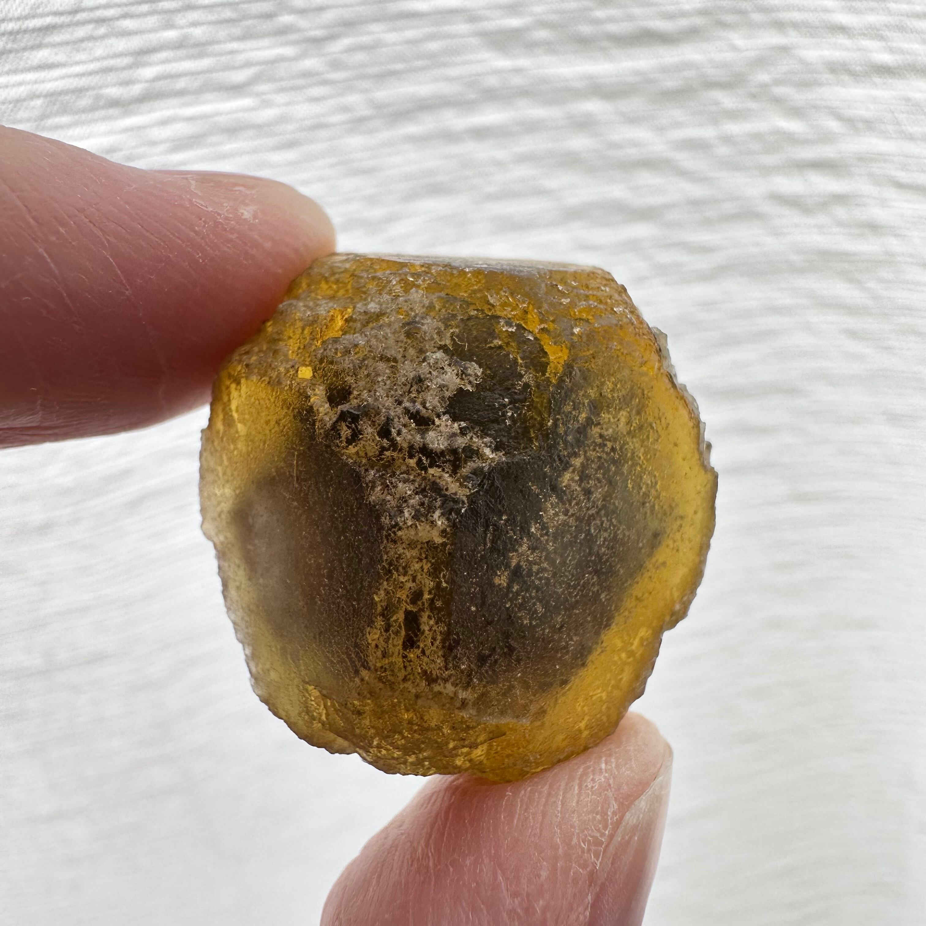 透過光下でパープルコアとブルーがかったファントムが見られるナミビア産のイエローフローライトです。