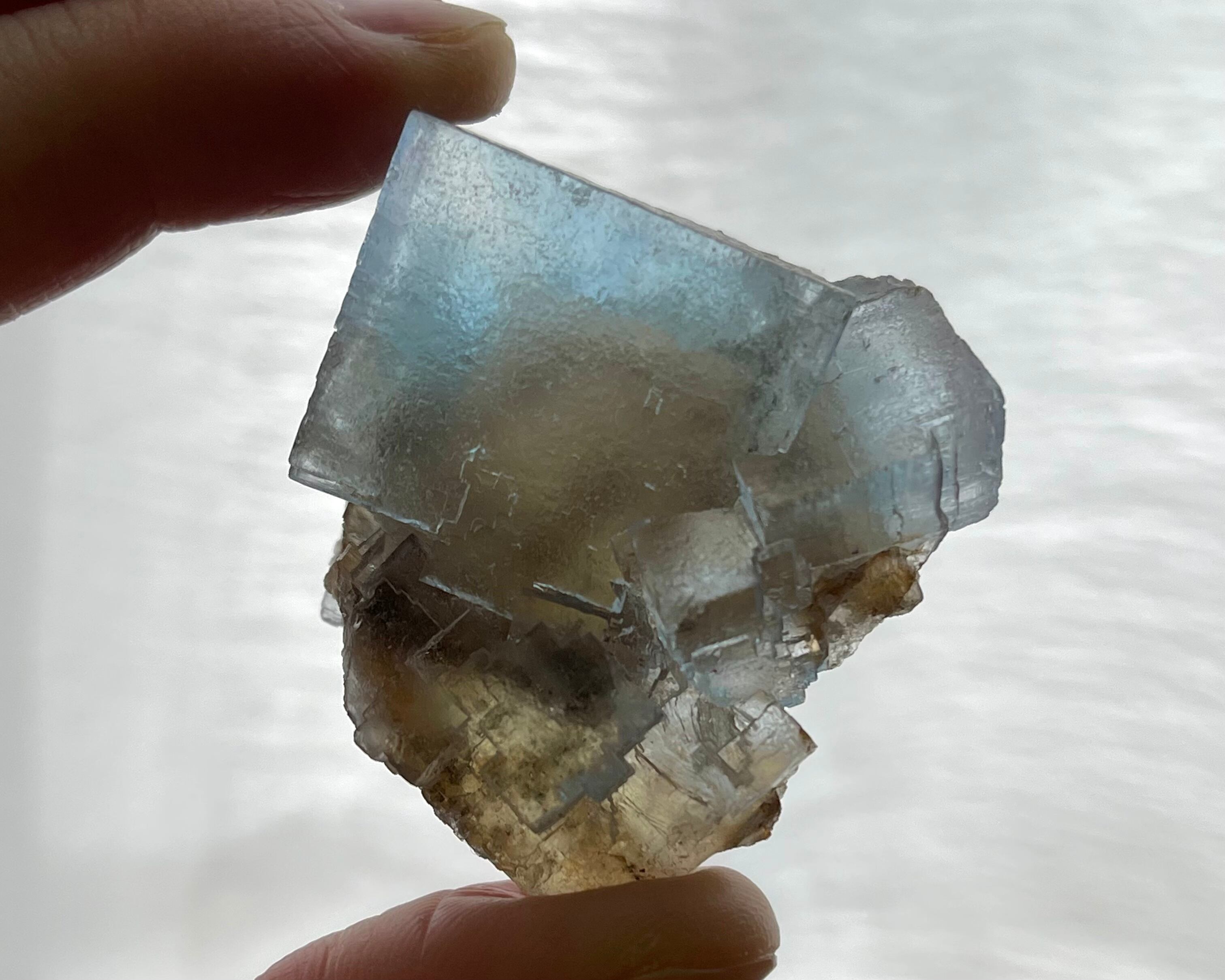 淡くも爽やかなスカイブルーとイエローコアが見られる、形状も美しいイリノイのフローライトです。