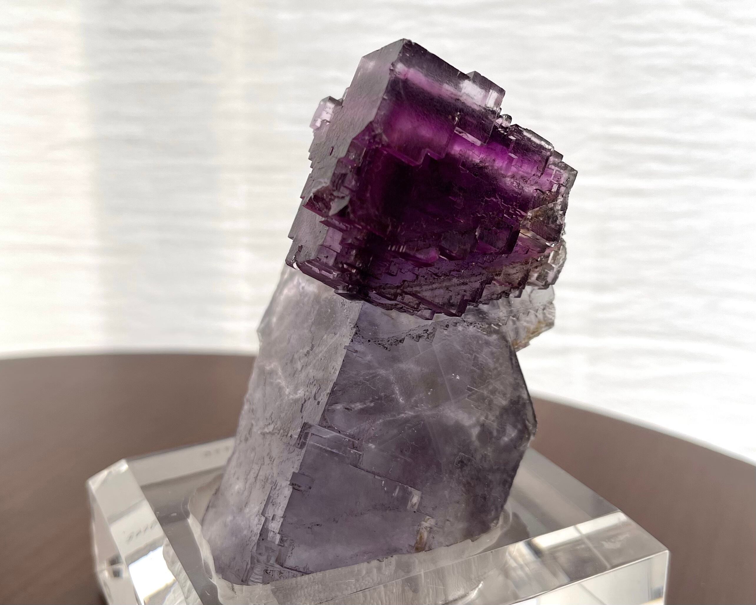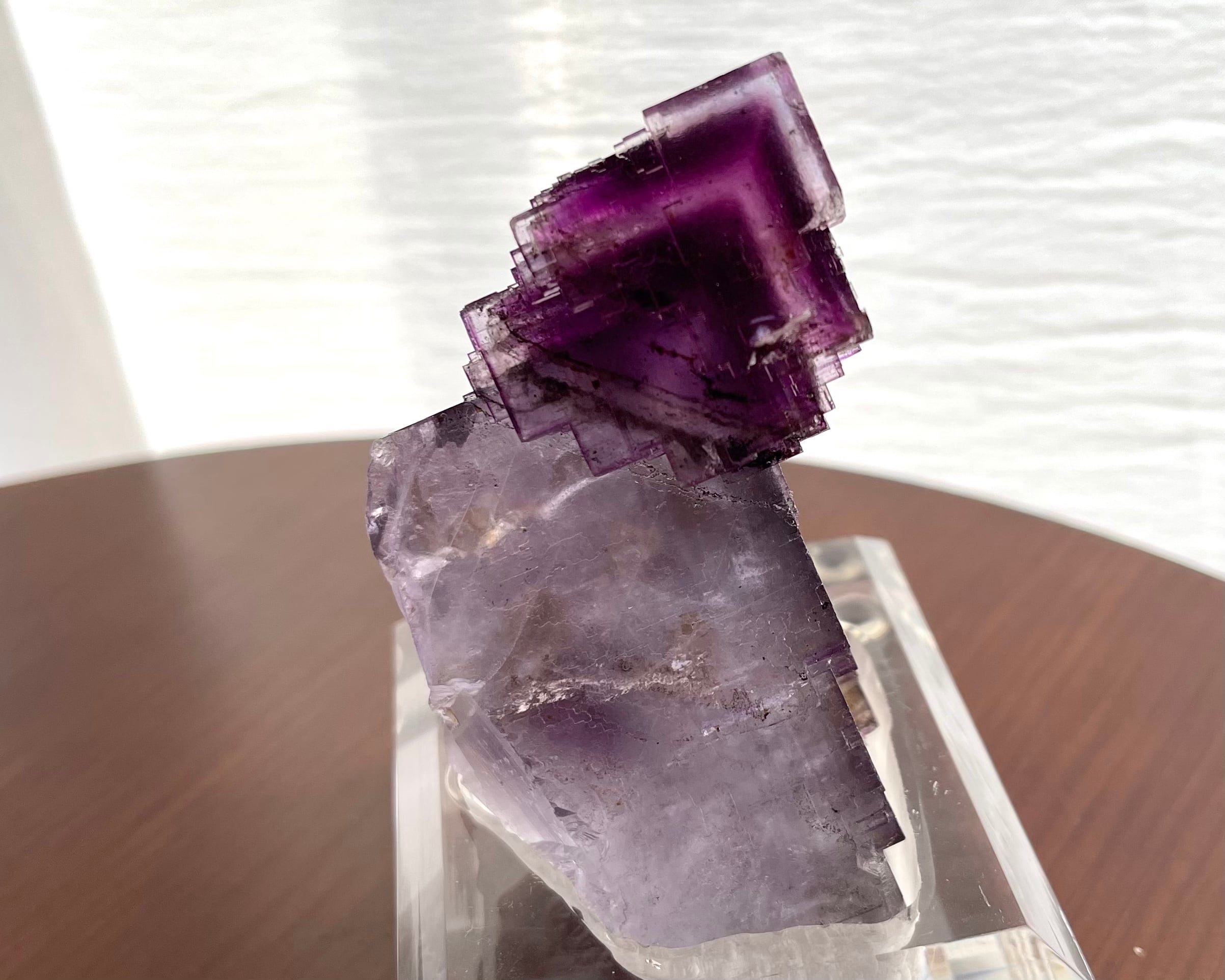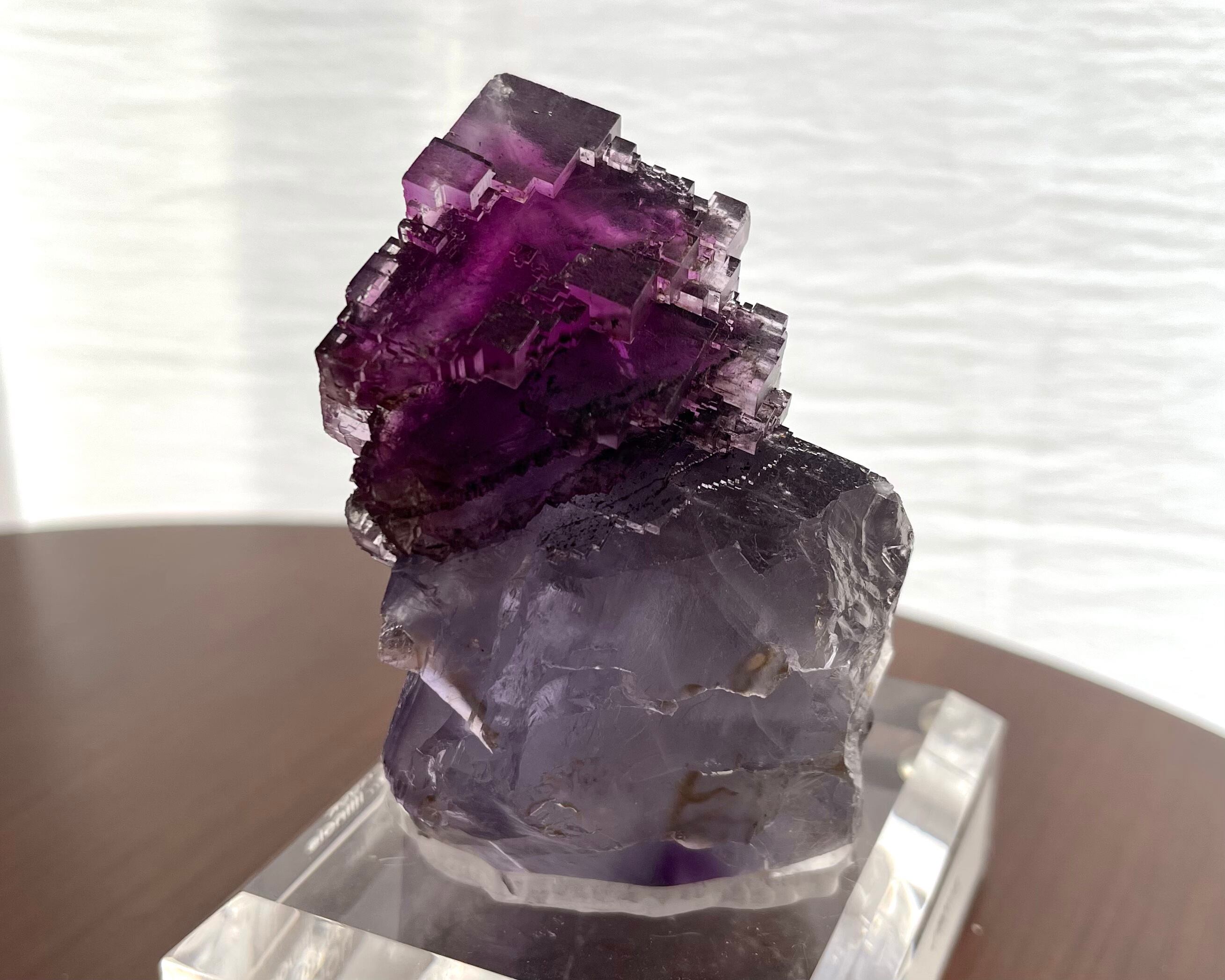 また、上の結晶は濃いパープルながらも非常にクリアで、光の当たり方によってはワインレッドの様な色合いもあり、そこに太いゾーニングや幾何学的な表面の凹凸が重なる事で唯一無二の景色となっています。