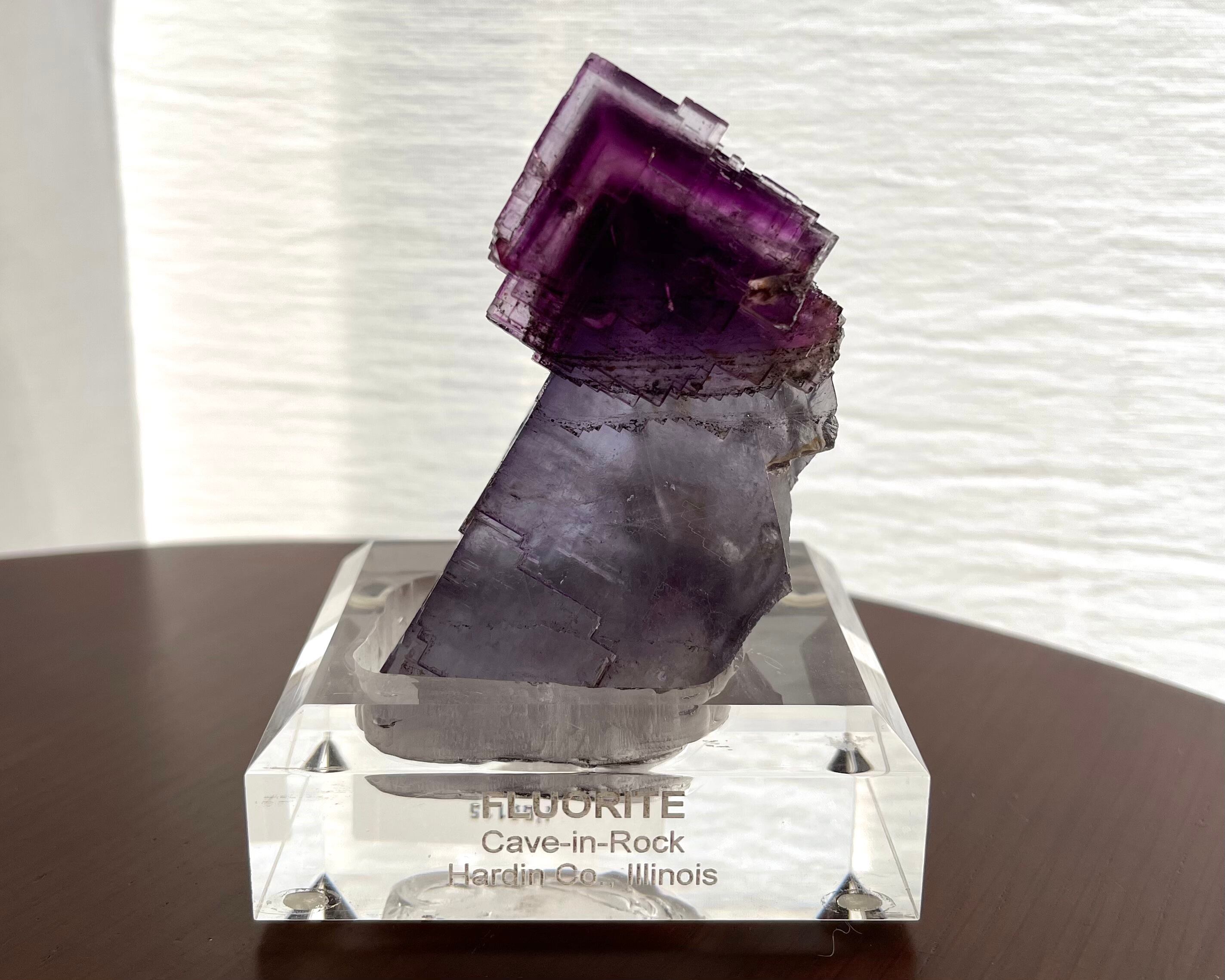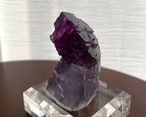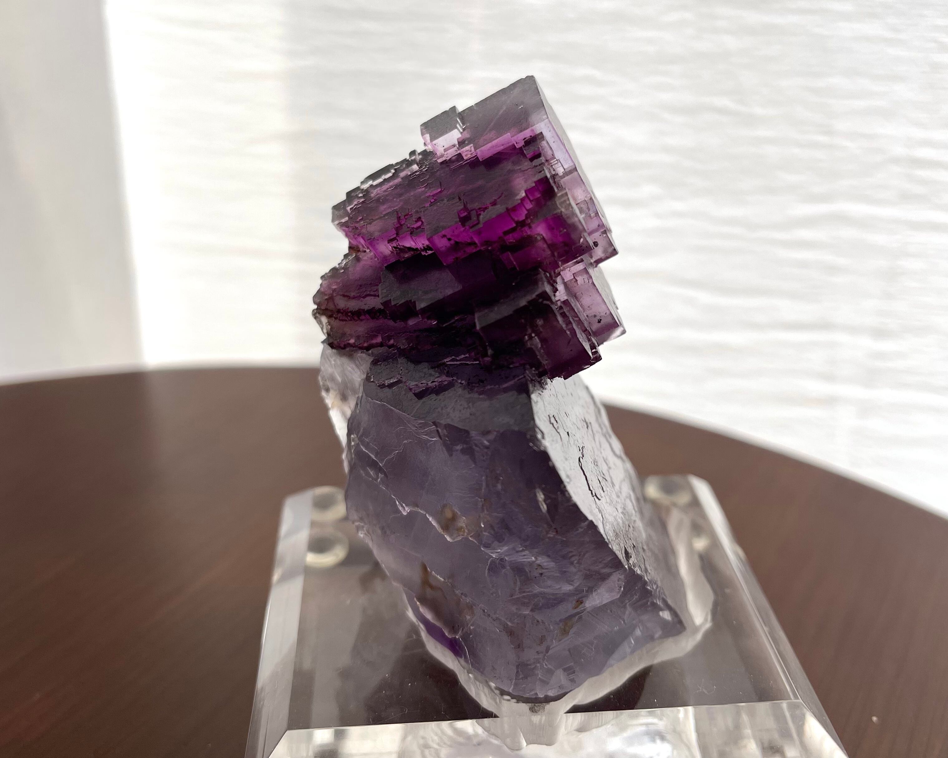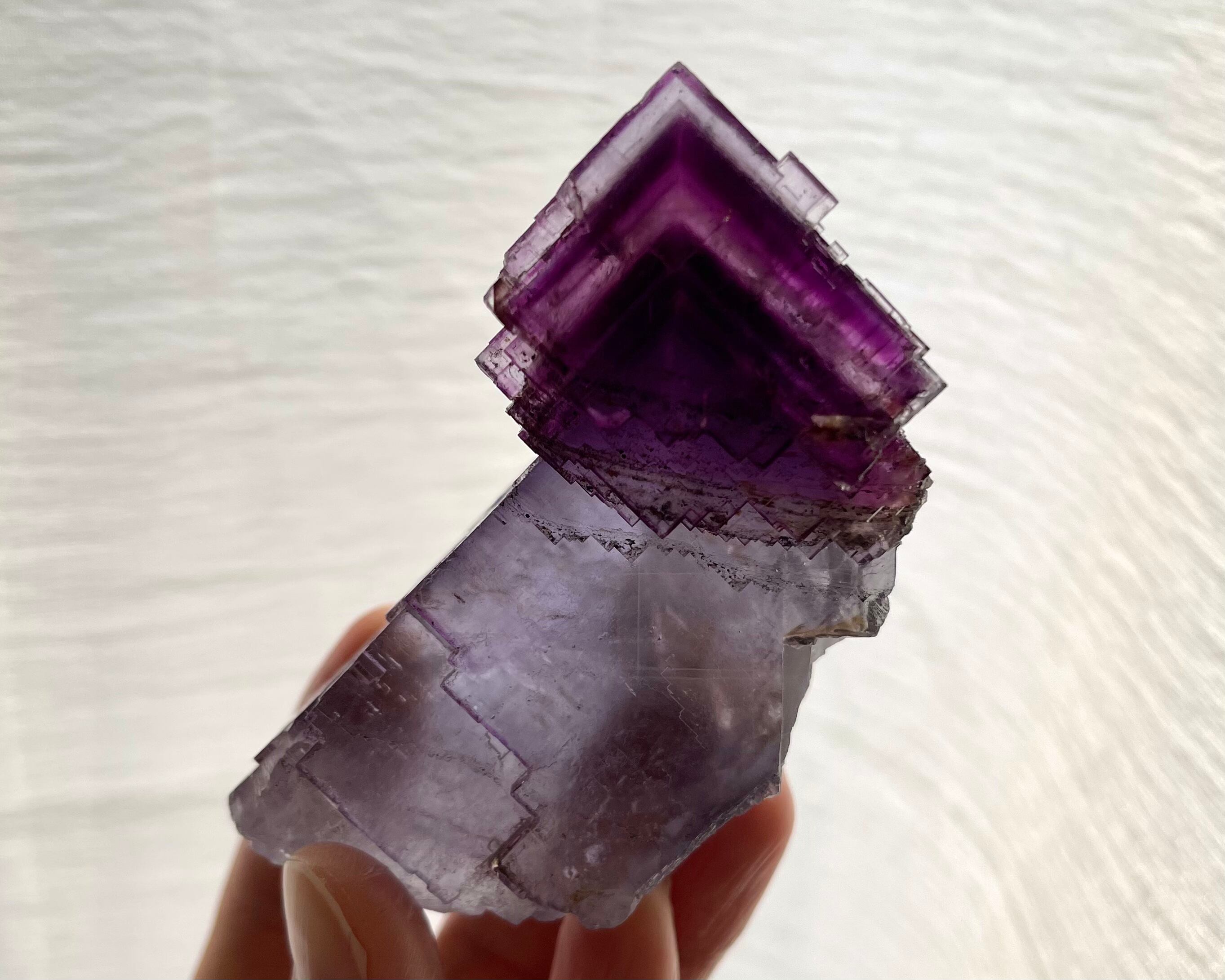 また、上の結晶は濃いパープルながらも非常にクリアで、光の当たり方によってはワインレッドの様な色合いもあり、そこに太いゾーニングや幾何学的な表面の凹凸が重なる事で唯一無二の景色となっています。