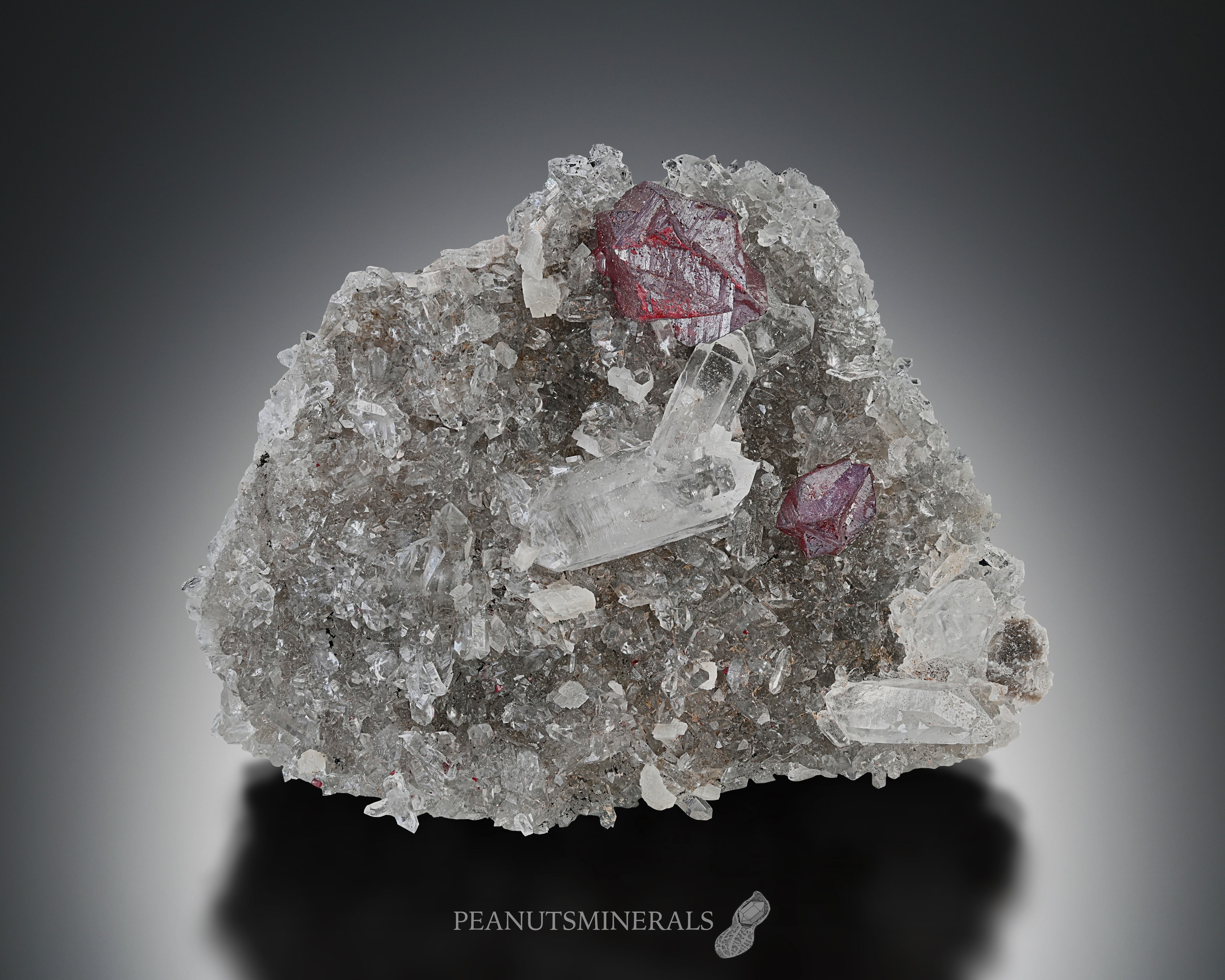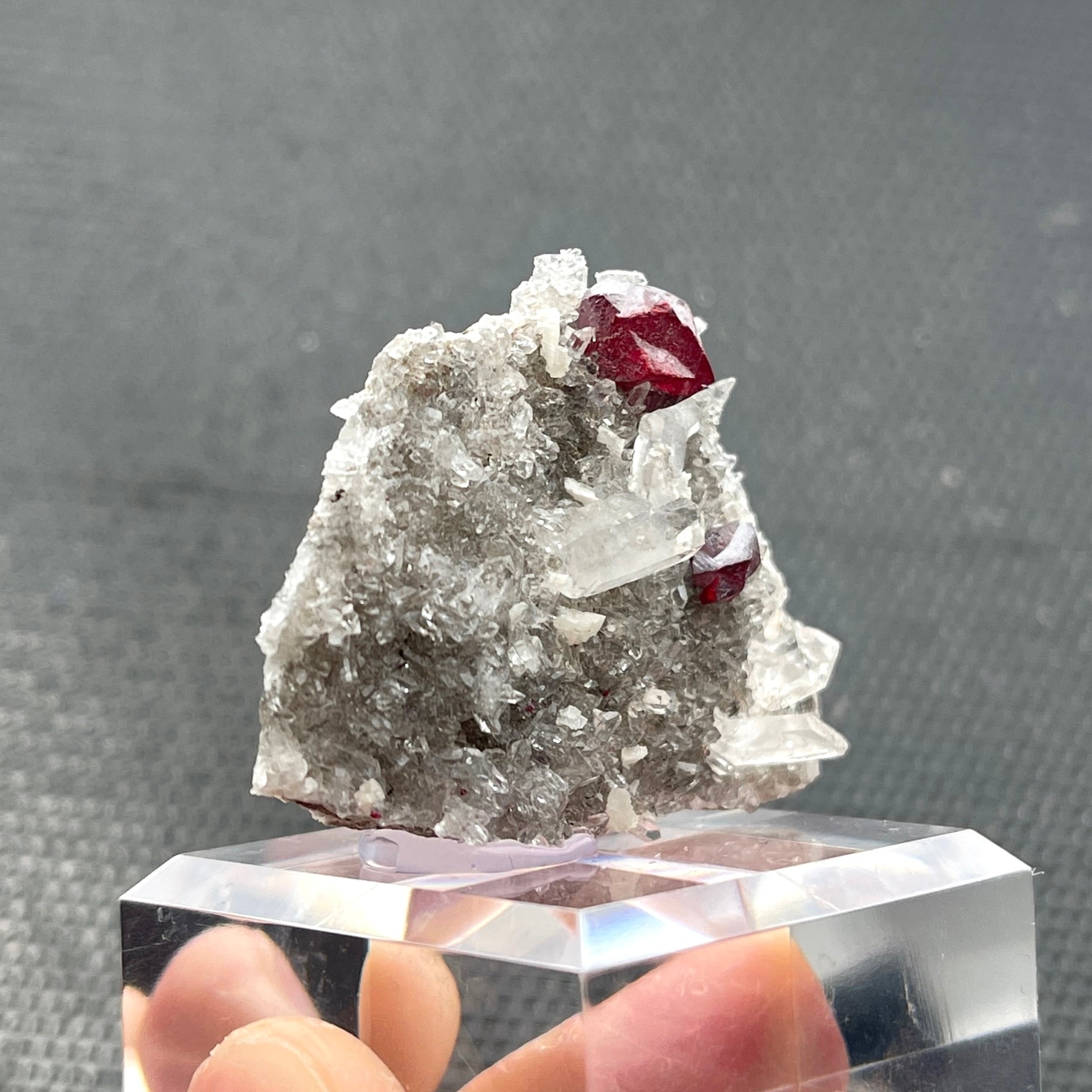 微細なクォーツが覆う母岩上にシナバーが共生する標本で、キラキラとしたクォーツのテリ感とシナバーの金属光沢とのコントラストが魅力的です。