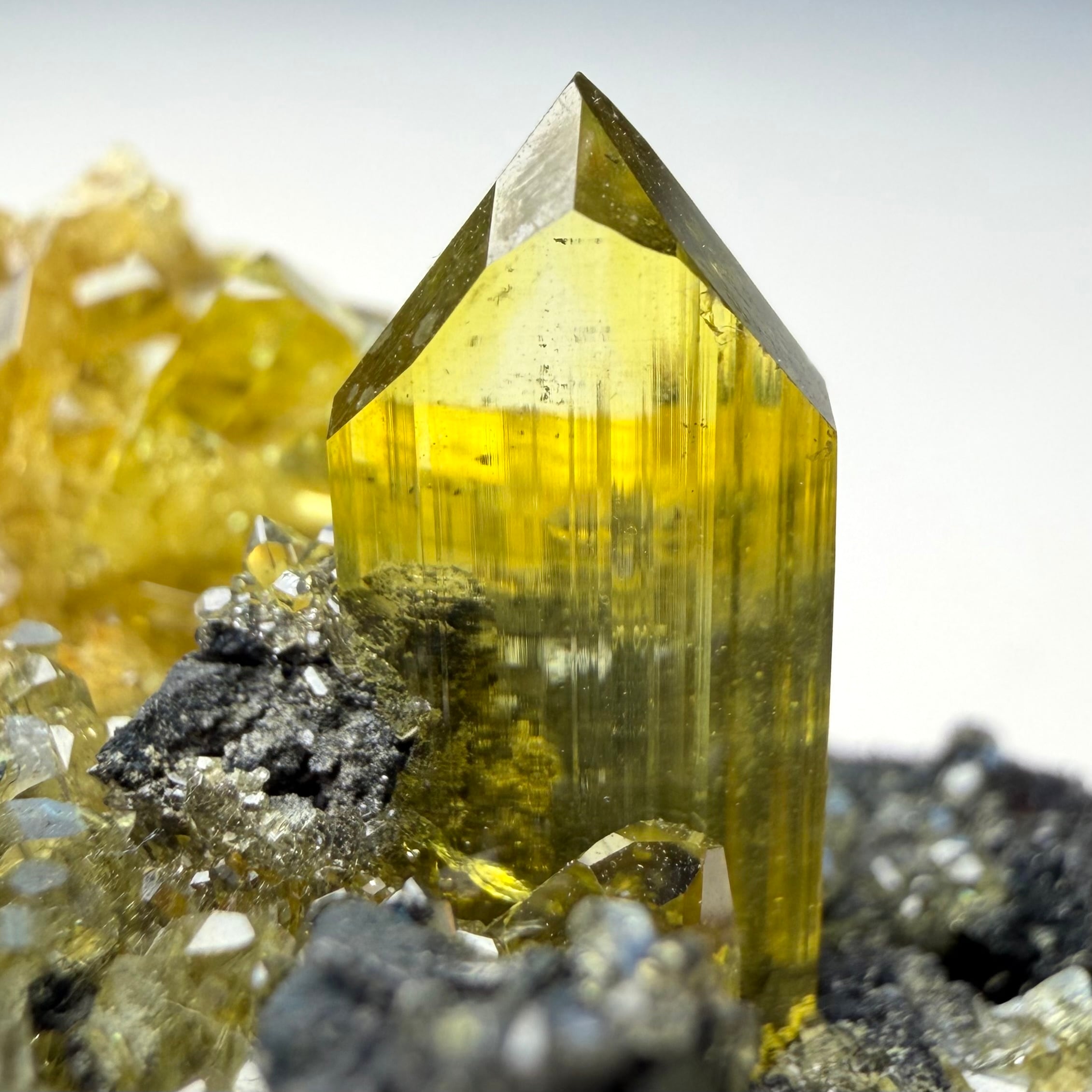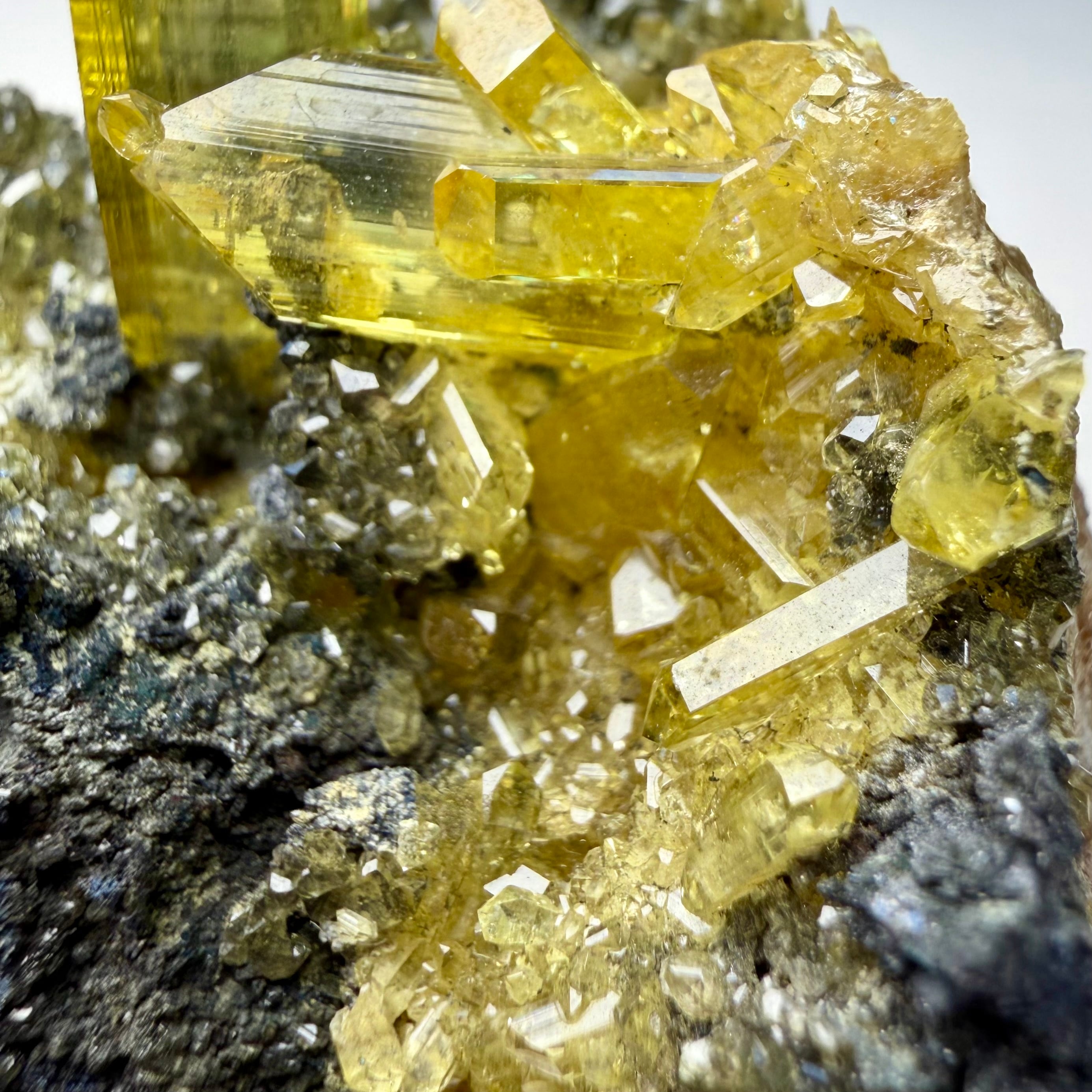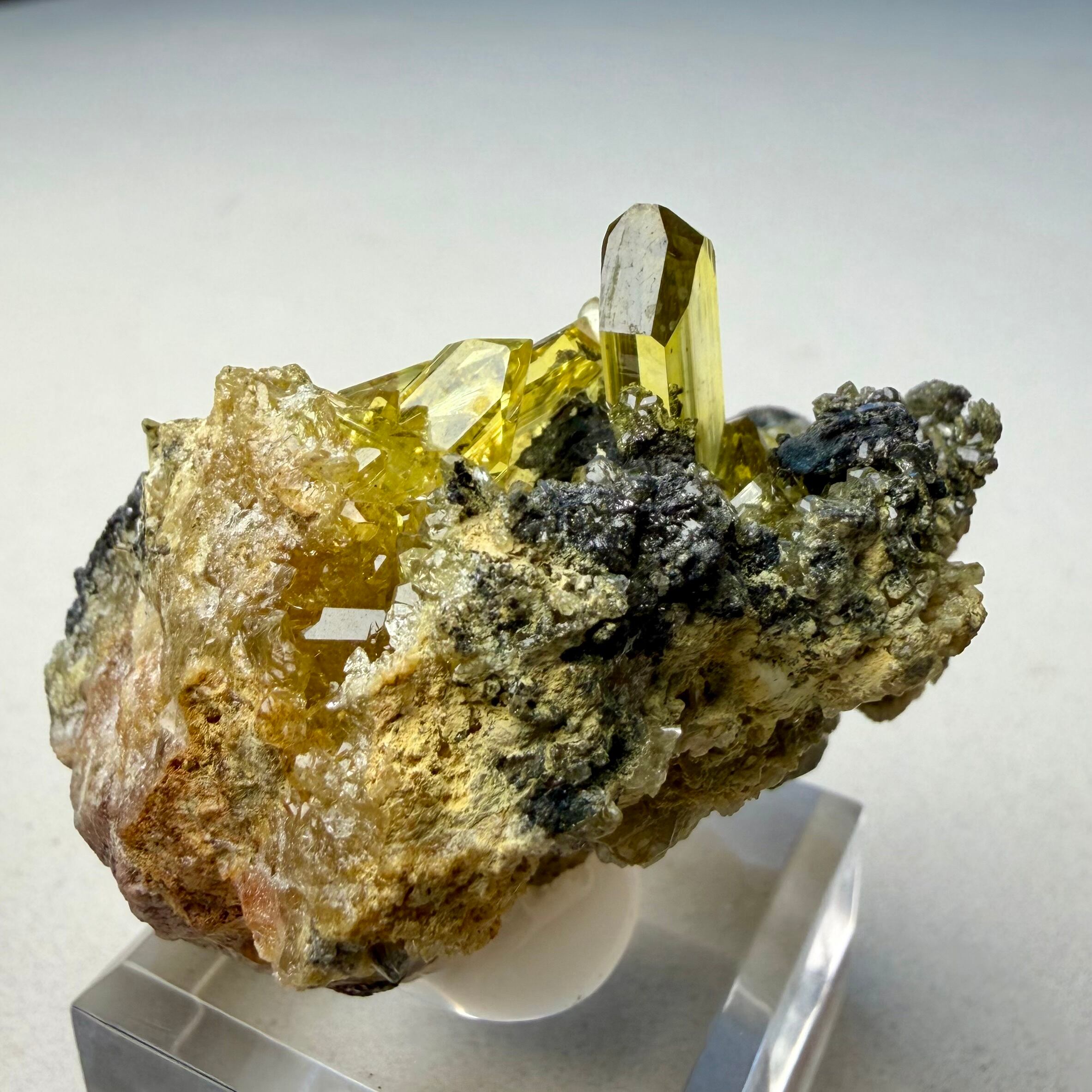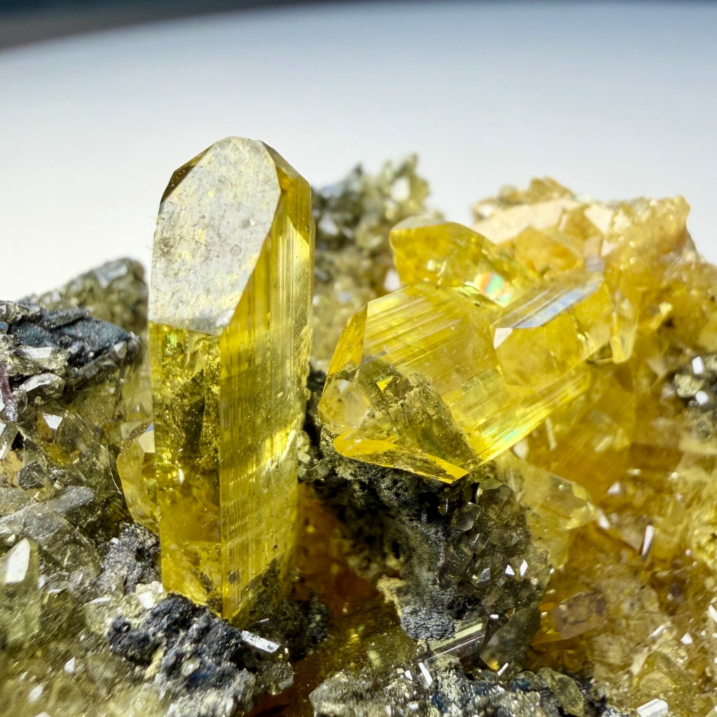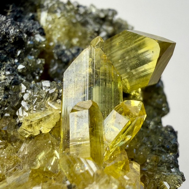 アングレサイトはどれもシャープな印象で、非常にクリアかつ抜群のテリがあり、特徴的なネオンイエローの発色も素晴らしい結晶です。