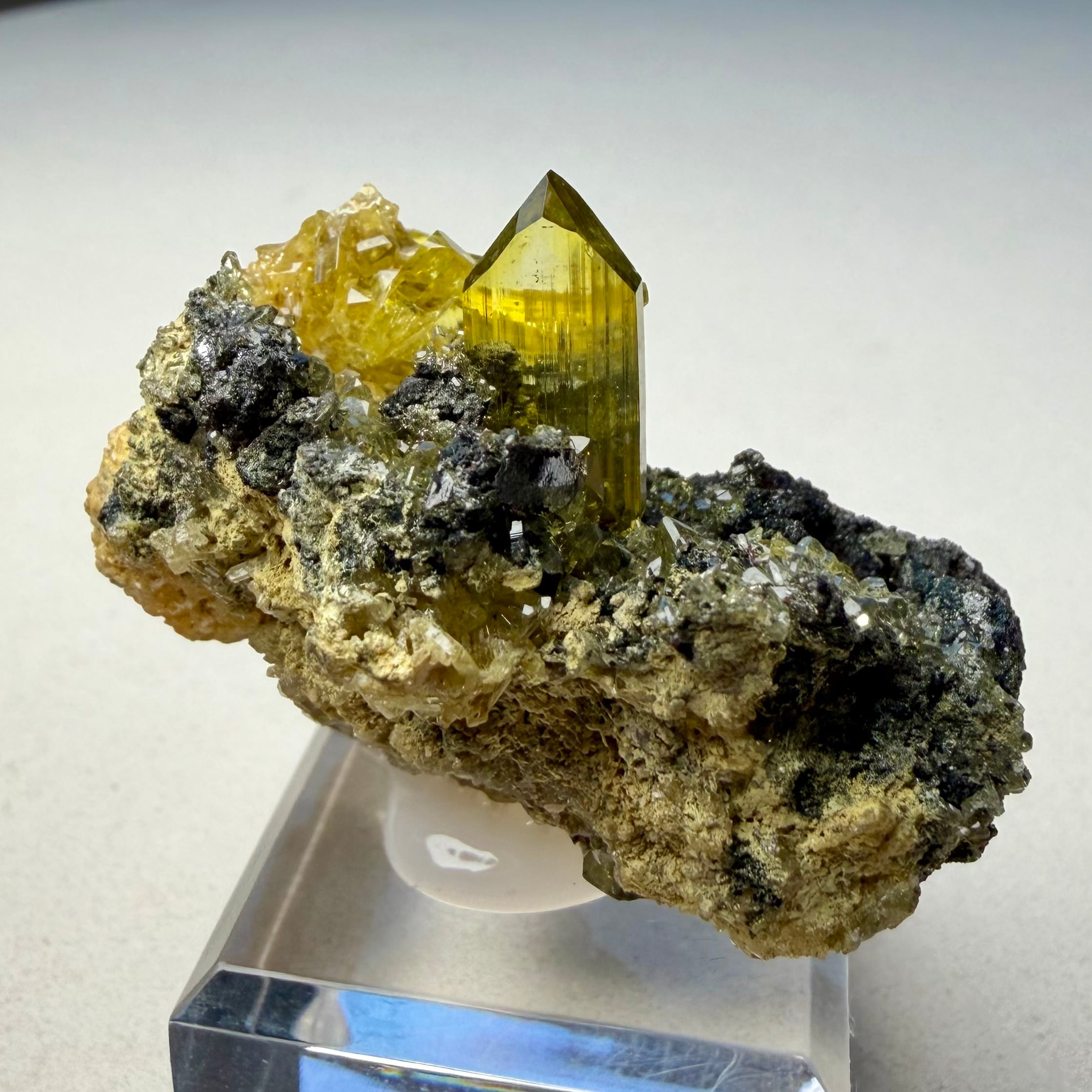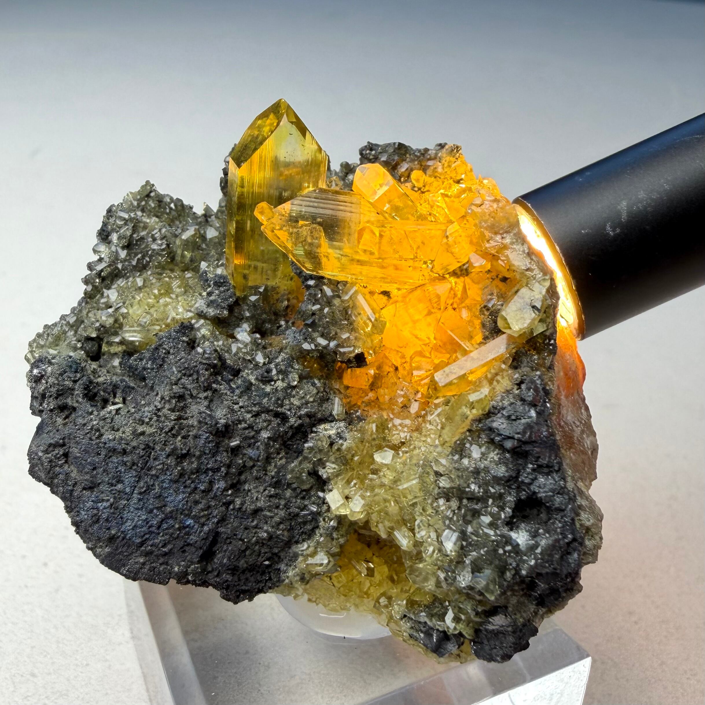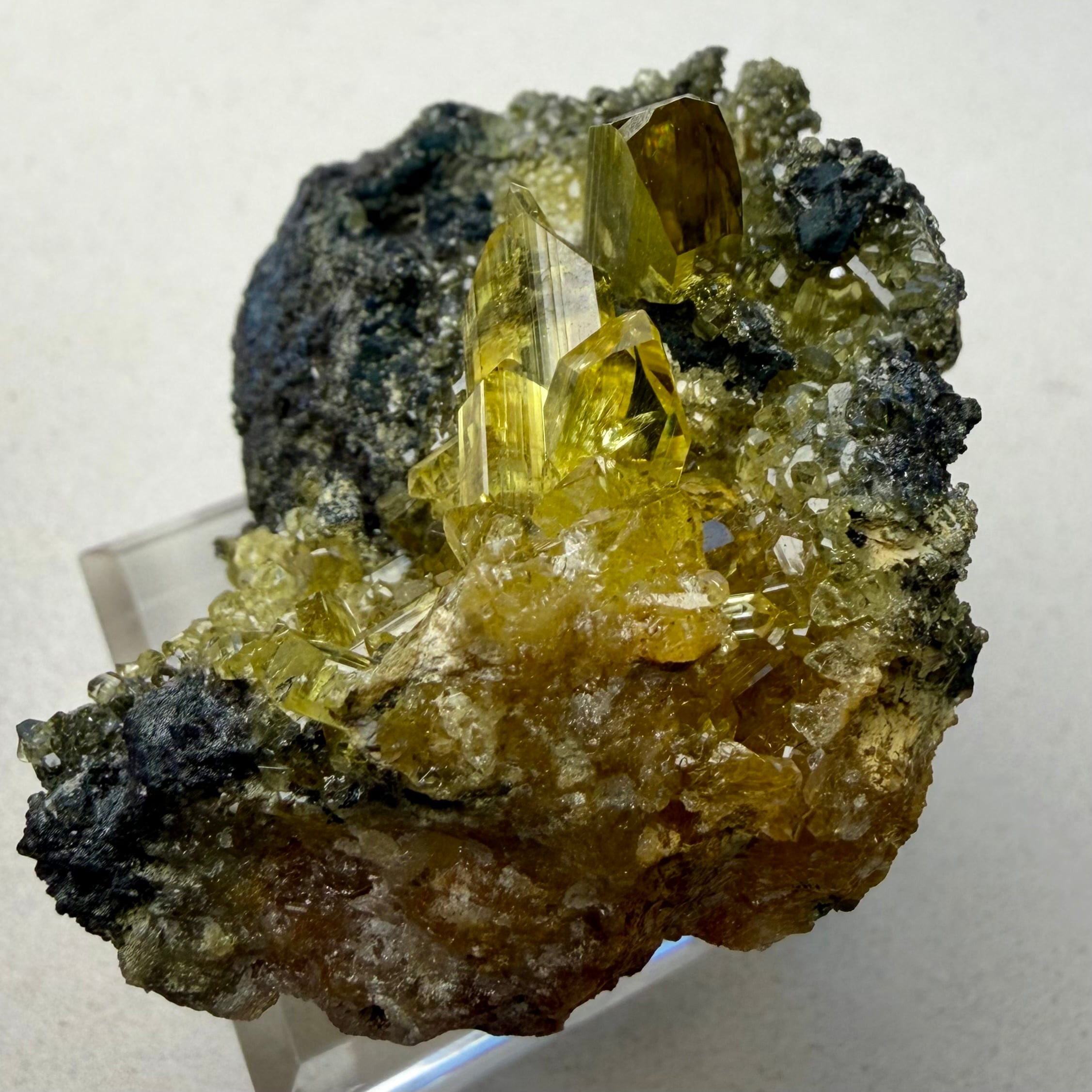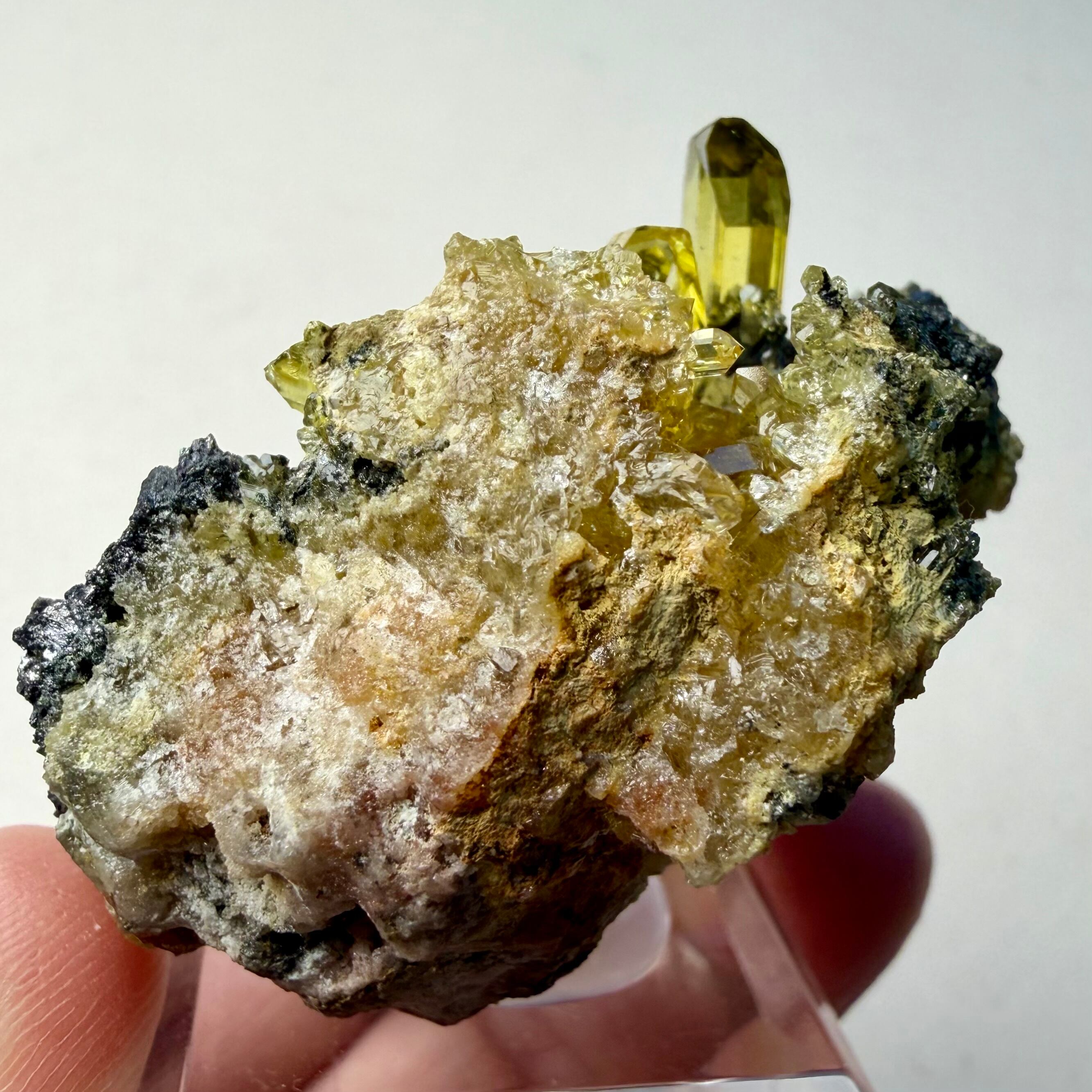 また、メイン結晶は露出している部分だけでも20mm近いサイズ感で、母岩の形状から晶洞の様な箇所もあったりと、全体的なサイズ感も相まって見所の多い標本で、アングレサイトとして達成感のある標本と言えそうです。