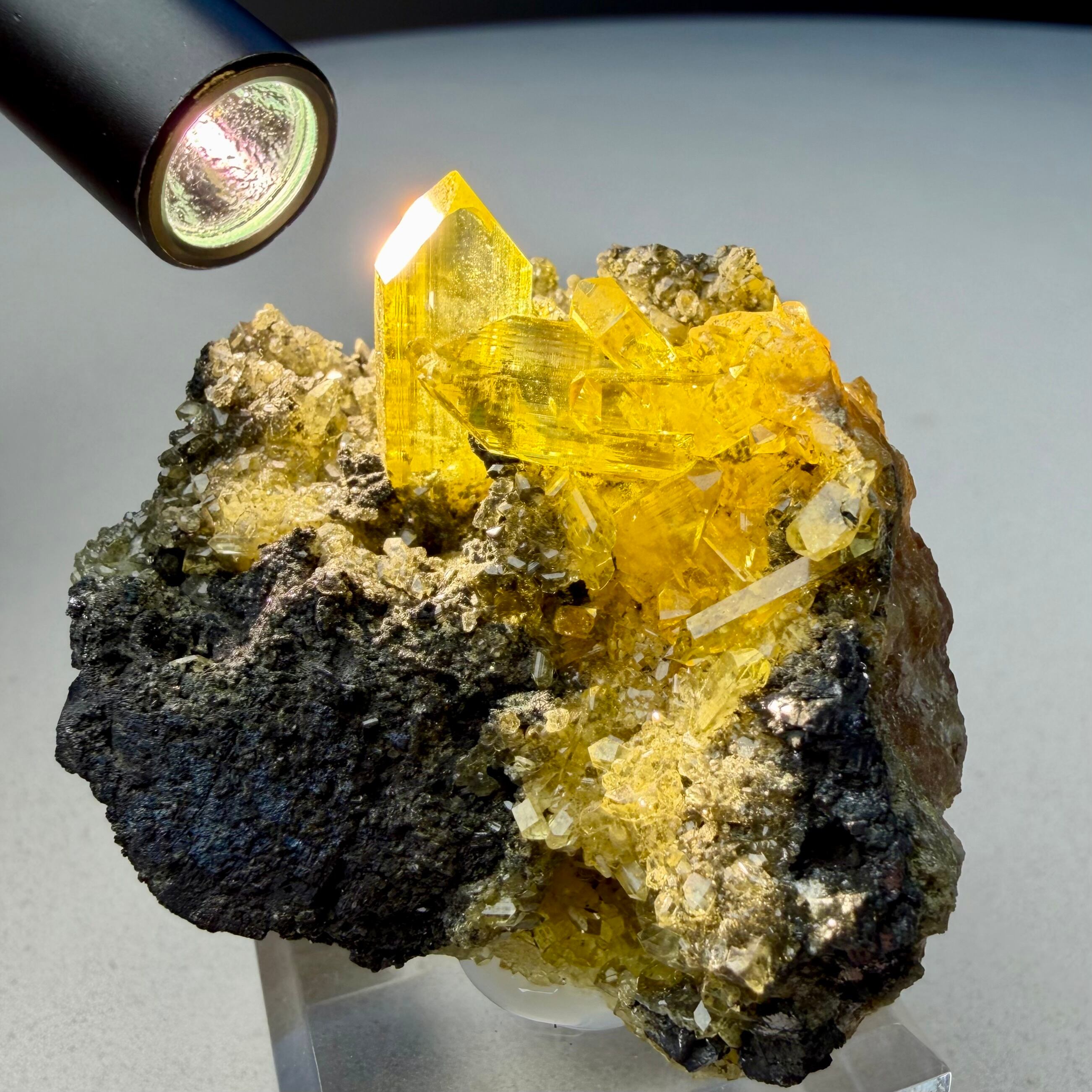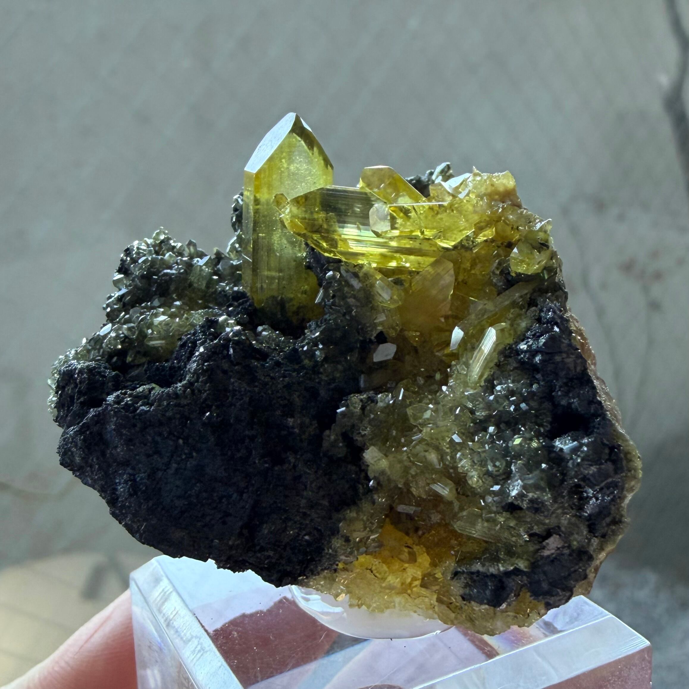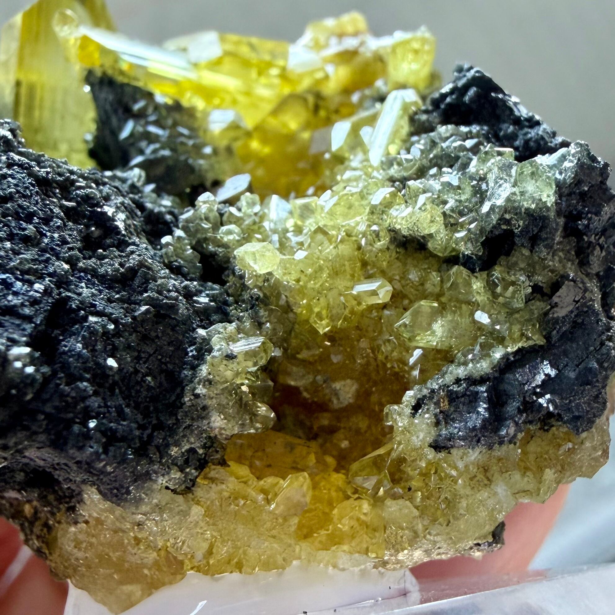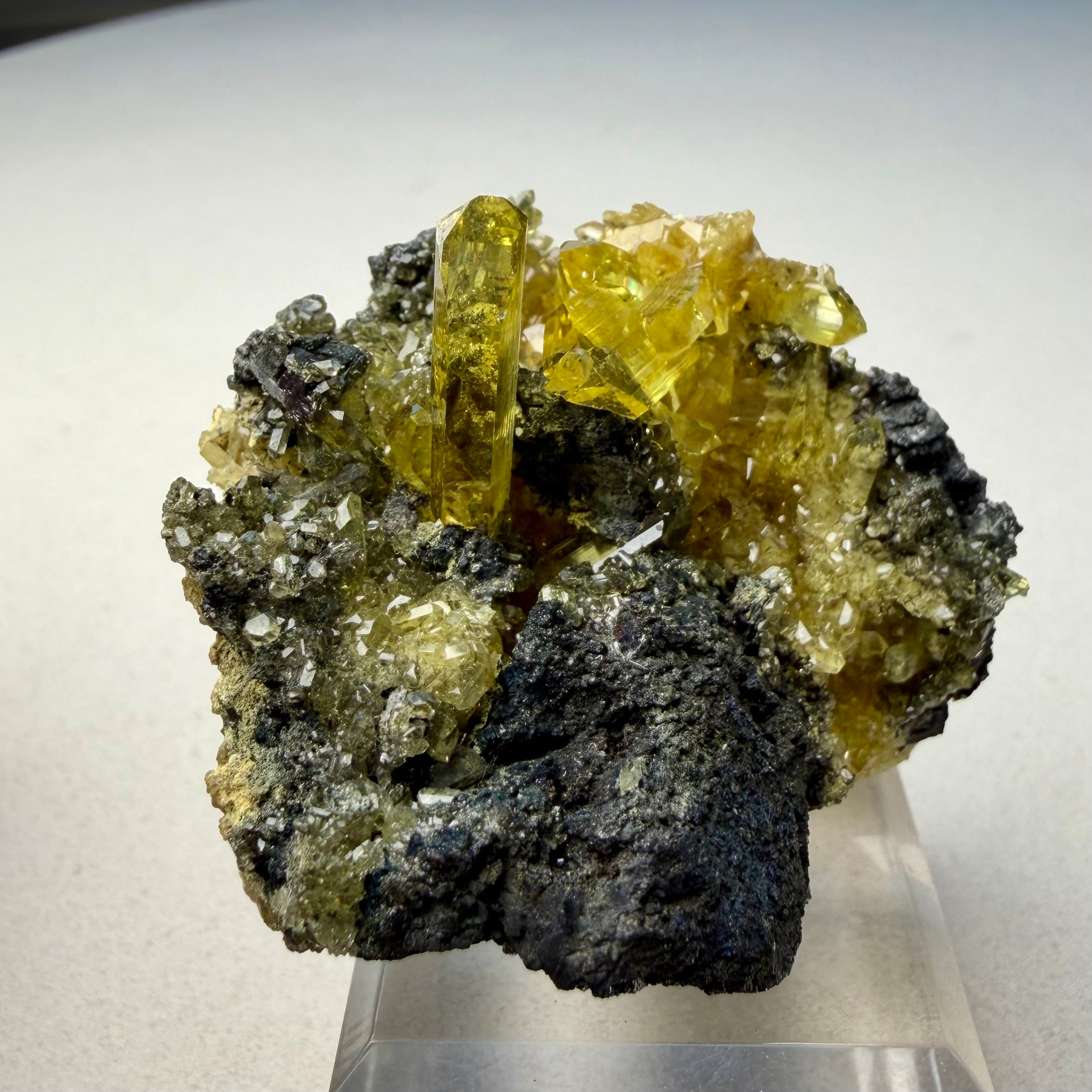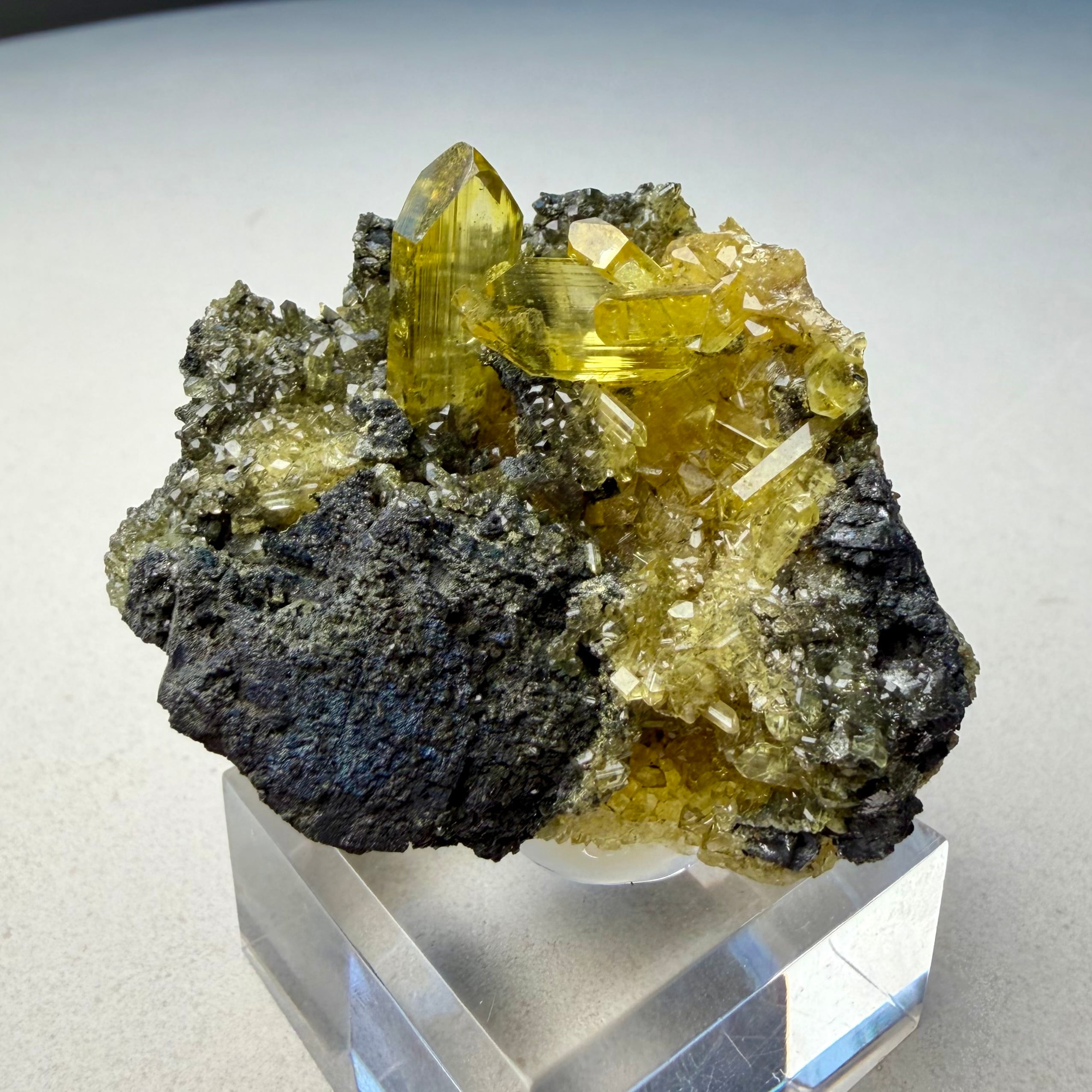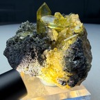 黒いガレナの母岩上に鮮やかなネオンイエローのアングレサイトが結晶する、見応え抜群でずっしりと重みを感じるボリュームのある標本です。