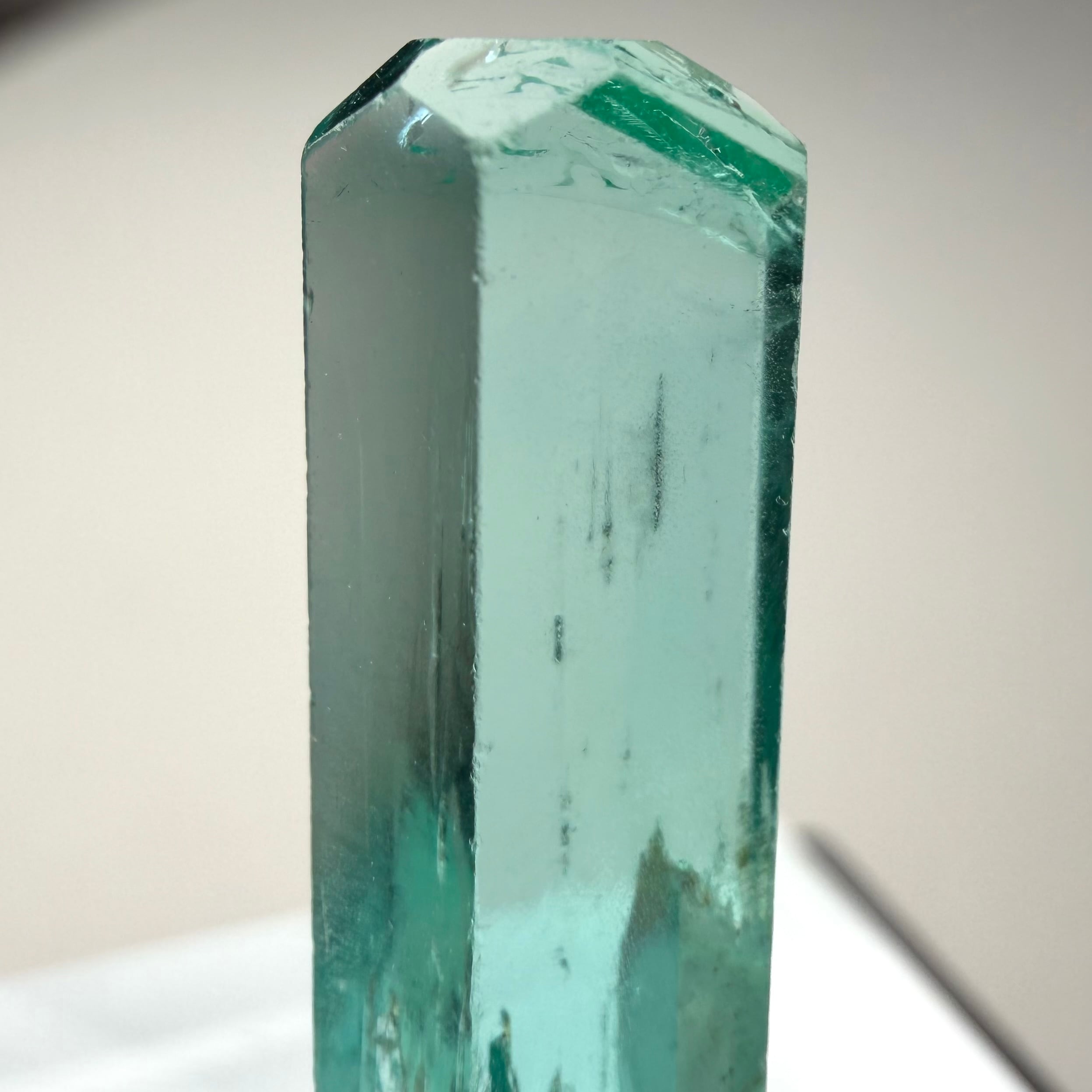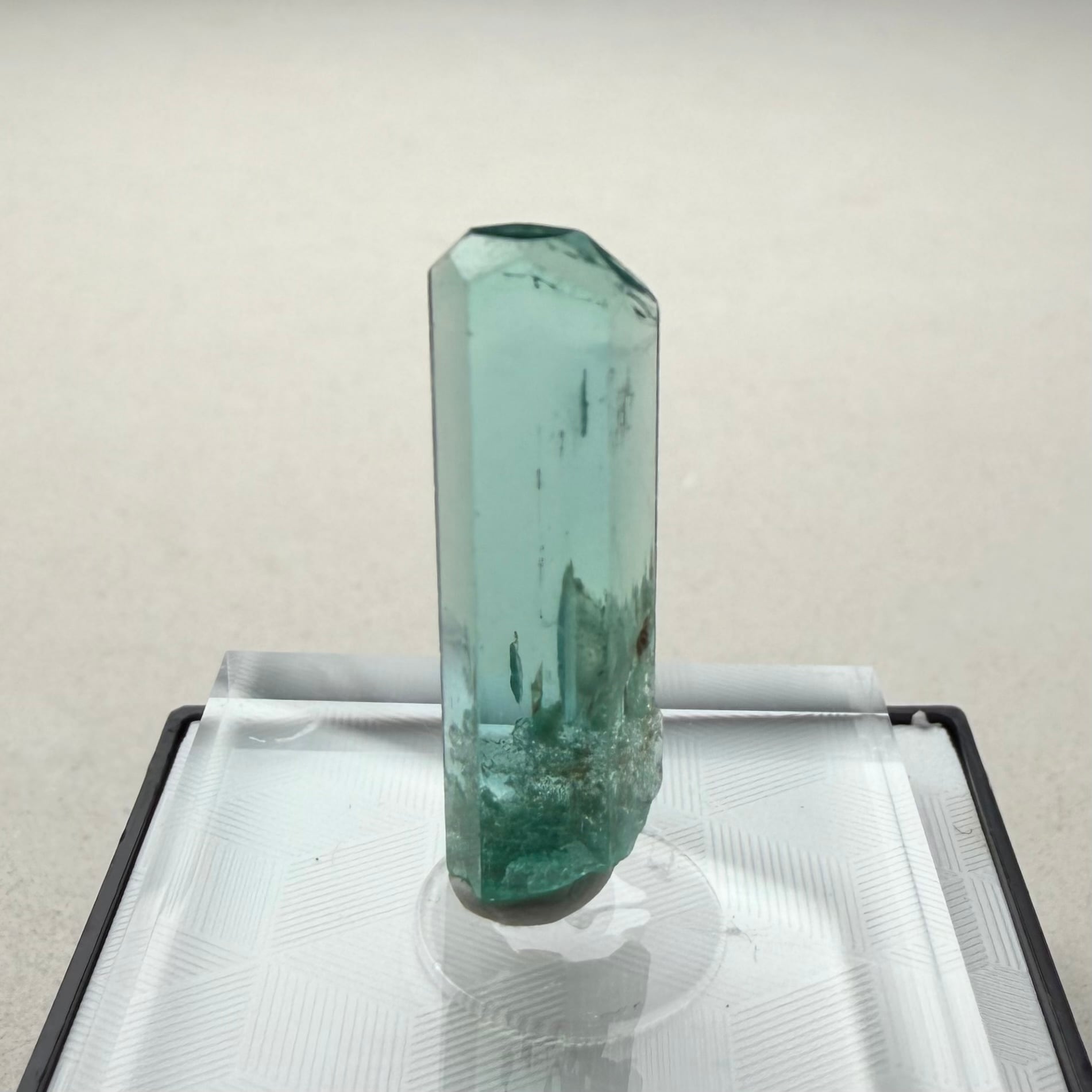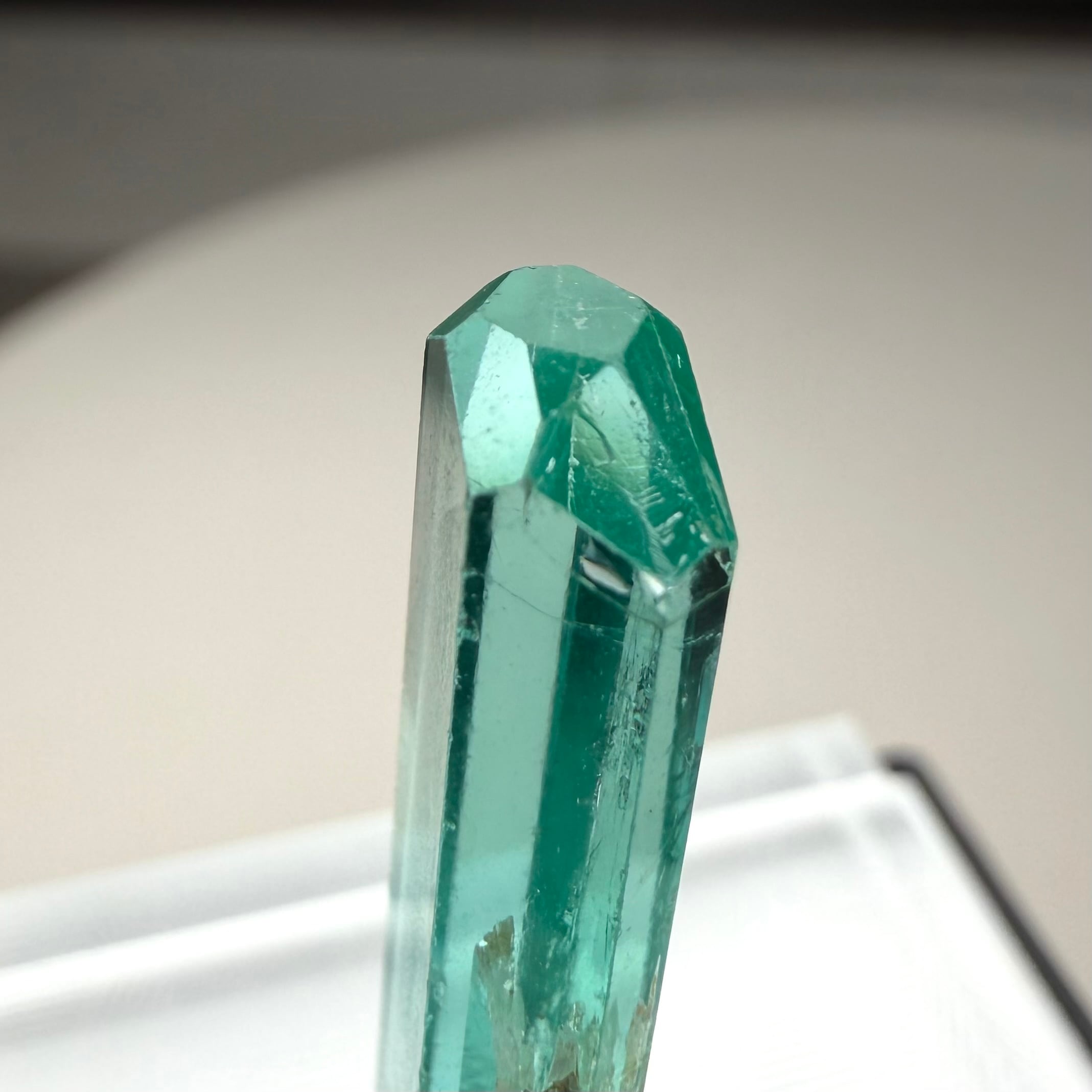 六角柱状、少し押し潰したかのような平板に近い形状の結晶がユニークで、非常にクリアでテリが強く、この産地のものとしては発色も良好です。