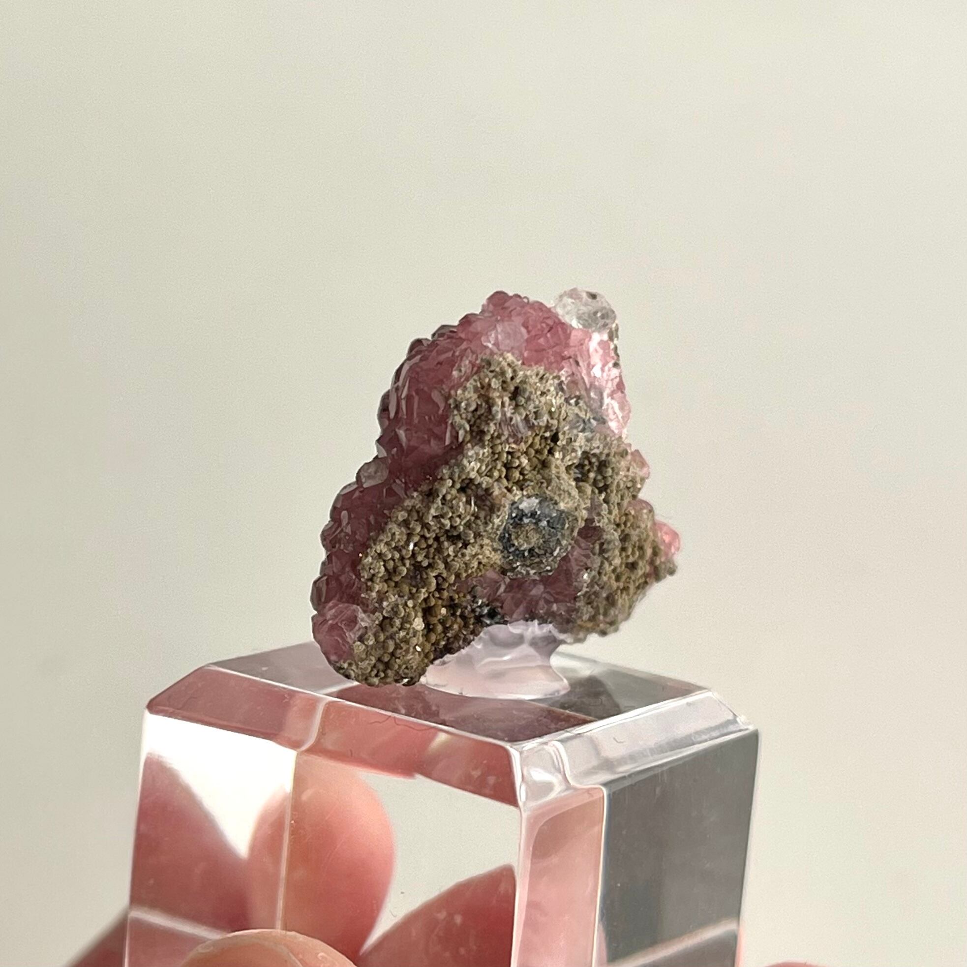 ロードクロサイトは小さめの結晶ながらテリと透明感が抜群で、濃いピンクの発色も良好です。