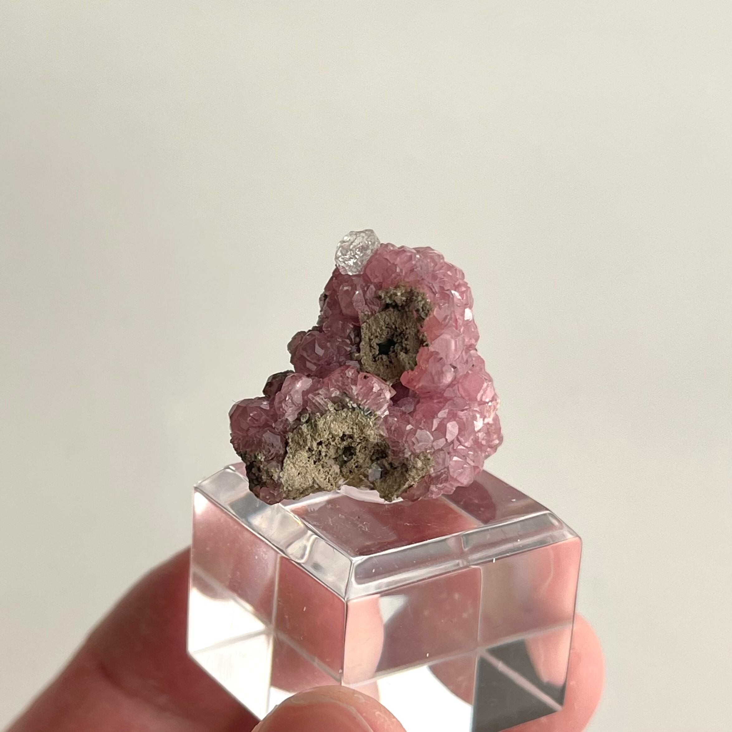 母岩上全体にロードクロサイトが結晶、その上に1粒輝くかのようにステップ状のフローライトが共生するユニークな景色の標本です。