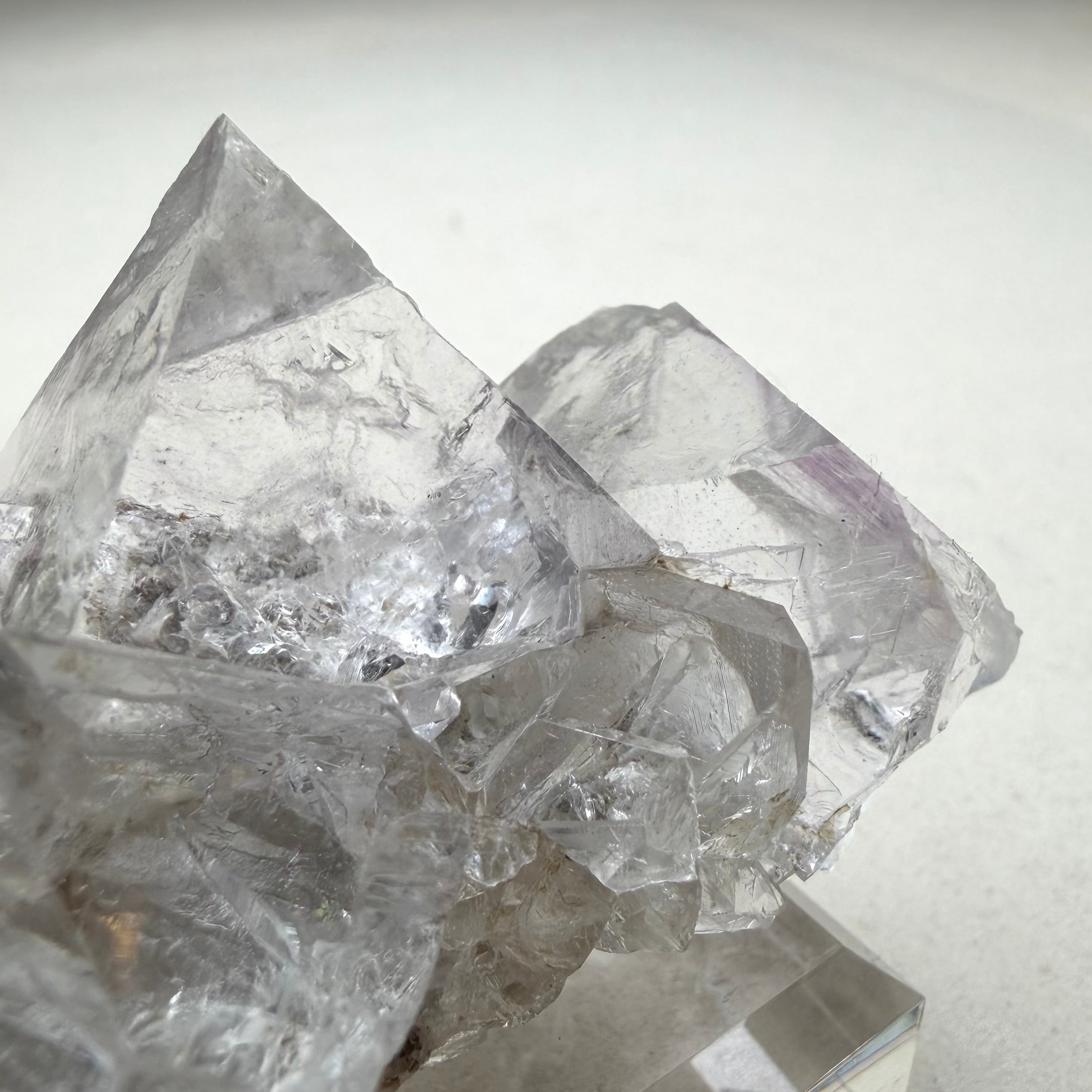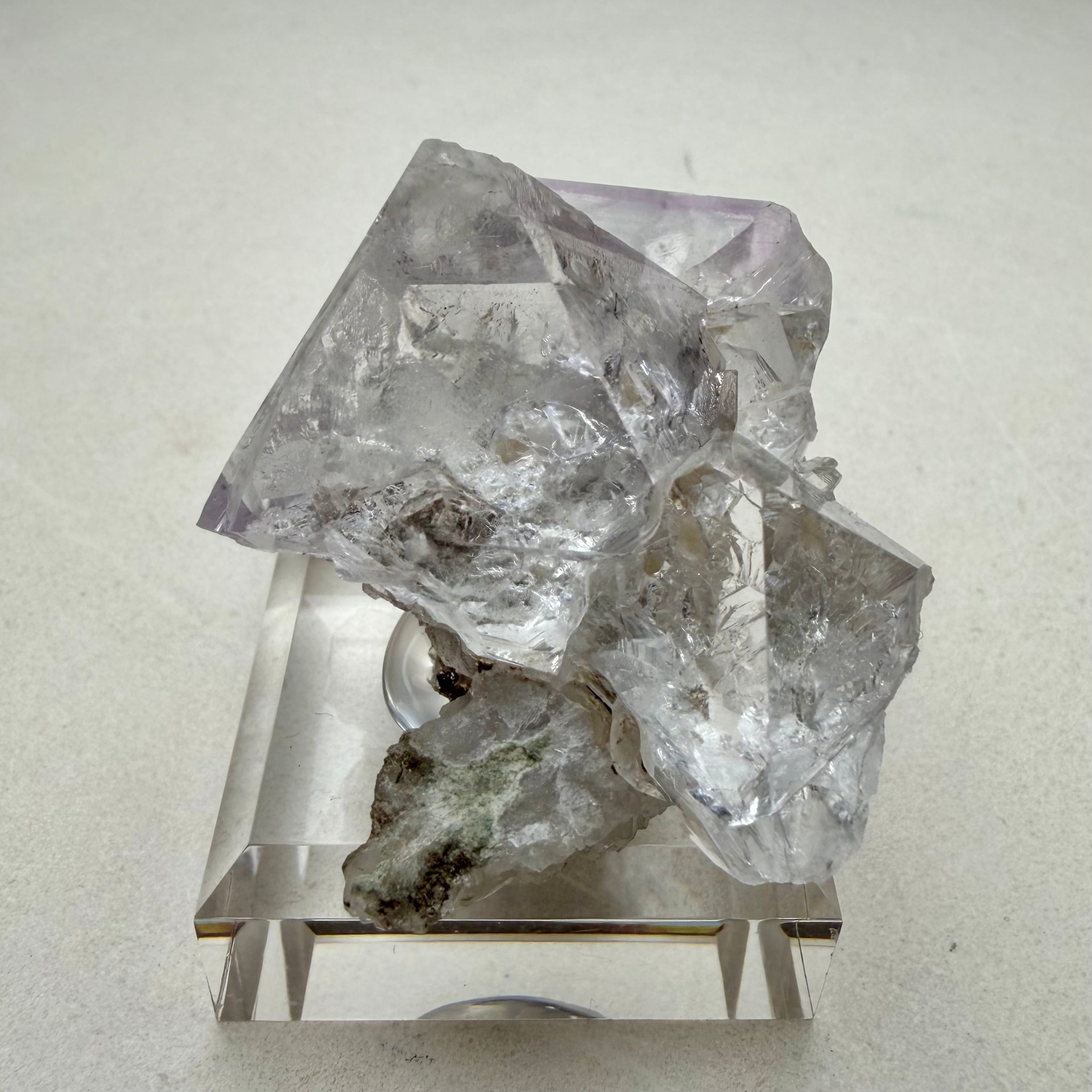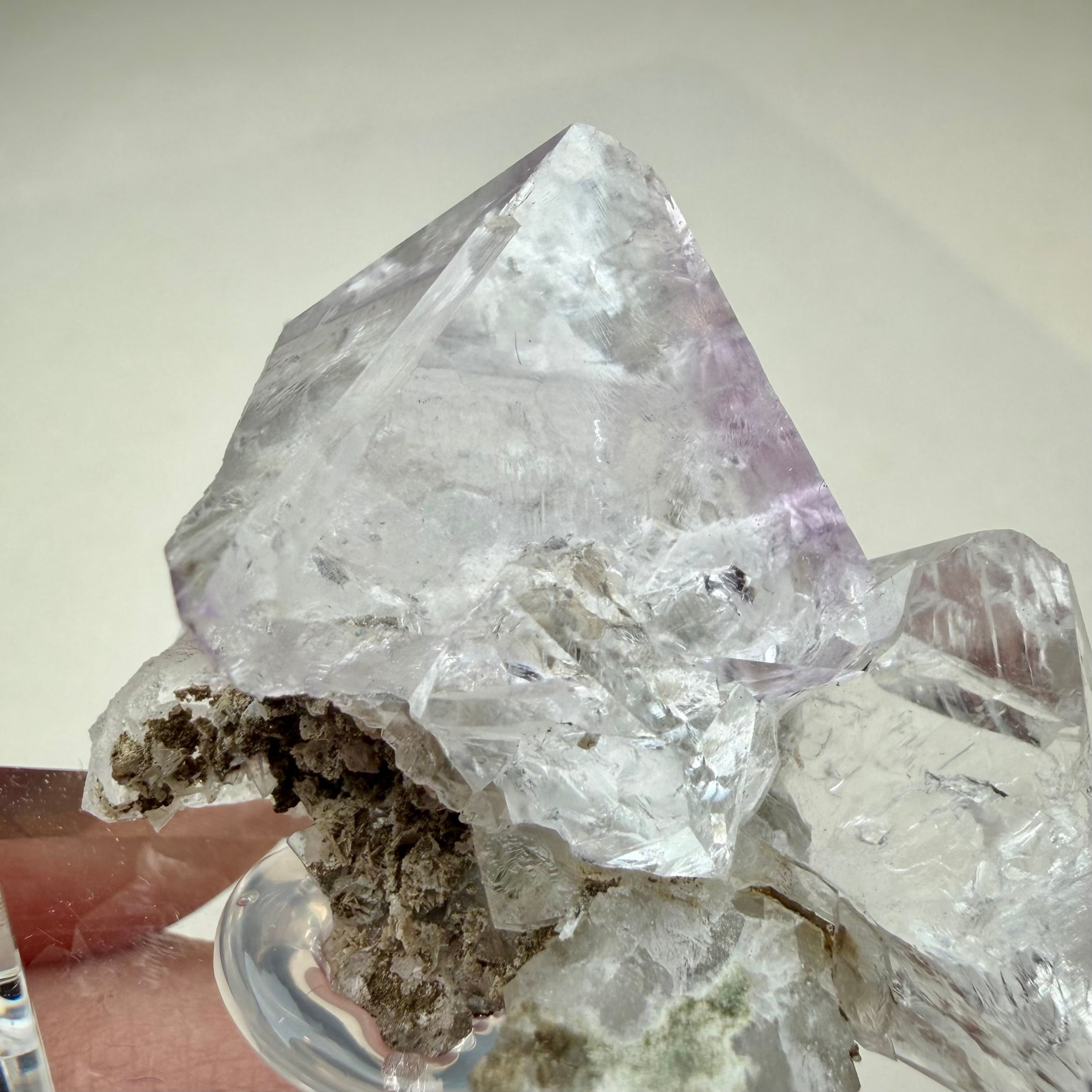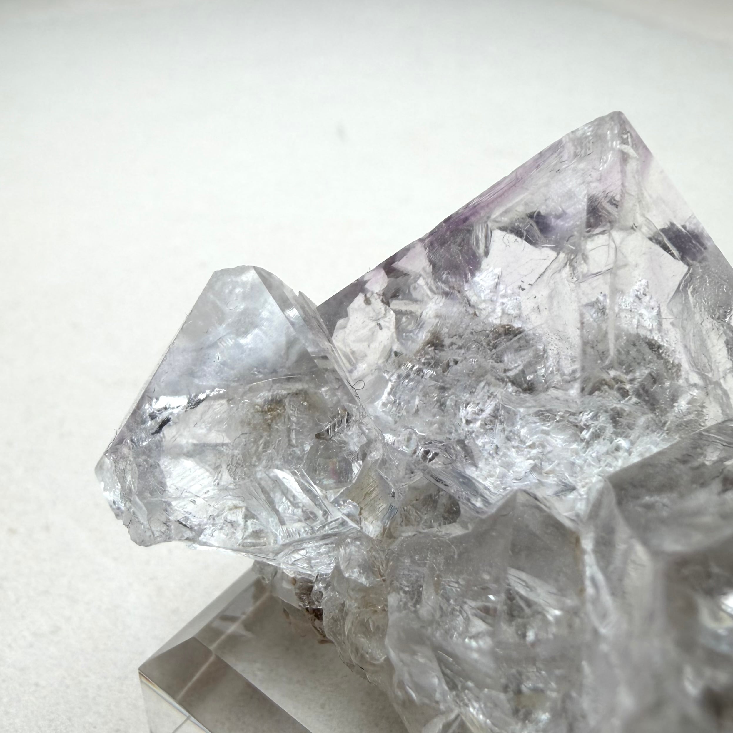 フローライトは非常にクリアでテリが強い良結晶、淡くパープルを帯びた部分も見られますが全体的にカラーレスの結晶で、サイズ感はありますが状態のいい標本です。