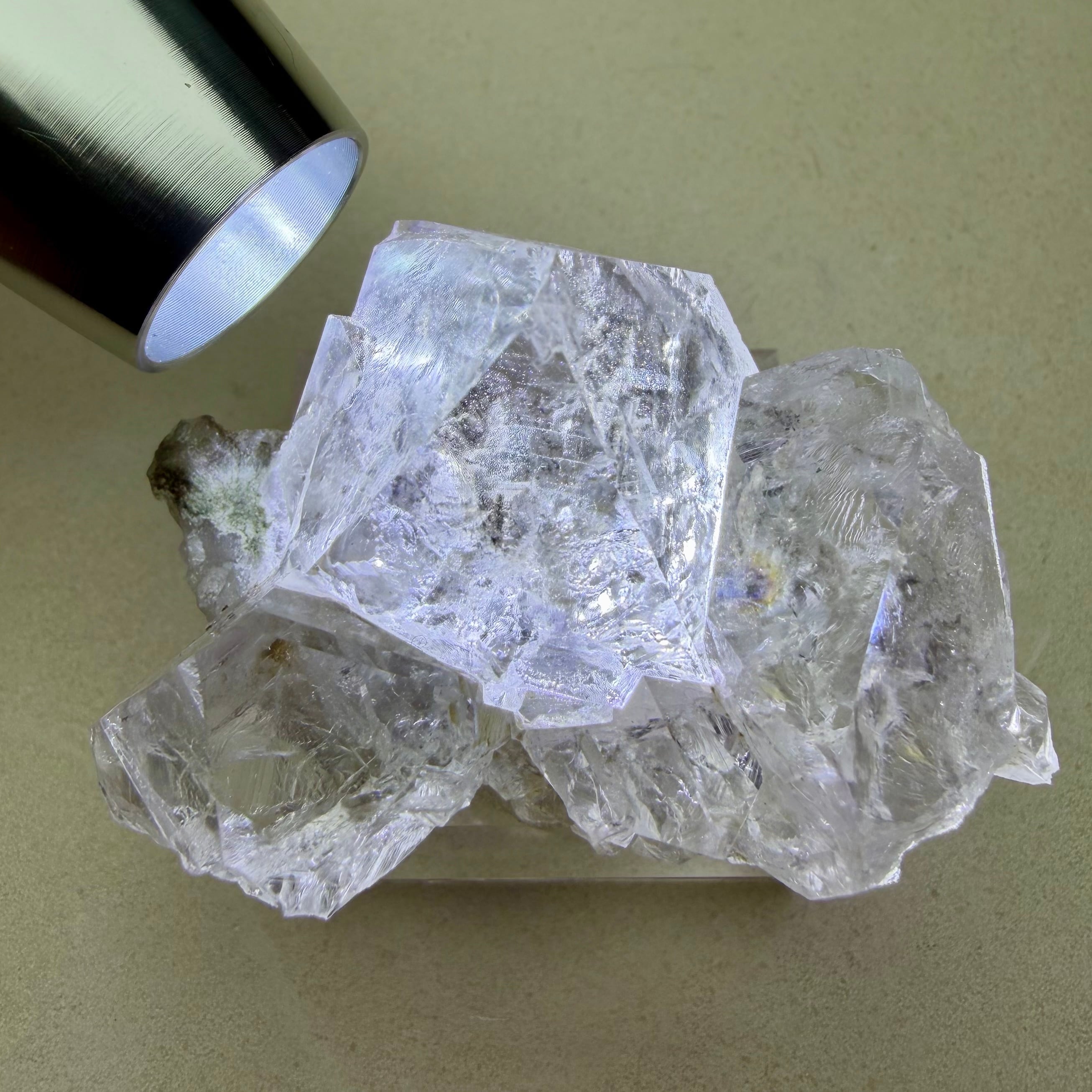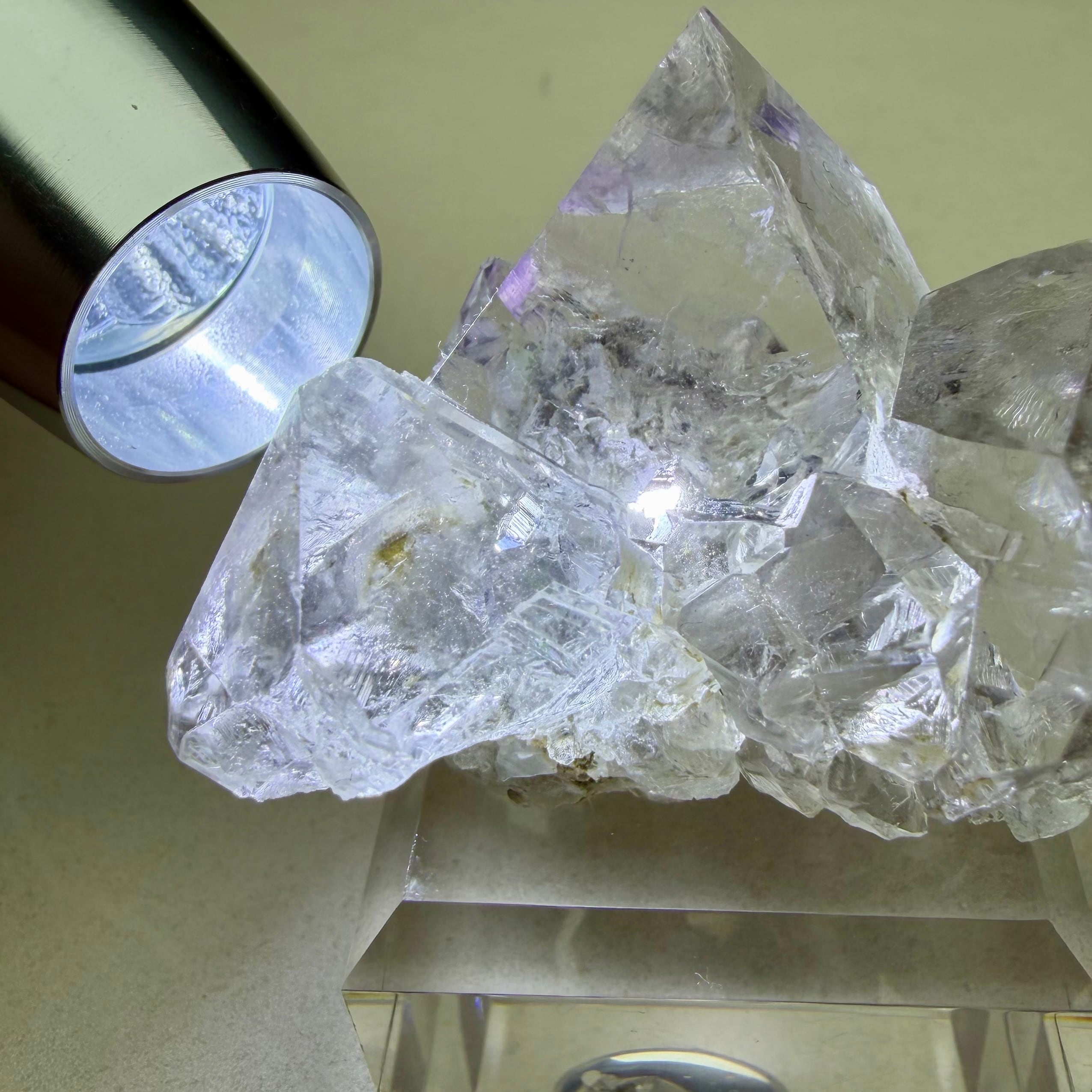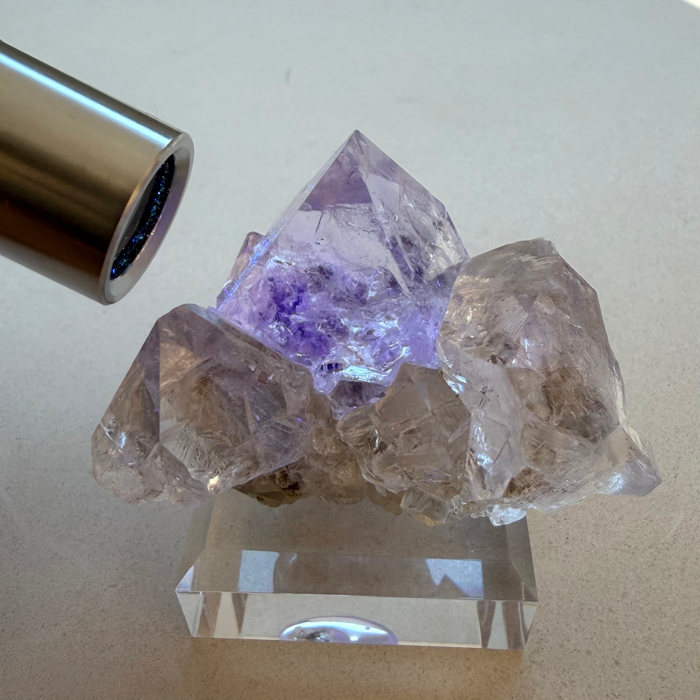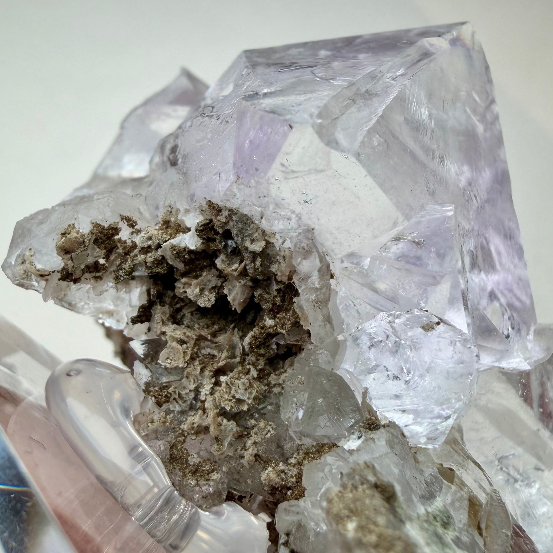 フローライトは非常にクリアでテリが強い良結晶、淡くパープルを帯びた部分も見られますが全体的にカラーレスの結晶で、サイズ感はありますが状態のいい標本です。