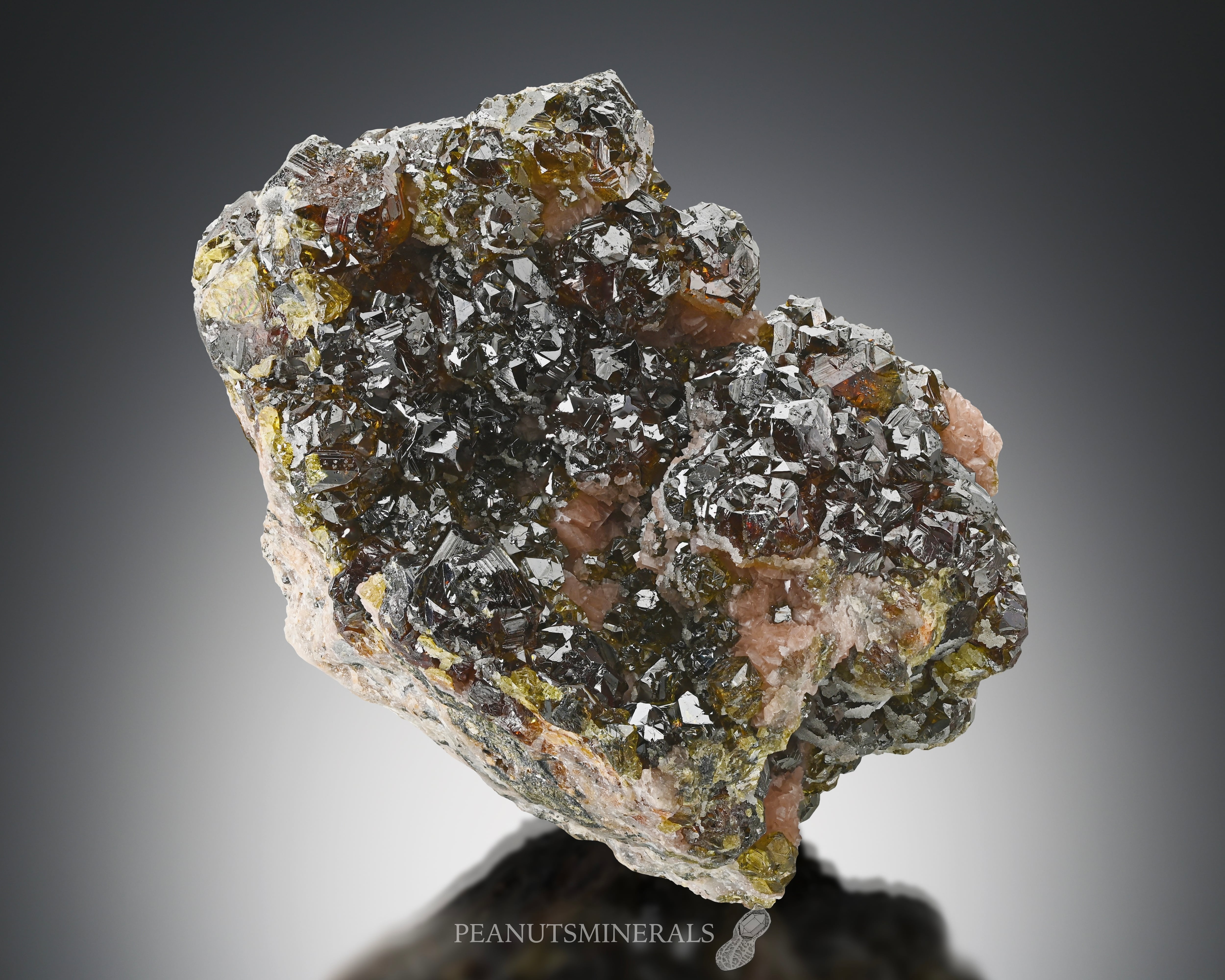 母岩を覆うロードクロサイトを全体的にスファレライトが覆ったユニークなコンビネーションで、スファレライトは透明感やテリが抜群、透過光下でぎらりとした輝きが見られます。