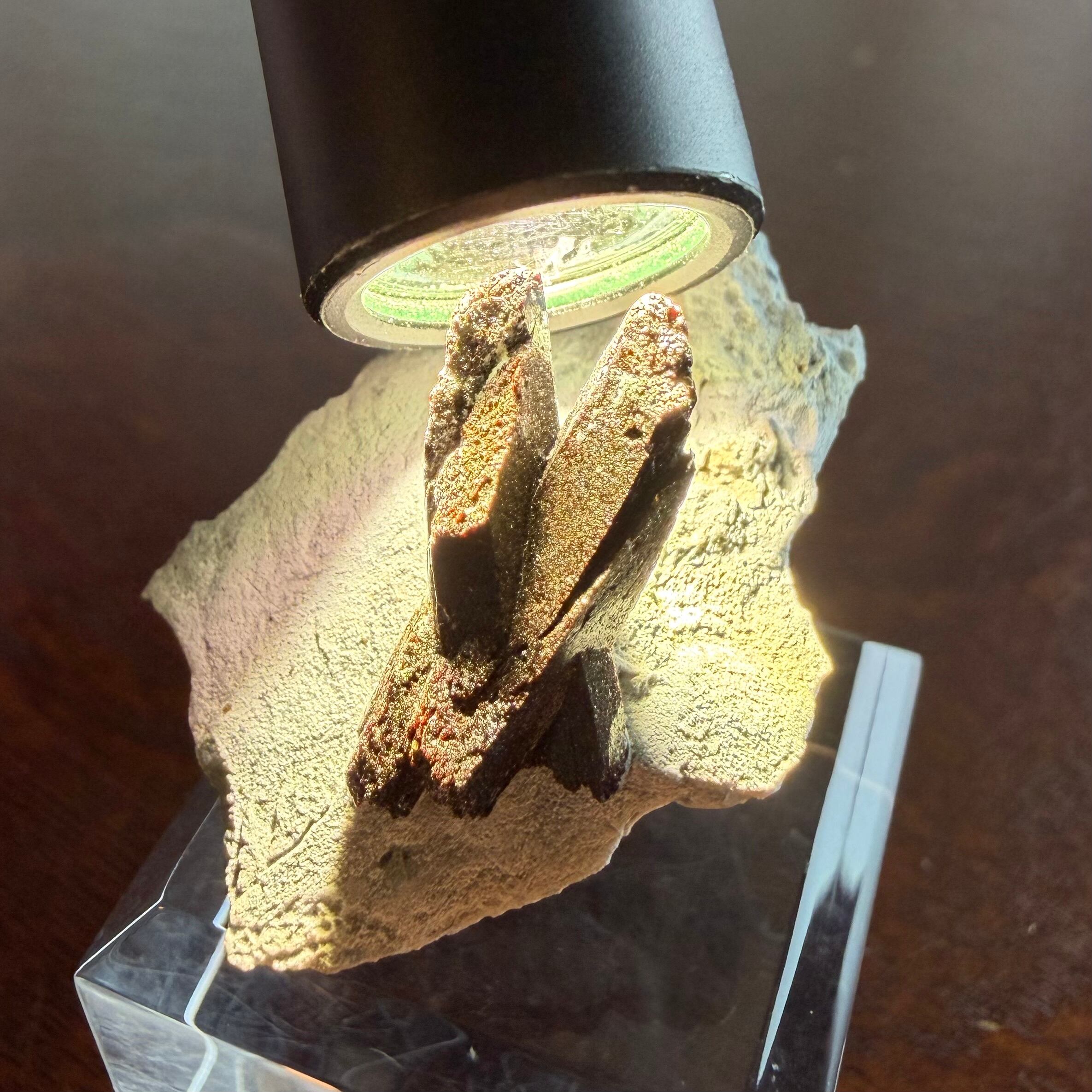 ネプチュナイトがクロスした結晶が存在感抜群の標本で、深いブラックの色味やテリには欠けますが、その分ユニークさや母岩とのバランスの良さが魅力を補う標本です。
