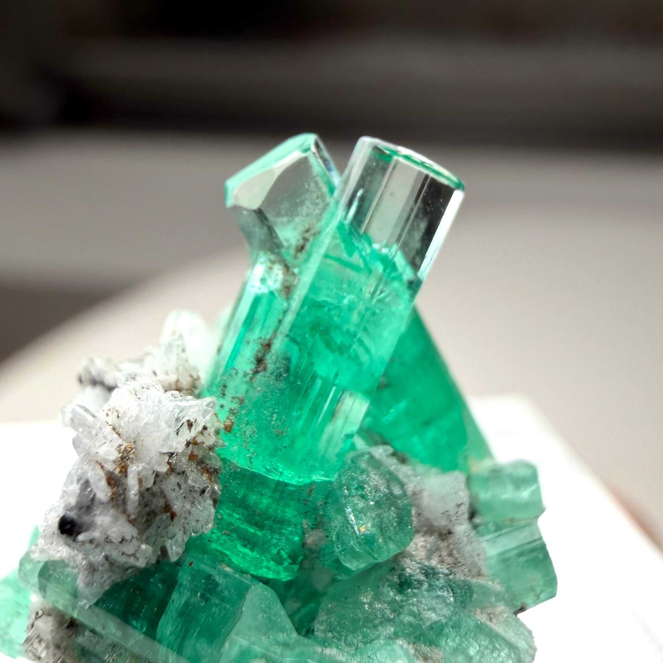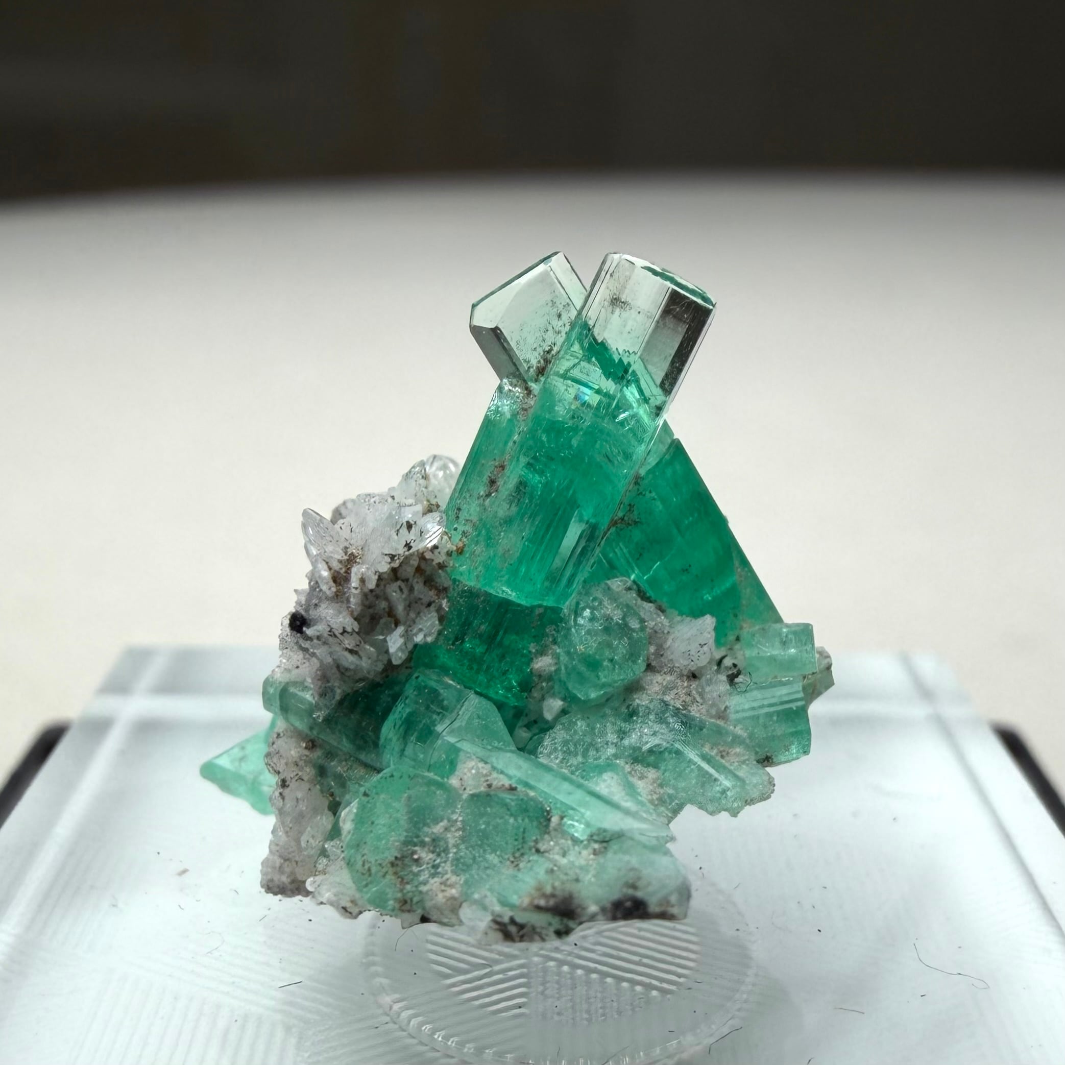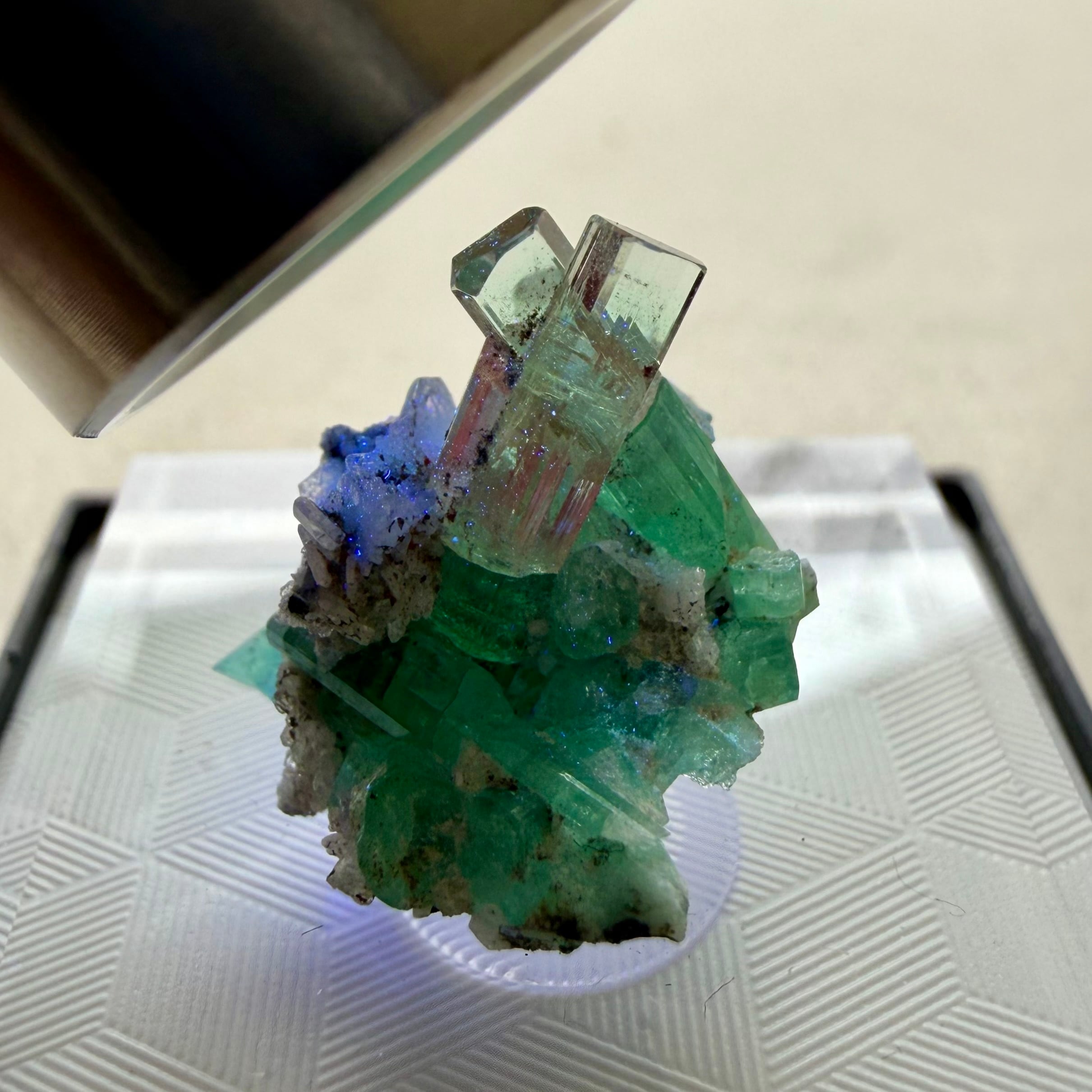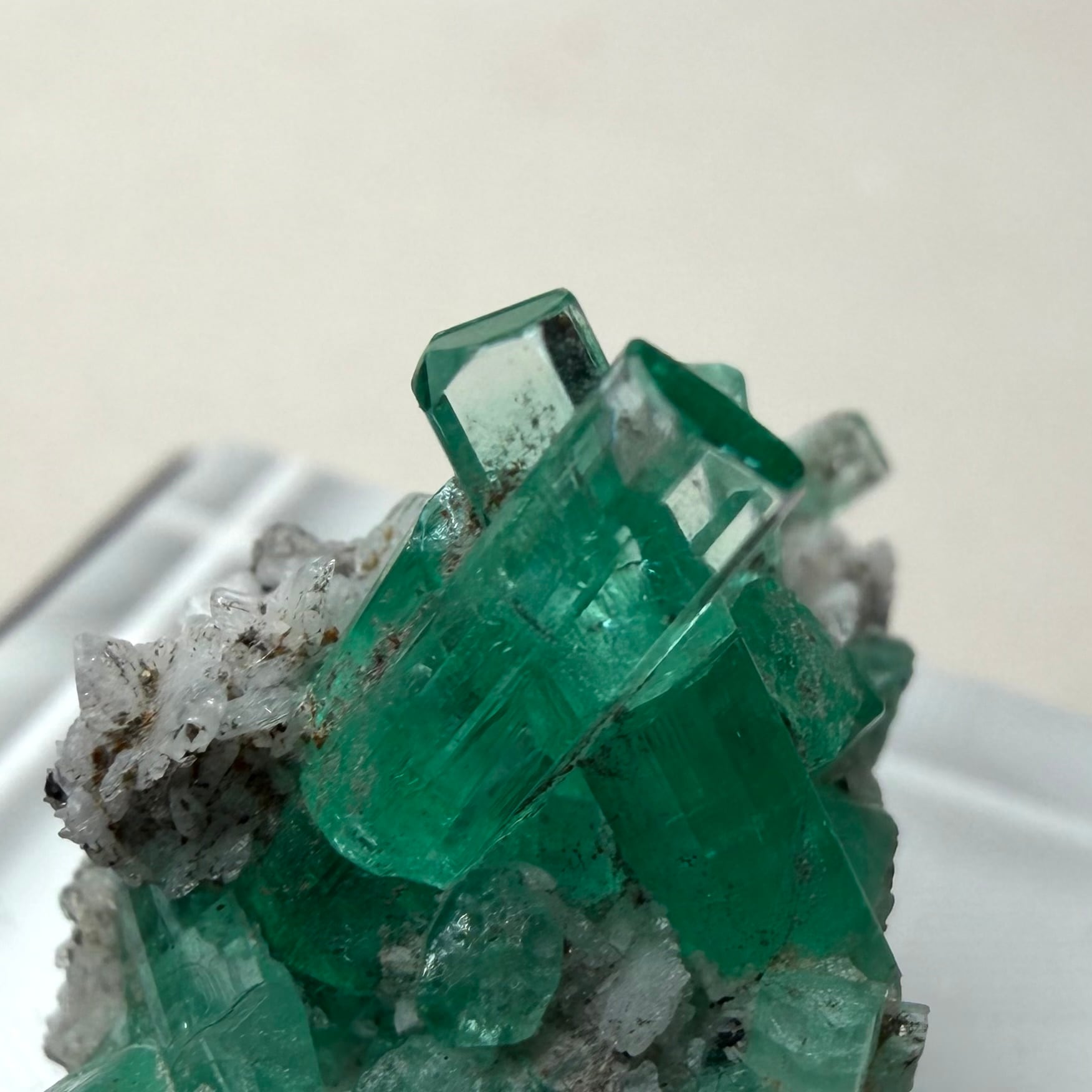 画像1枚目~からの様に色々な角度から見て魅力的な景色のため、どの角度を正面として捉えるか少し悩ましいところもありますが、メイン結晶とも言える二本のエメラルド同士がクロスする角度などは特に美しくユニークかと思います。