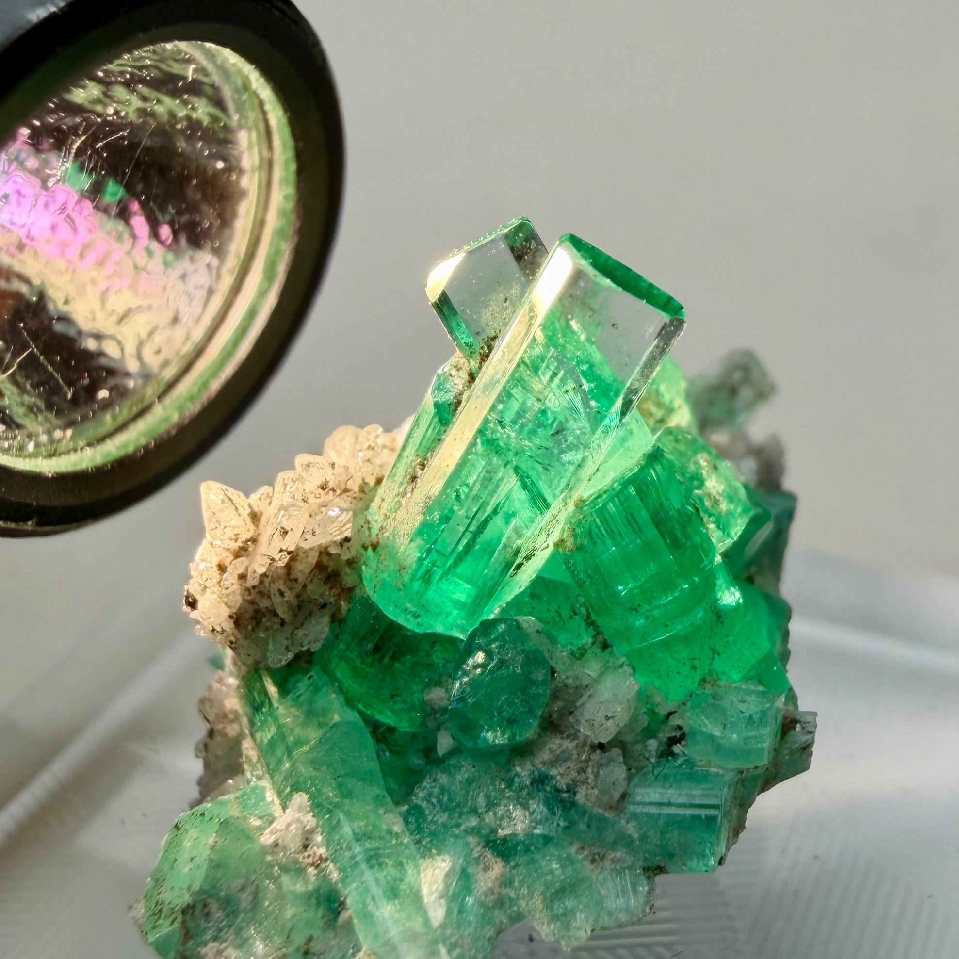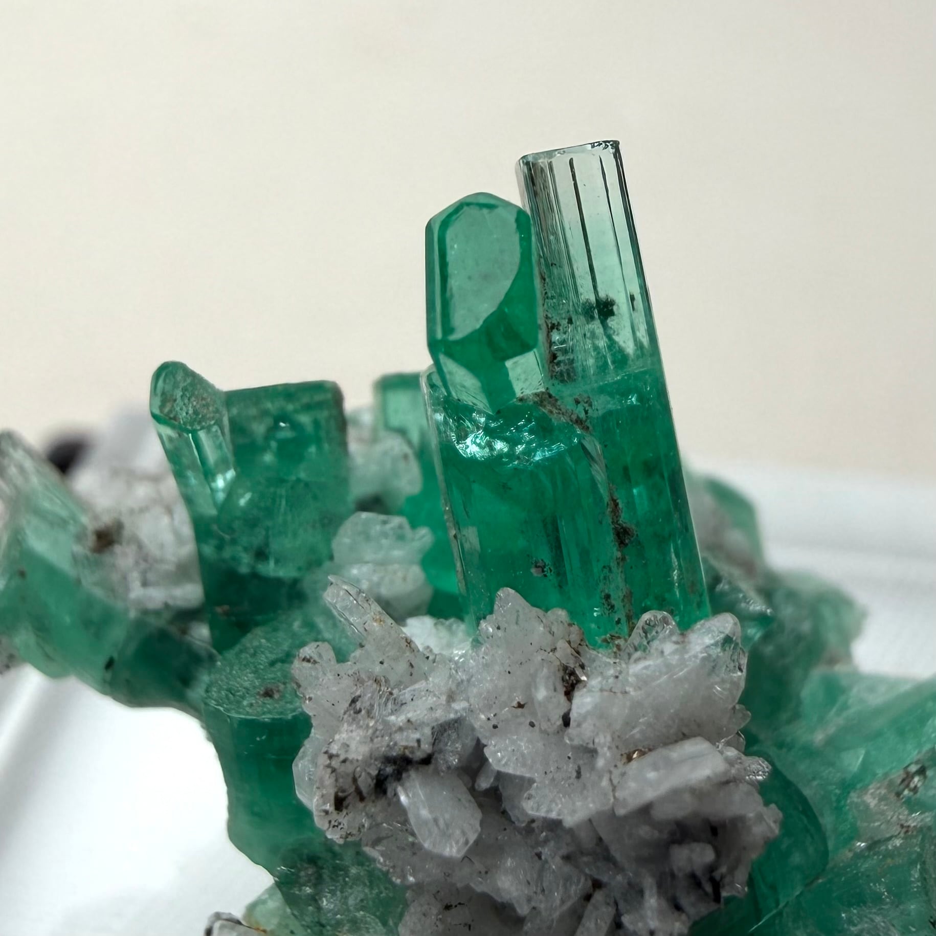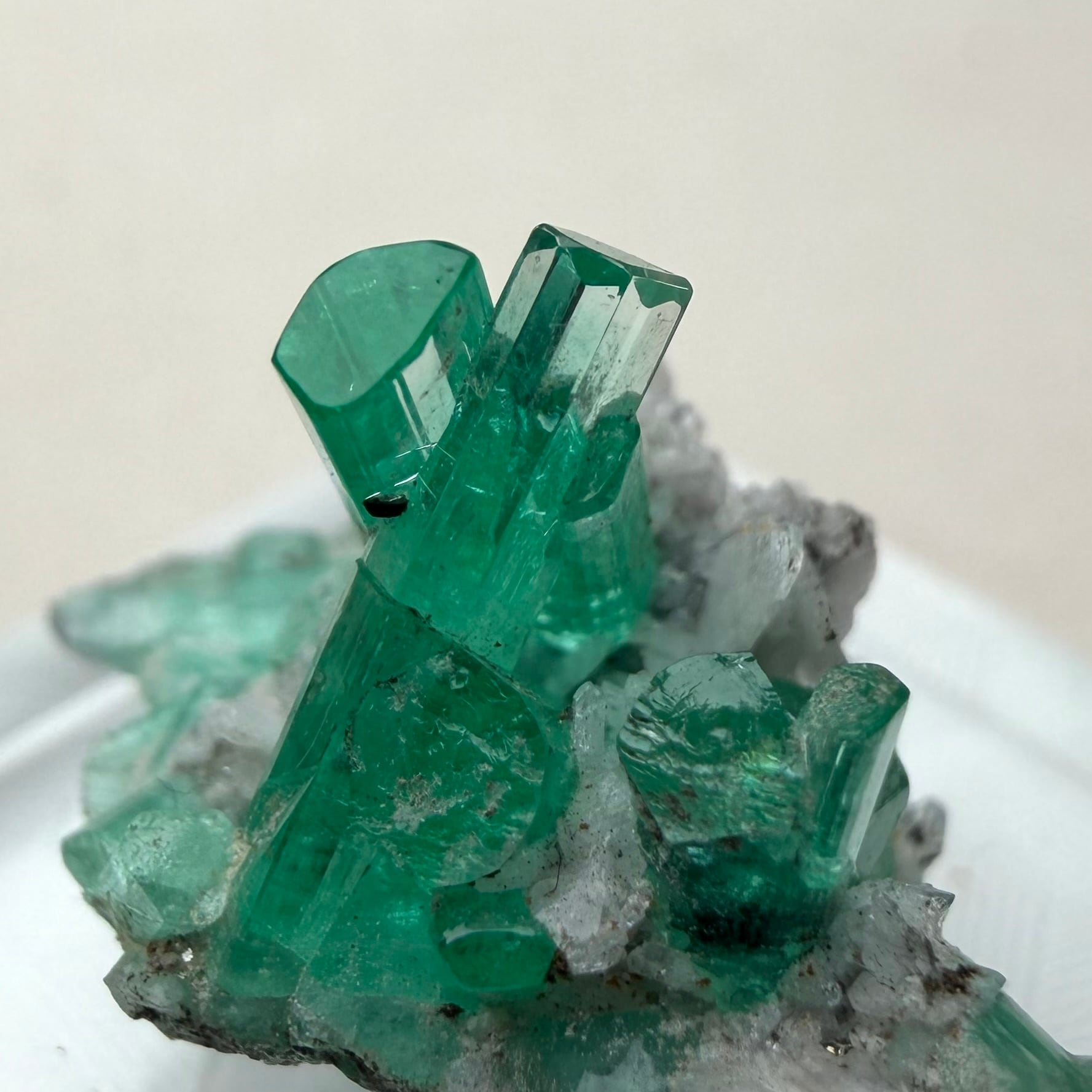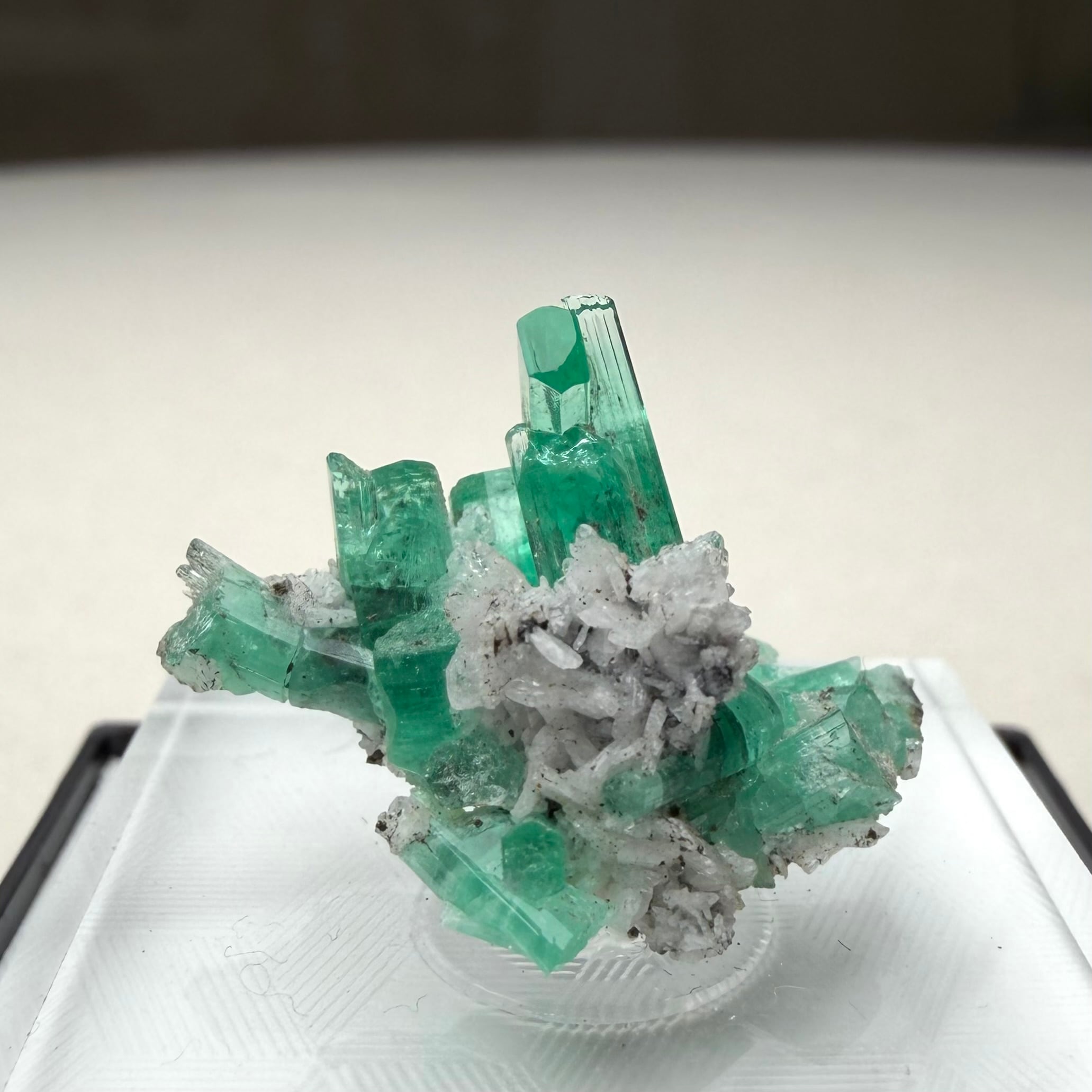 画像1枚目~からの様に色々な角度から見て魅力的な景色のため、どの角度を正面として捉えるか少し悩ましいところもありますが、メイン結晶とも言える二本のエメラルド同士がクロスする角度などは特に美しくユニークかと思います。