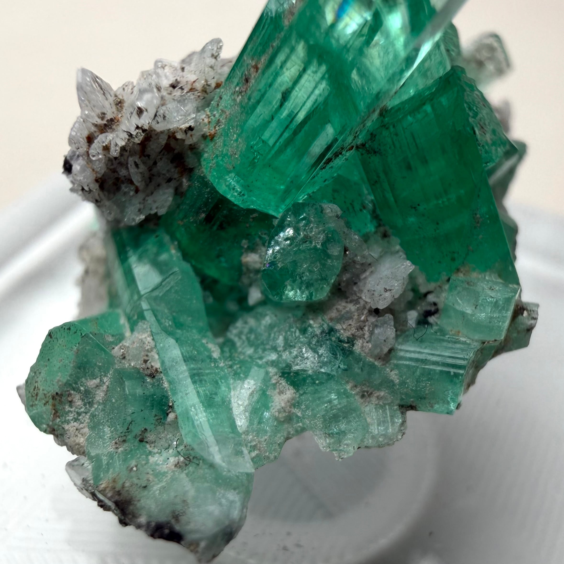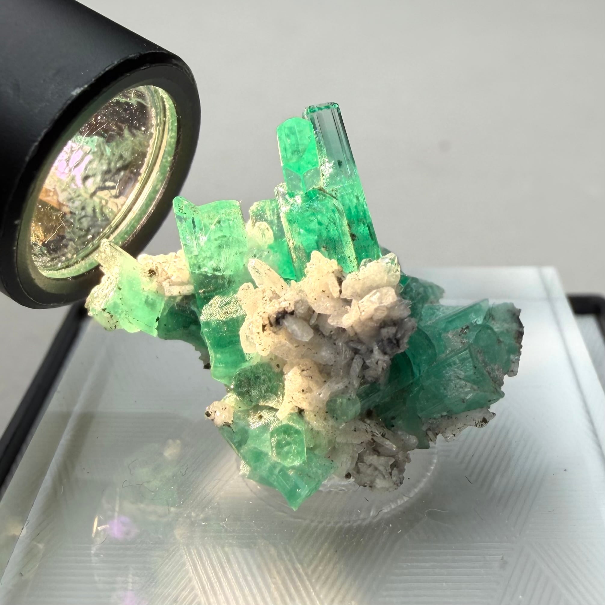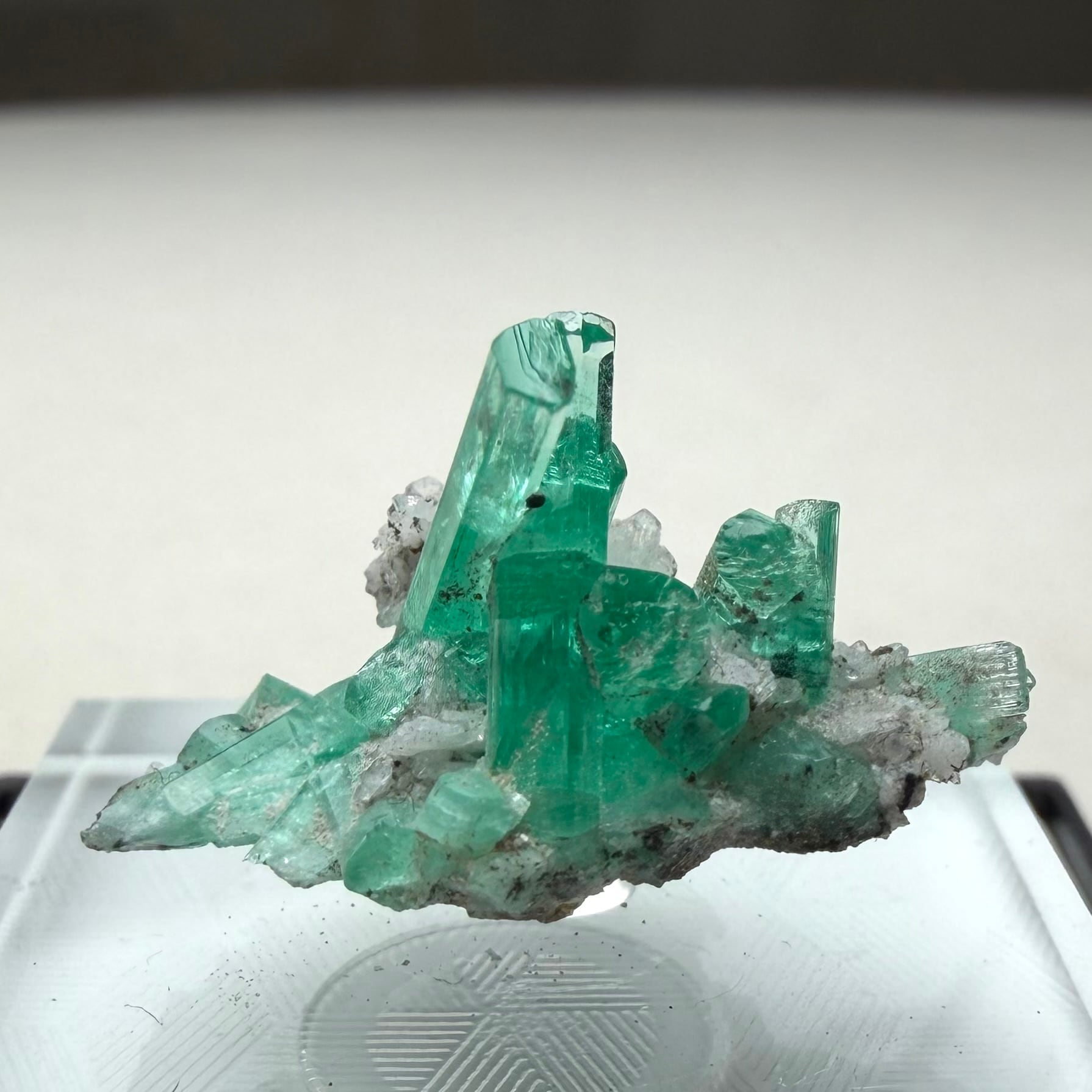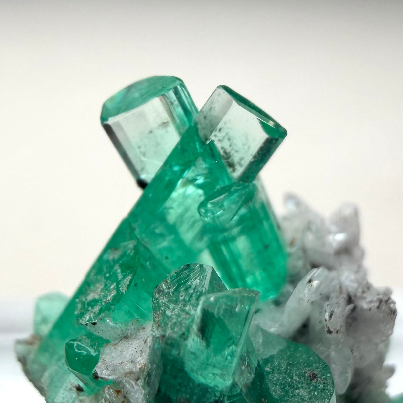 画像1枚目~からの様に色々な角度から見て魅力的な景色のため、どの角度を正面として捉えるか少し悩ましいところもありますが、メイン結晶とも言える二本のエメラルド同士がクロスする角度などは特に美しくユニークかと思います。