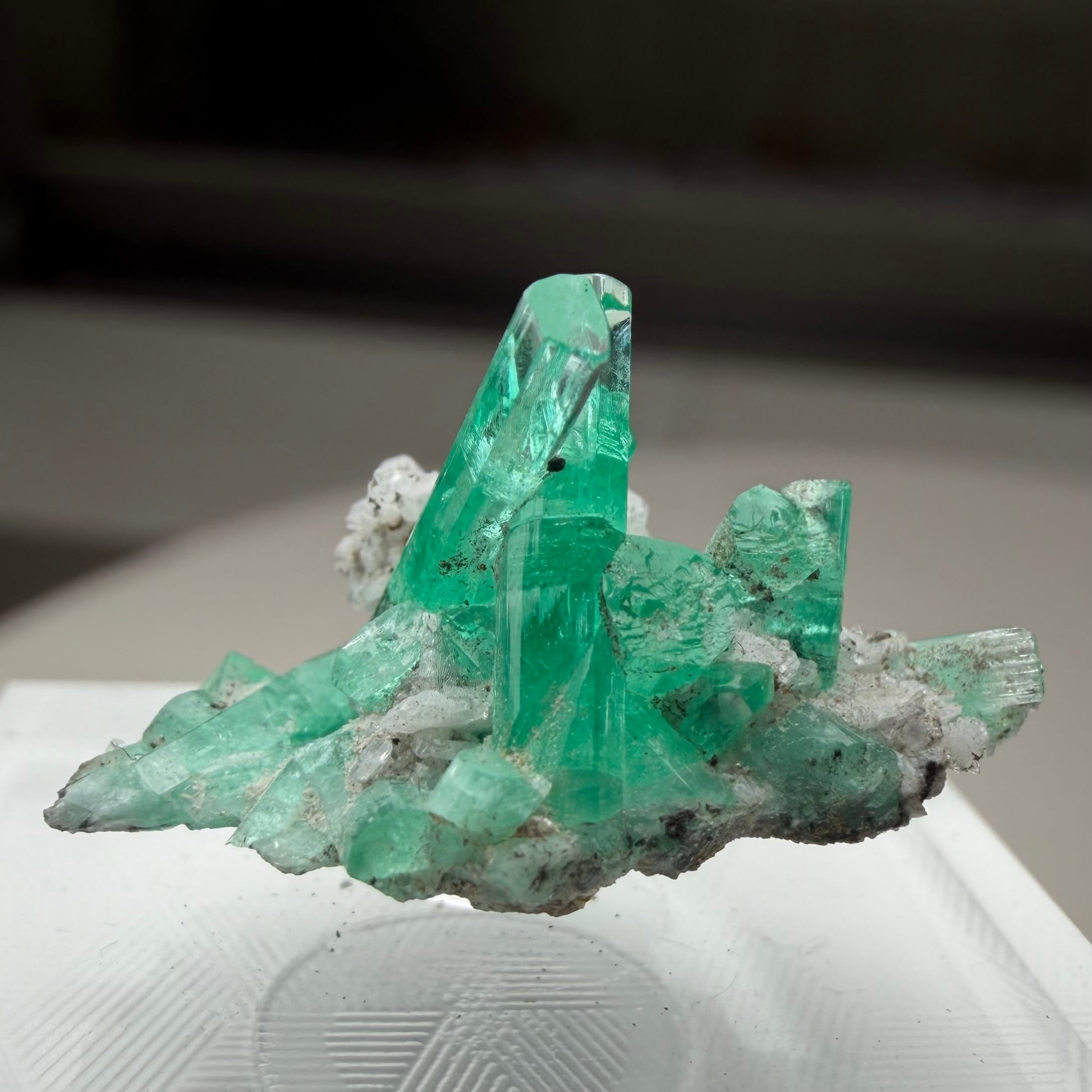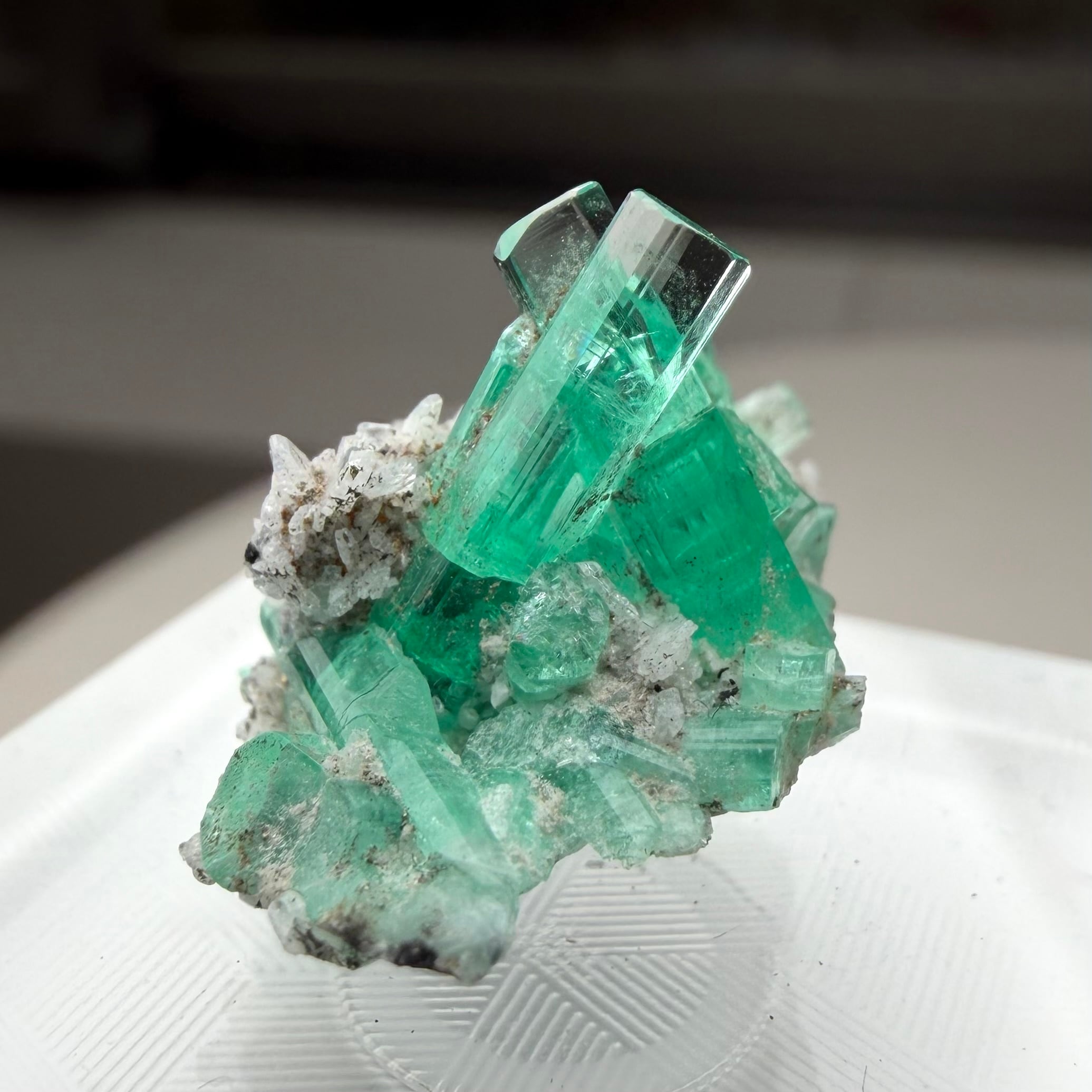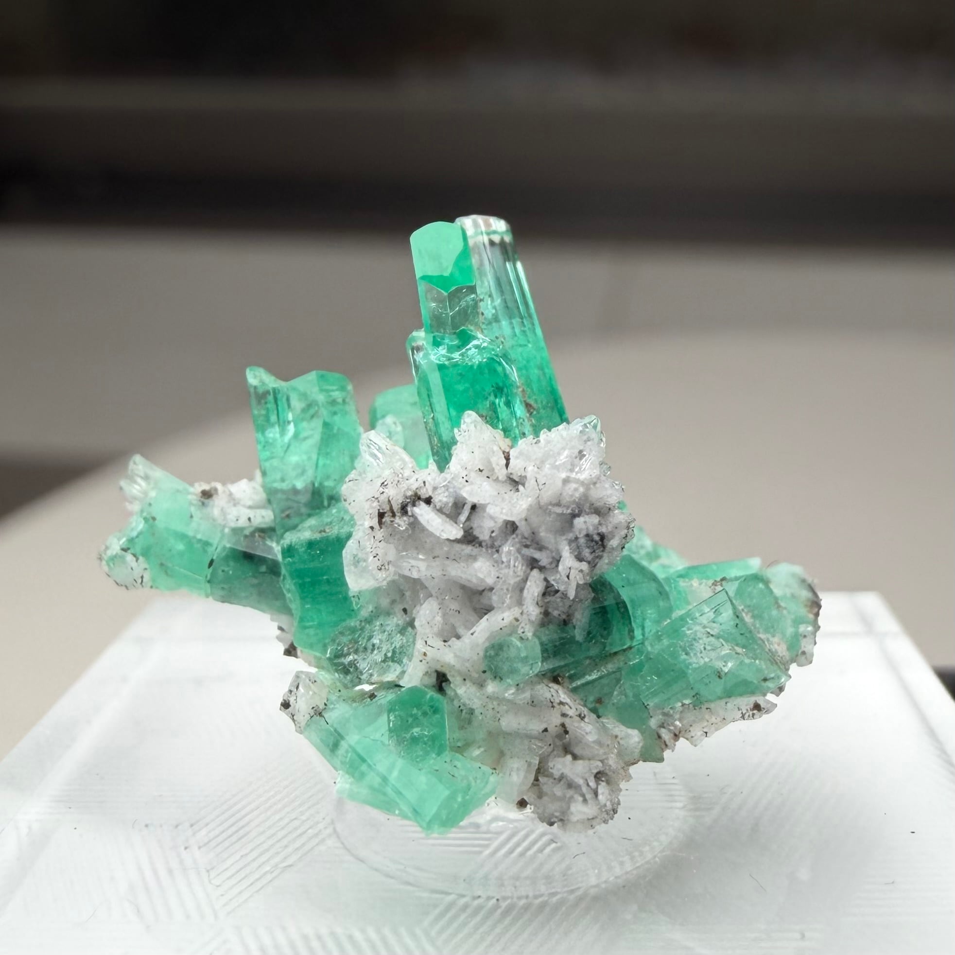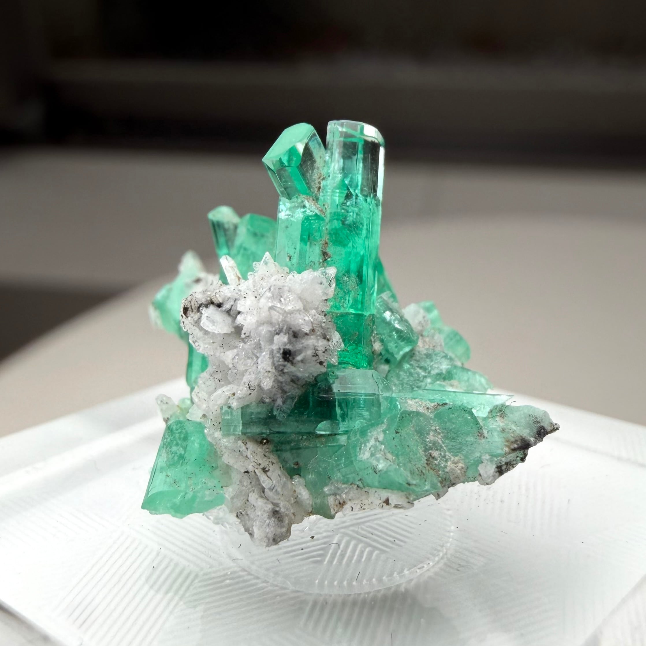 画像1枚目~からの様に色々な角度から見て魅力的な景色のため、どの角度を正面として捉えるか少し悩ましいところもありますが、メイン結晶とも言える二本のエメラルド同士がクロスする角度などは特に美しくユニークかと思います。