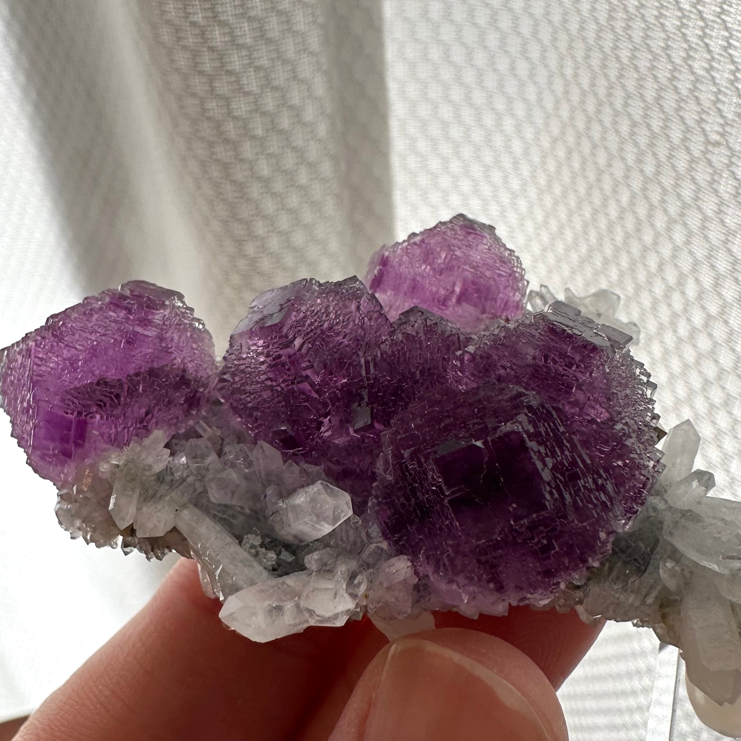 ステップ状の表面が明確に見られる結晶が幾つも連なった標本で、どちらかと言えば淡い色合いをメインとしたグリーン系統の発色がよく見られる中、これは濃淡のある美しいパープルが全体的に見られ、結晶中央付近には特に濃いパープルのファントムが見られます。