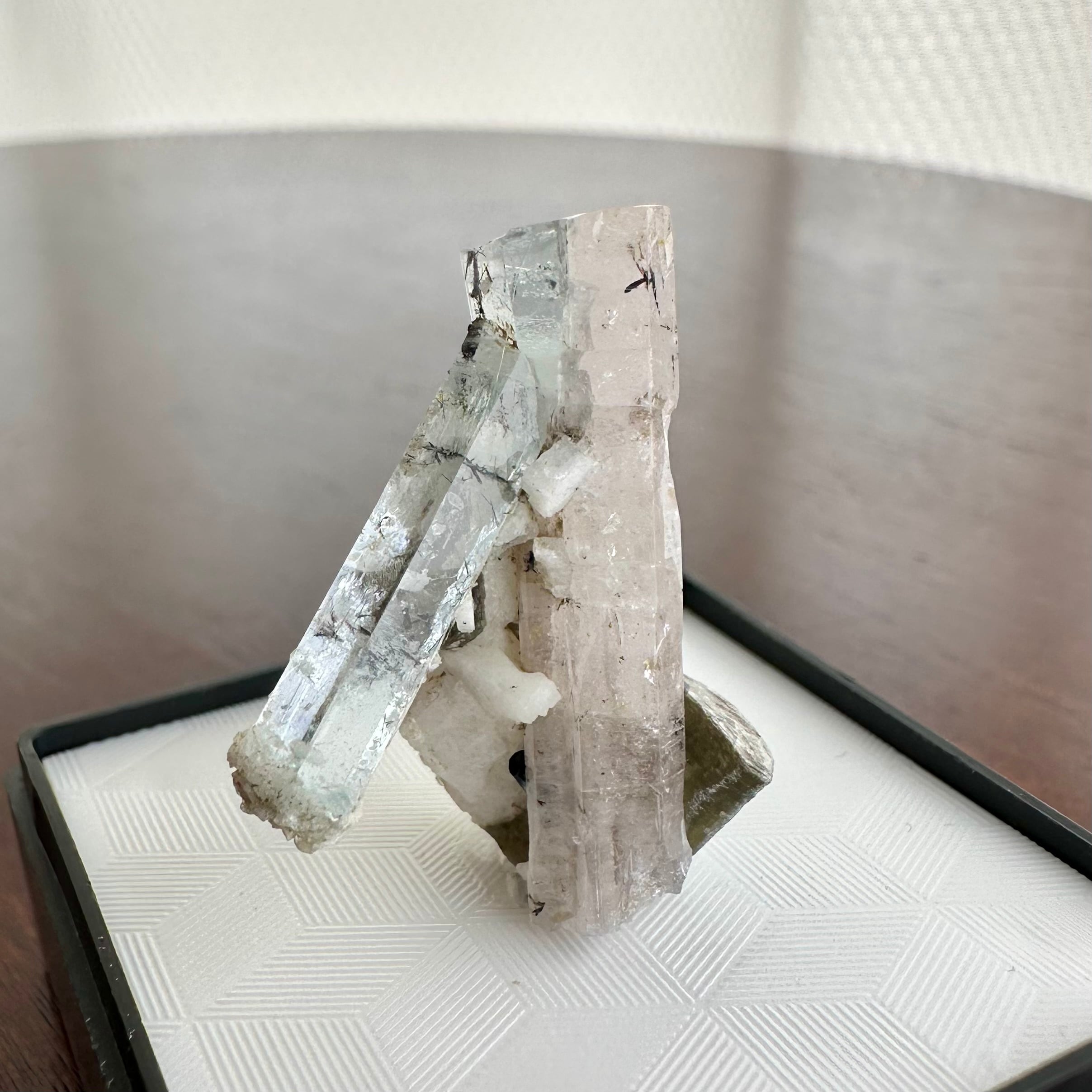 淡いピンクのアパタイトとライトブルーのアクアマリンを張り合わせた様に見えるユニークな標本で、アクアマリンは二股になった結晶も印象的です。