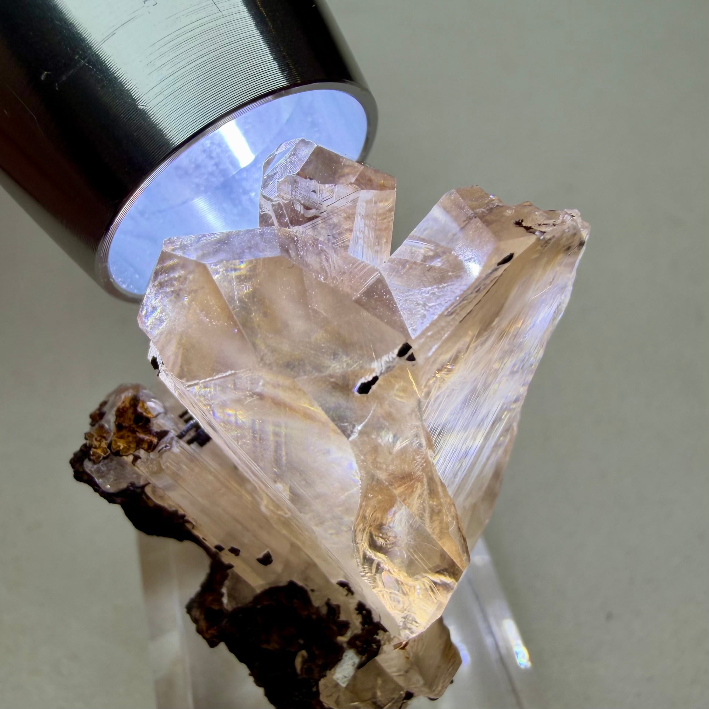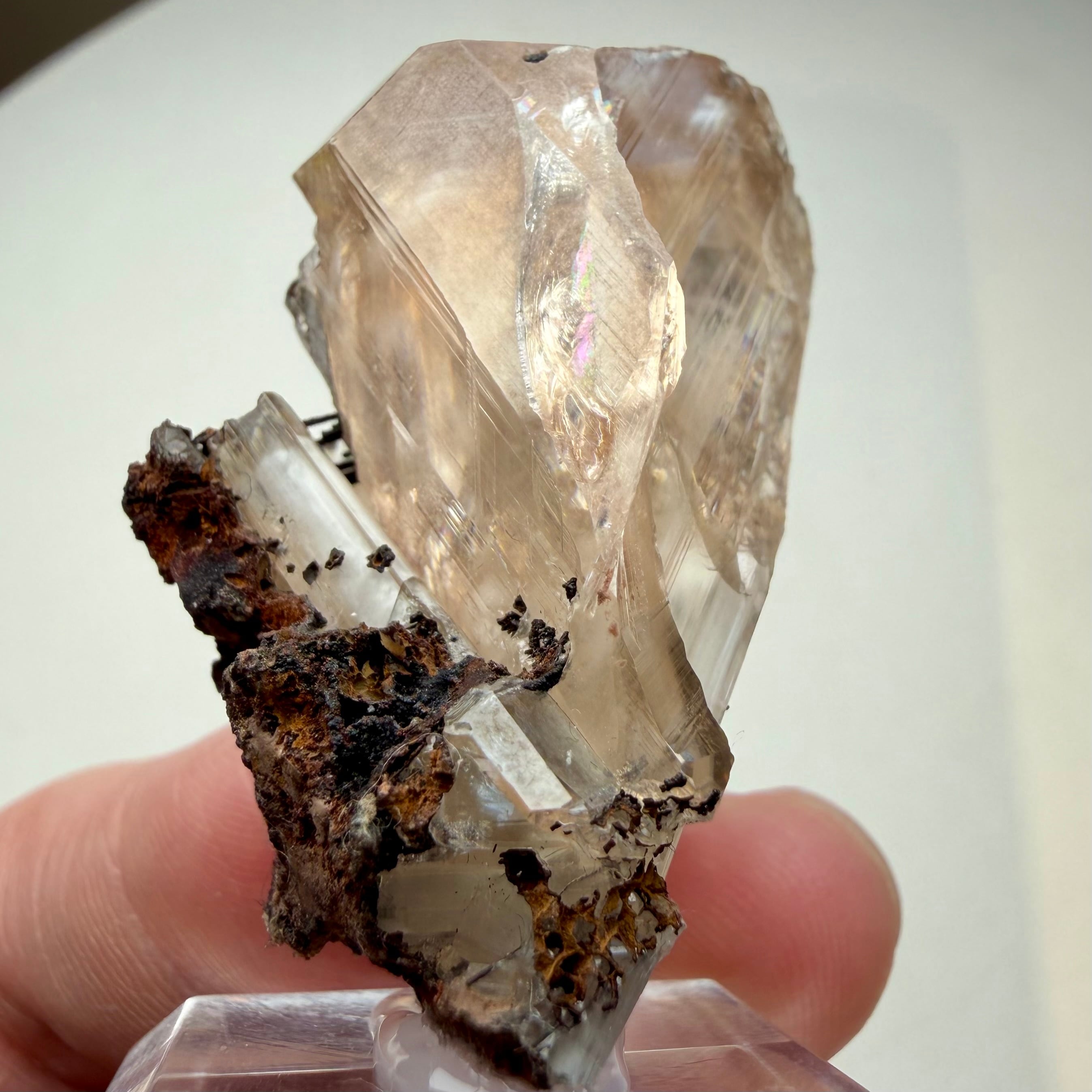 双晶の結晶が美しく整い、透明感とギラリと輝く強烈なテリ、そしてセルサイトらしい結晶から除くレインボーも見て取れる良結晶が楽しめます。
