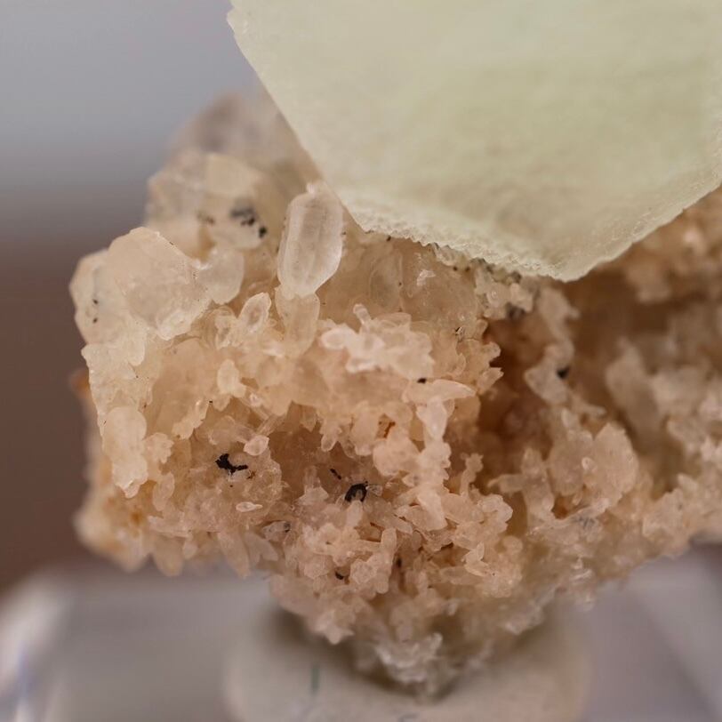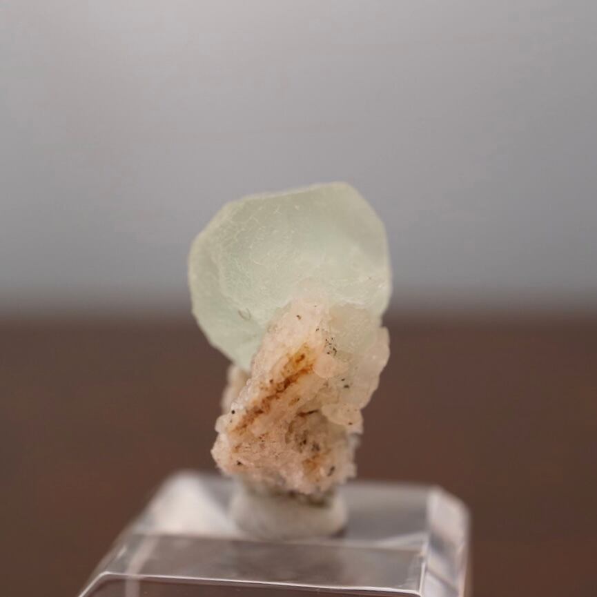 淡いアップルグリーンの結晶は透明感が残り、ユニークな球状の結晶と母岩とのバランスが魅力的な標本です。