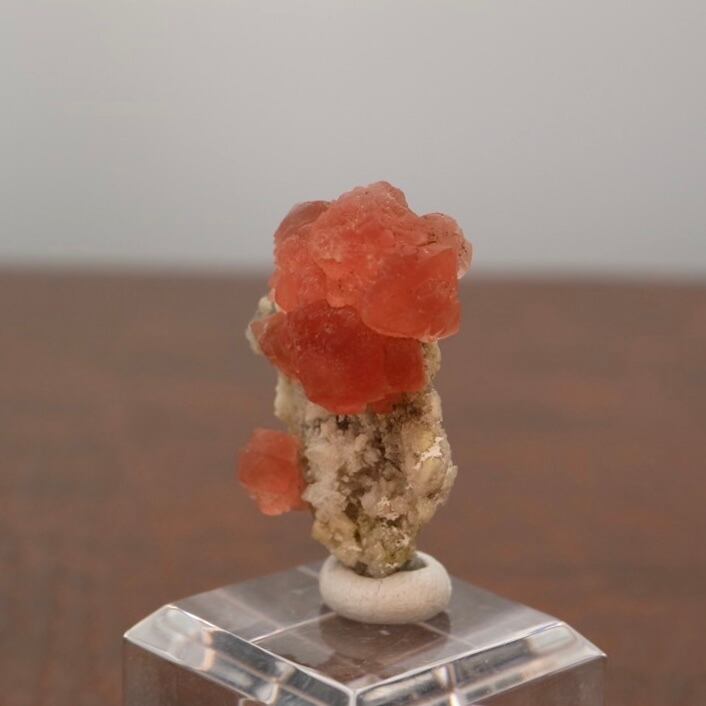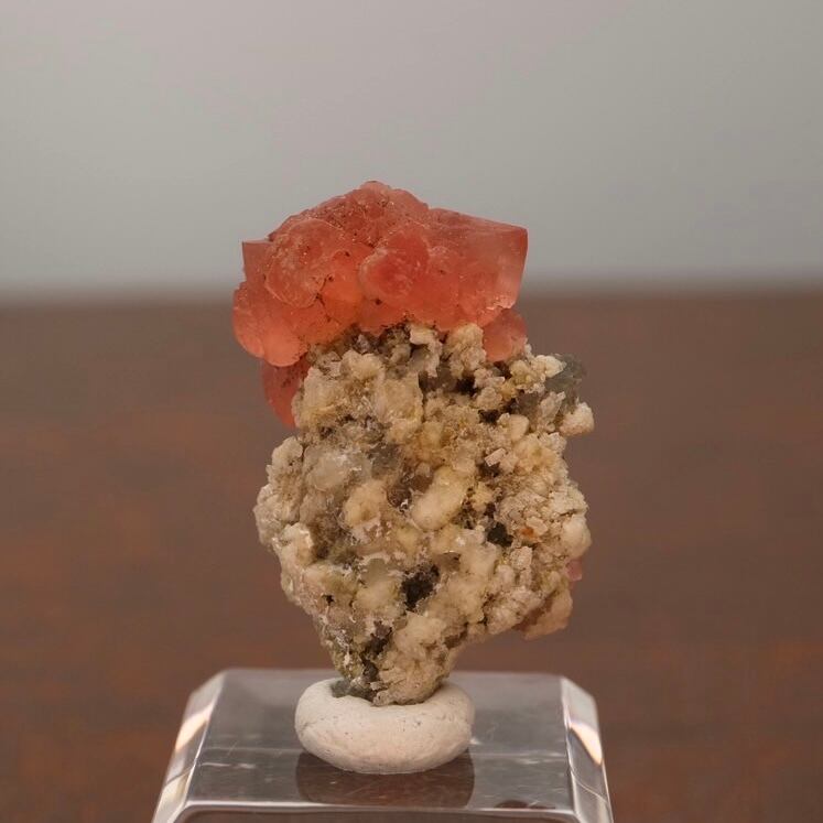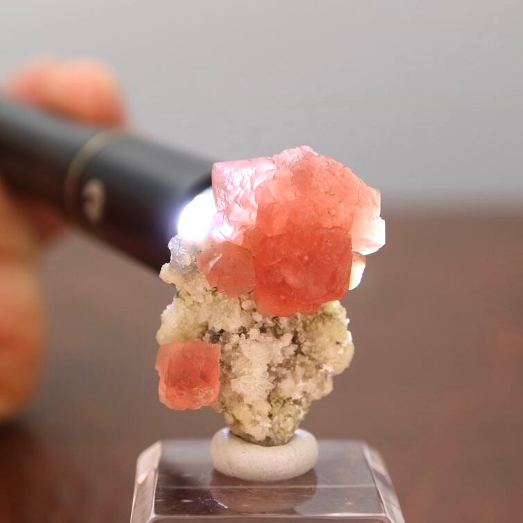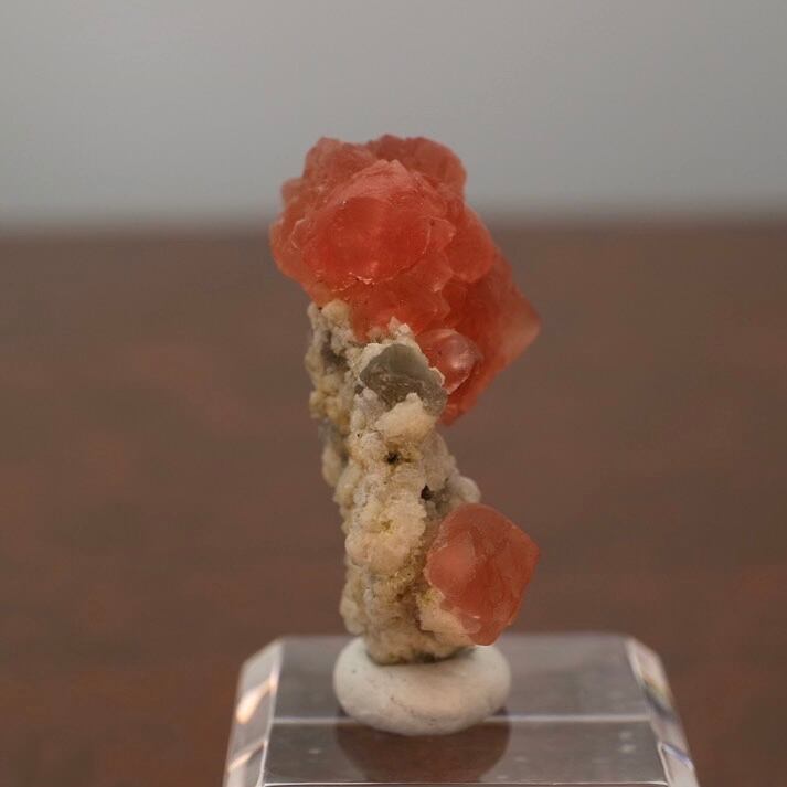 赤みがかった濃いピンクのフローライト、母岩とのバランスのせいか縦に置くと花の様な雰囲気がありますが、メイン結晶と小さい結晶とのバランスがいいため色々な角度で楽しめる標本です。