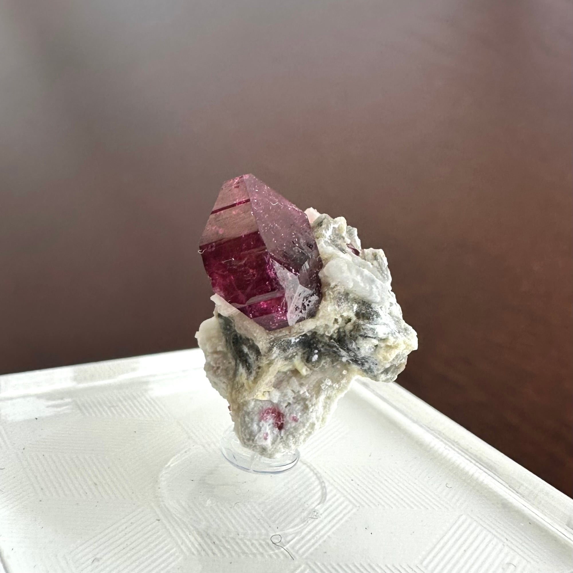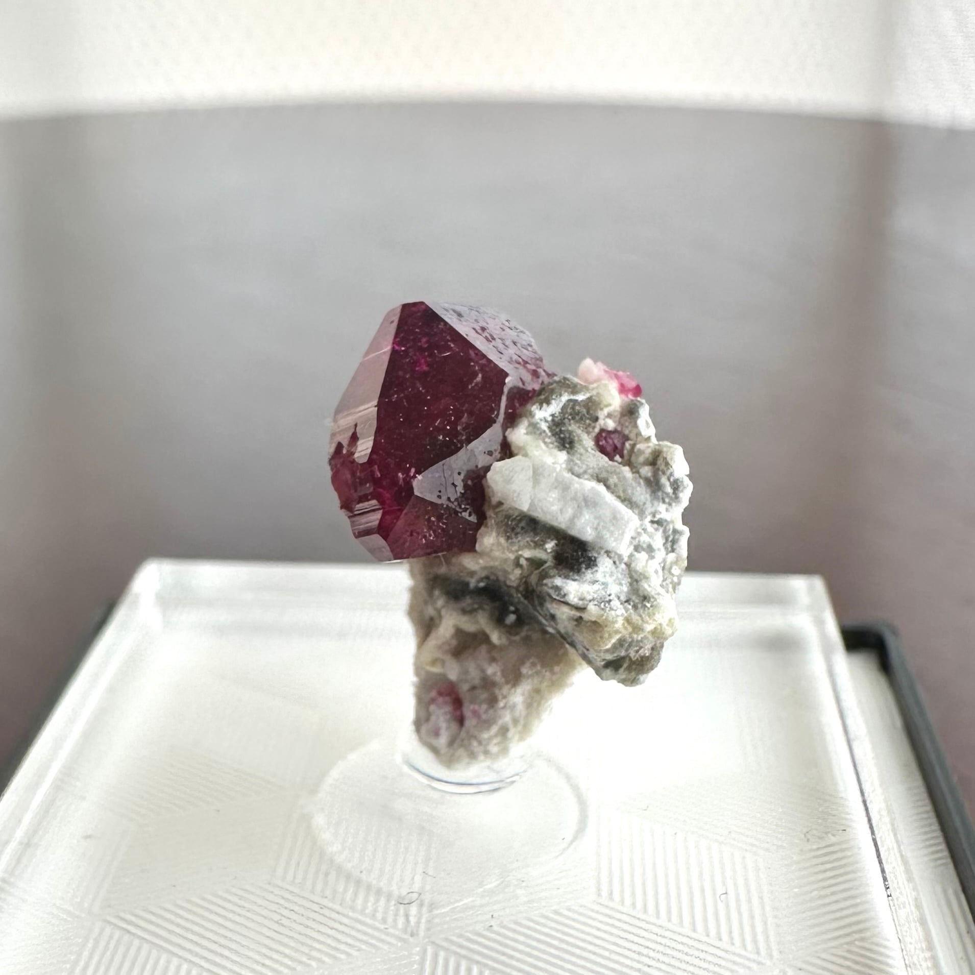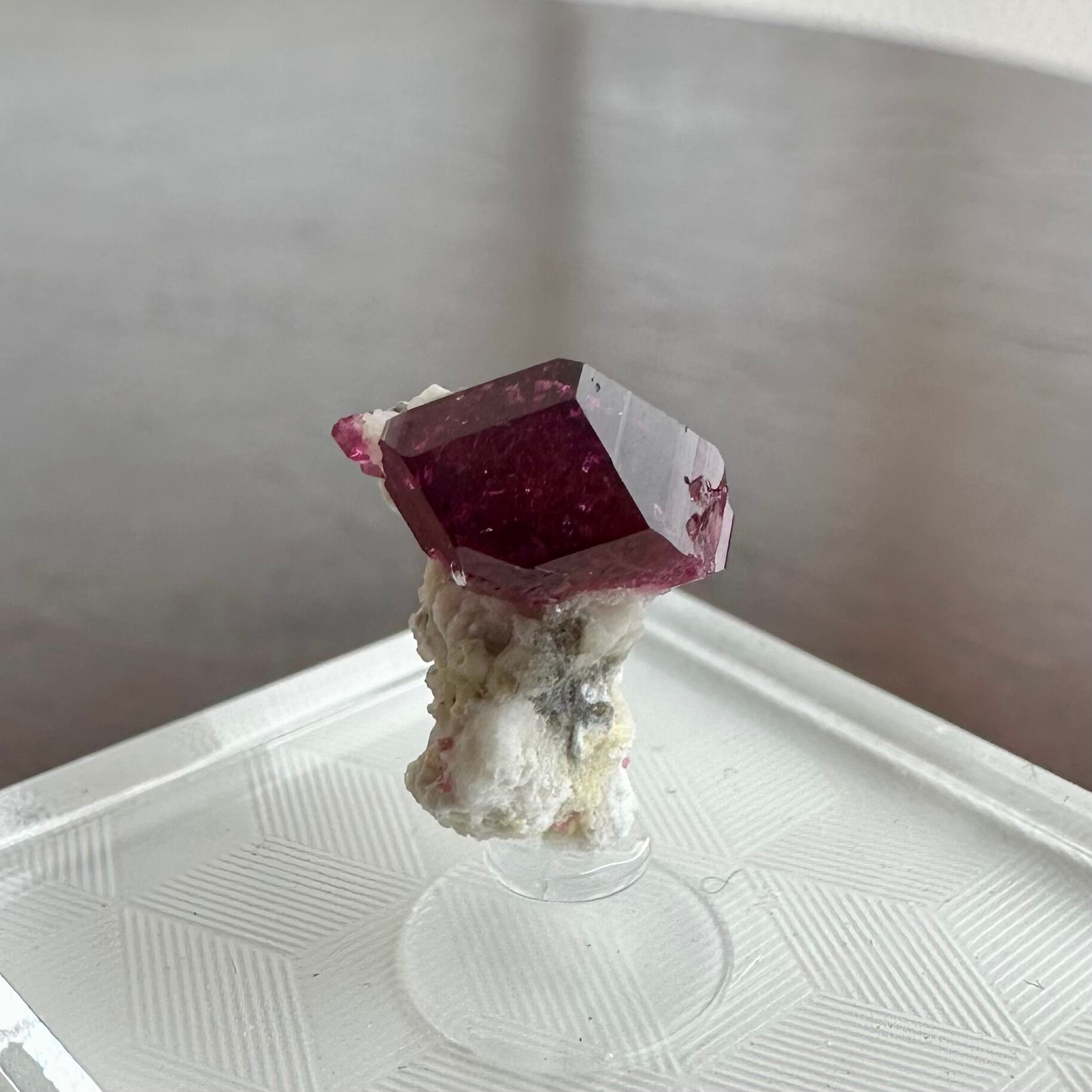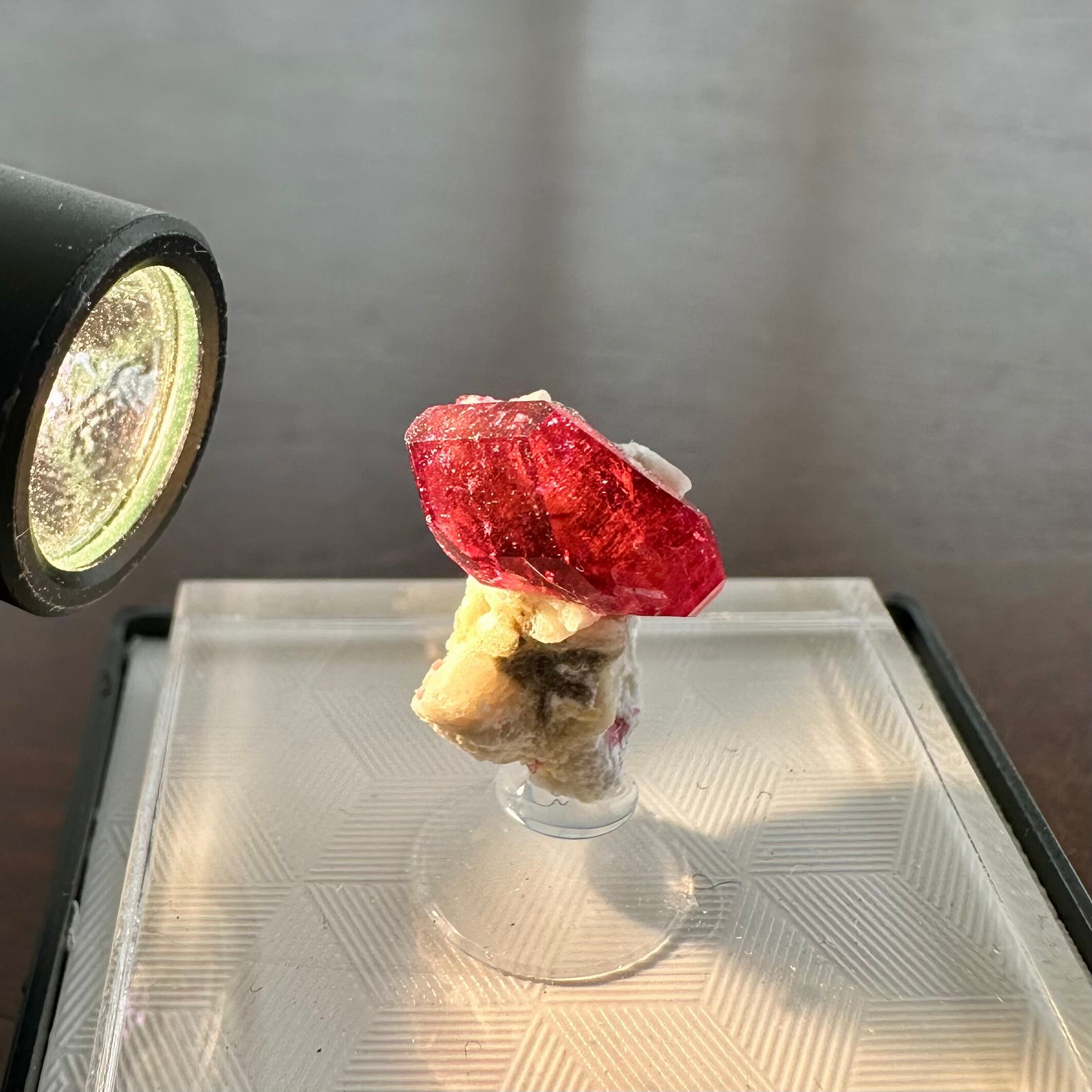 リディコータイトはユニークな形状ですがしっかりと条線も見られ、自然光下ではチェリーレッドの結晶が、透過光下ではそれに加えてオレンジレッドの発色も楽しめる美結晶です。